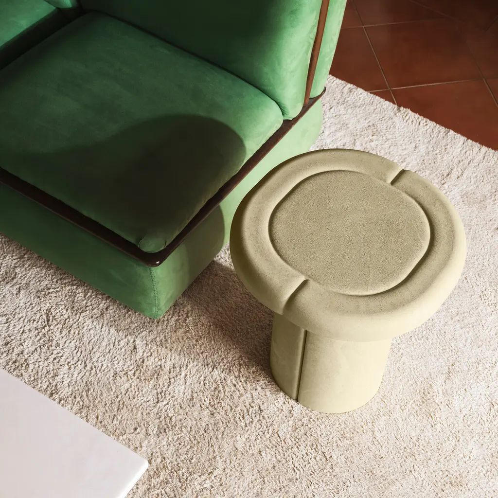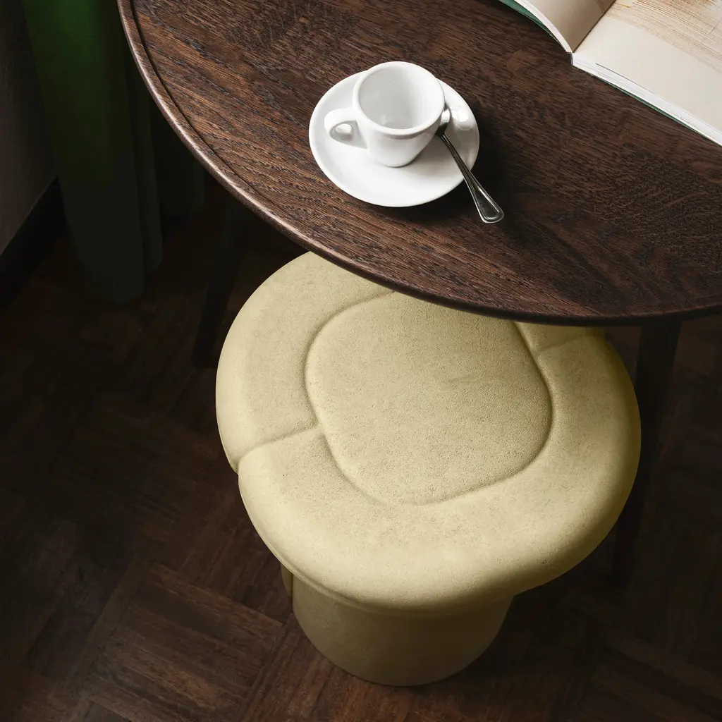 Patricia Urquiola’s Alder Stool feels as though it’s fresh from the forest floor yet shaped by a deft, modern hand. The seat and legs are formed from Matek®, Mater’s own biodegradable composite made of recycled plant fibres bound into a smooth, stone-like mass that will eventually return to the earth. A slight dip at the centre cues an easy perch, while tapering legs push gently outward for steady footing without visual heft. Urquiola keeps the silhouette calm—no braces, no ornament—so the material’s speckled grain takes the spotlight in four grounded tones: sand, clay, moss, and charcoal. Slide one beside a low bookcase, pair two under a hallway console, or use a cluster around an impromptu drinks table; the stools stack neatly when space runs short and weather daily use with little more than a wipe-down. Timeless shape, circular-economy core—proof that eco-minded furniture can stand confidently on its own three legs.