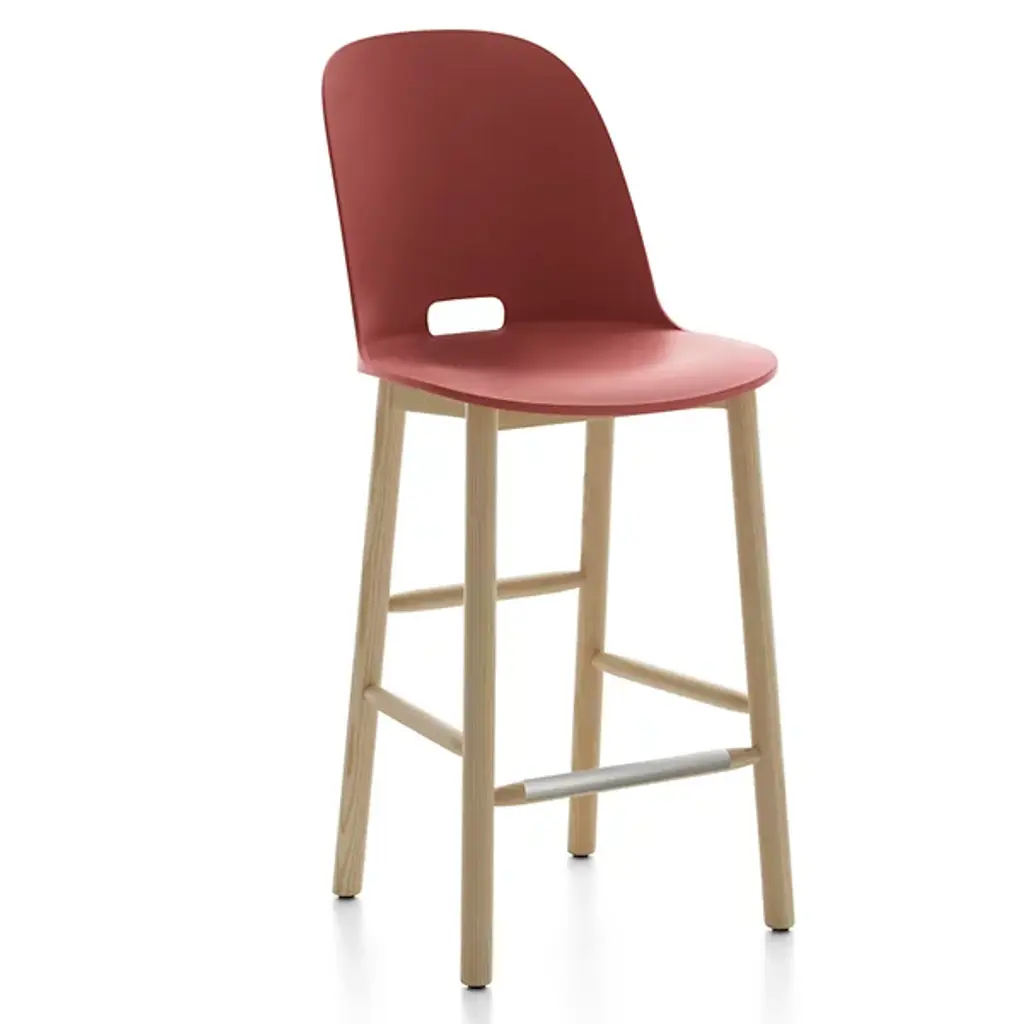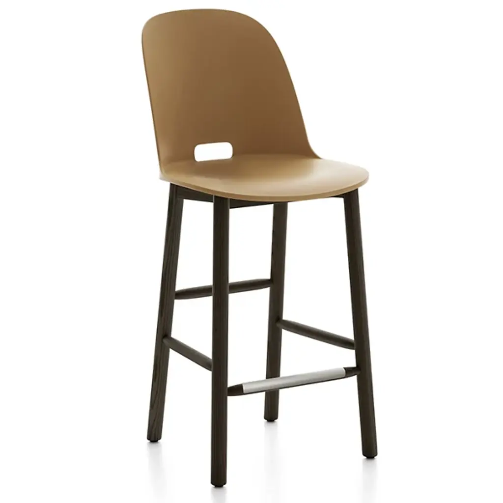 A tall, elegant, and ultra-refined take on the Parisian brasserie chair. In the Alfi Stool High Back with Alfi Soft Slip Cover from Emeco, designer Jasper Morisson seeks to show that what’s not seen is as important as what is seen. Morrison’s “super normal” approach to design strips away clutter, leaving you with a piece that’s clear in what does and how it does it. In this stool, Morrison boils down the traditionally ornamented woven cane seat and backrests of brasserie chairs into a single shaped seat defined by clean curves and a tall back. While comfortable on its own, the sustainably crafted seat gets a cozy and tailored upgrade with the included slipcover. This cover is retrofittable and removable, giving you a naturally upholstered look whenever required. A reclaimed wood base lifts your seat in a solid, graphic construction. The classic combination of textured grain and organic hues makes the seat a true standout visual feature.