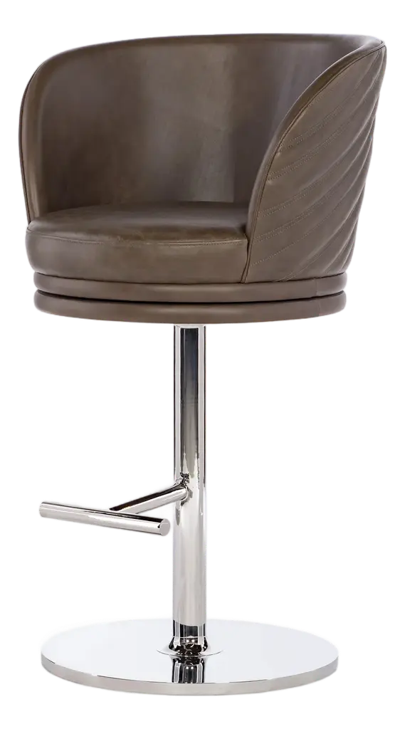 An iconic design by Richard Hutten, this stool is named after Batman's butler, Alfred. Distinguished by a sophisticated aesthetic, inspired by Hollywood's glamorous and luxurious ambiance, it is upholstered with first-rate beige leather on the seat and backrest. The structure is made of chromed aluminum, merging contemporary and classic styles. Also available in a Hillary version, named after Lara Croft's butler. Please consult the Artemest catalog for further details.