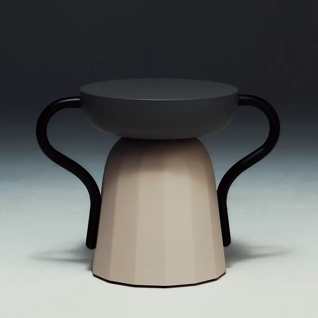 Allié is a two-in-one design, both a stool and an occasional table condensed into a small object with a ton of character. A totem of bold aesthetic, hands resting firmly on its hips. Entirely moulded in polyurethane foam, the base and the top are linked together by two metal handles, delivering a robust structure that is also easier to move around. The matt material contrasts with the metal finish of the handles, while the contemporary palette of colours underscores a fun and playful spirit.