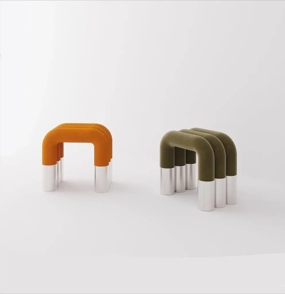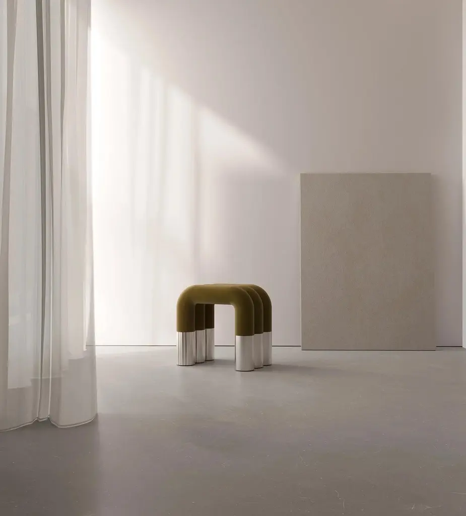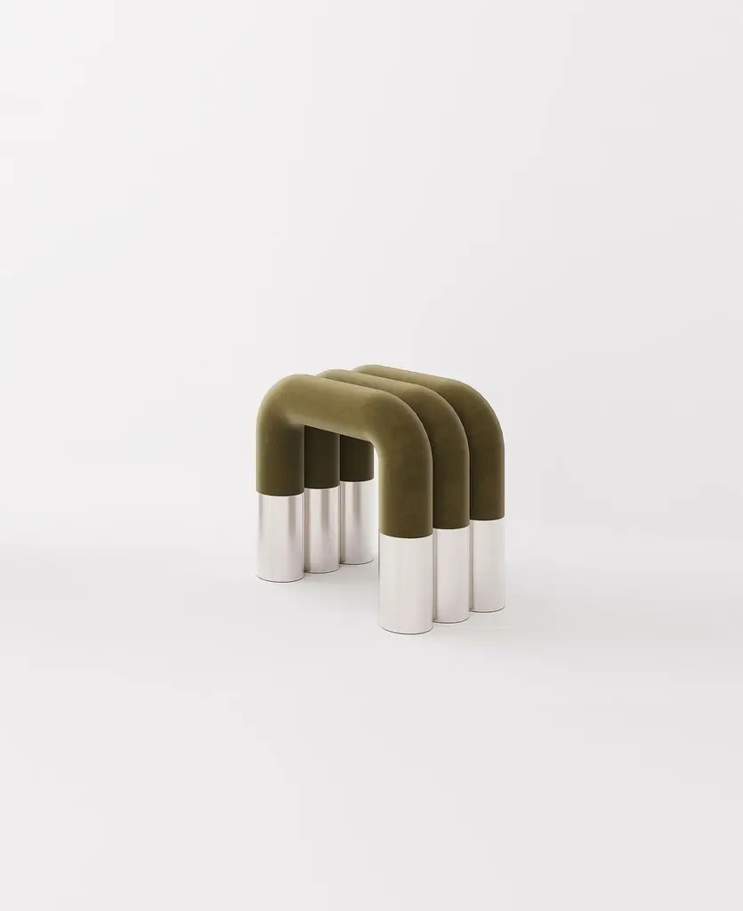 Designed By Joana TeixeiraThe Amadeo Stool by Joana Teixeira, a piece that embodies the spirit of the avant-garde traveler. This distinctive stool is a journey in design, featuring three elegantly curved cylindrical tubes that form its unique silhouette.Each tube is sumptuously upholstered in luxurious velvet, offering a soft, inviting texture that beautifully contrasts with the sleek, satin metal legs. Amadeo is more than just a stool; it's a statement piece that blends modern sophistication with artistic flair. Perfect for those who dare to explore new horizons in interior design, the Amadeo Stool brings a touch of sophistication and comfort to any contemporary space.Materials: Beech Wood / Stainless Steel / Velvet.