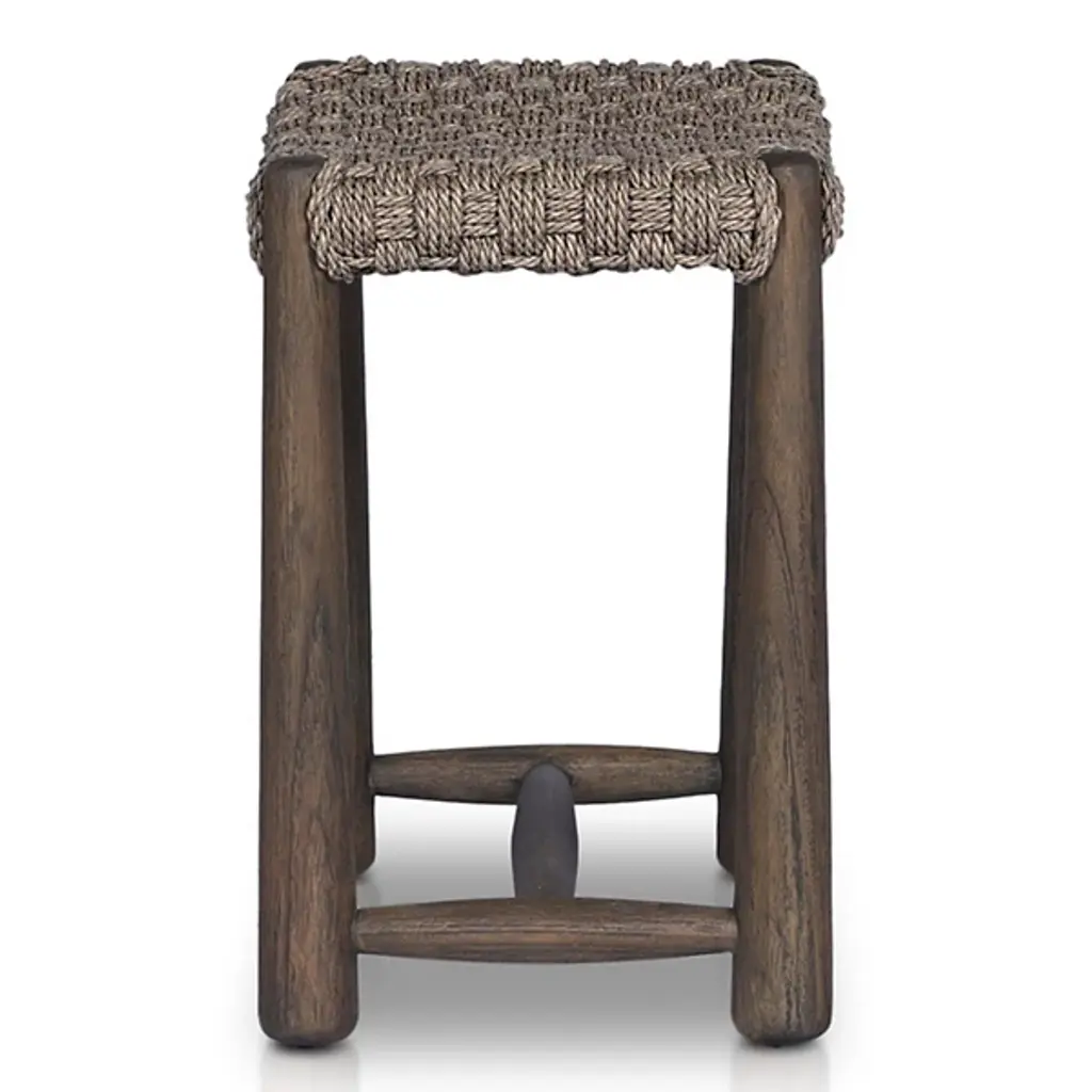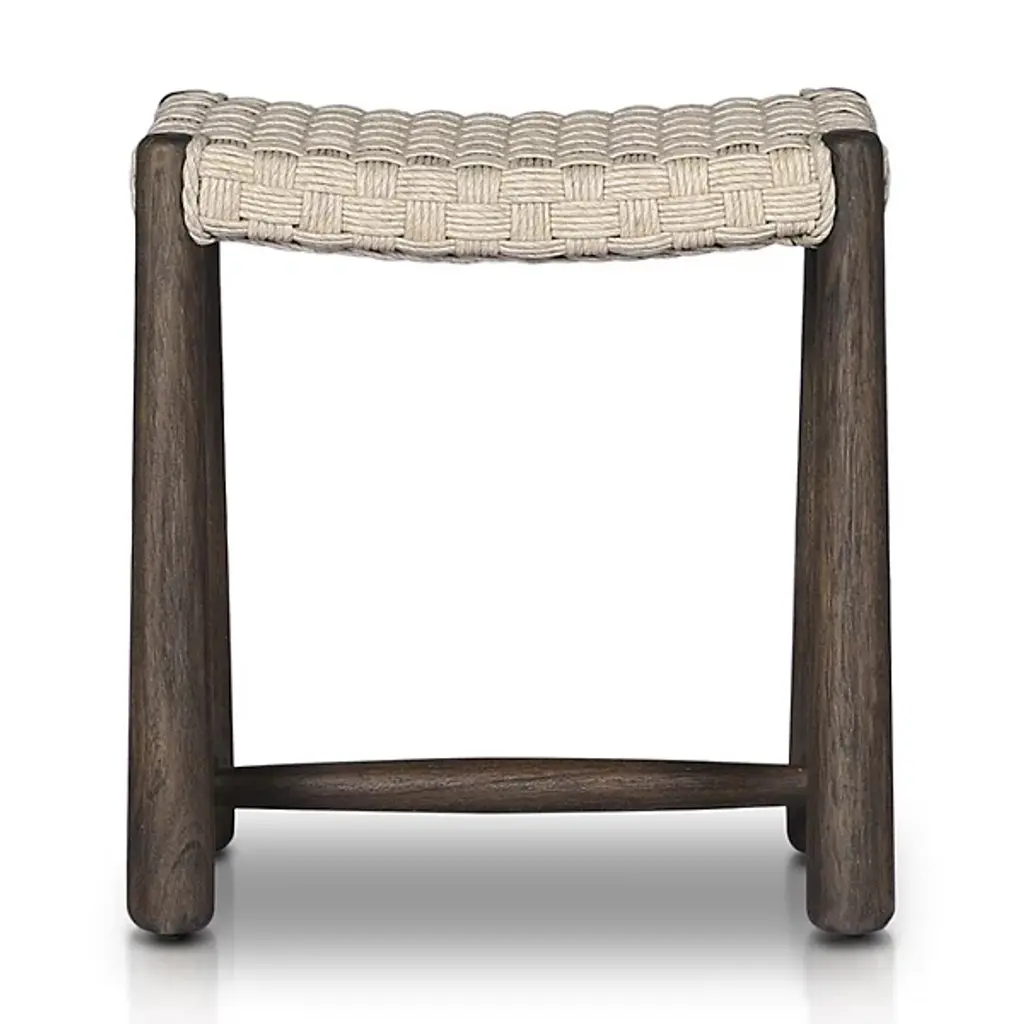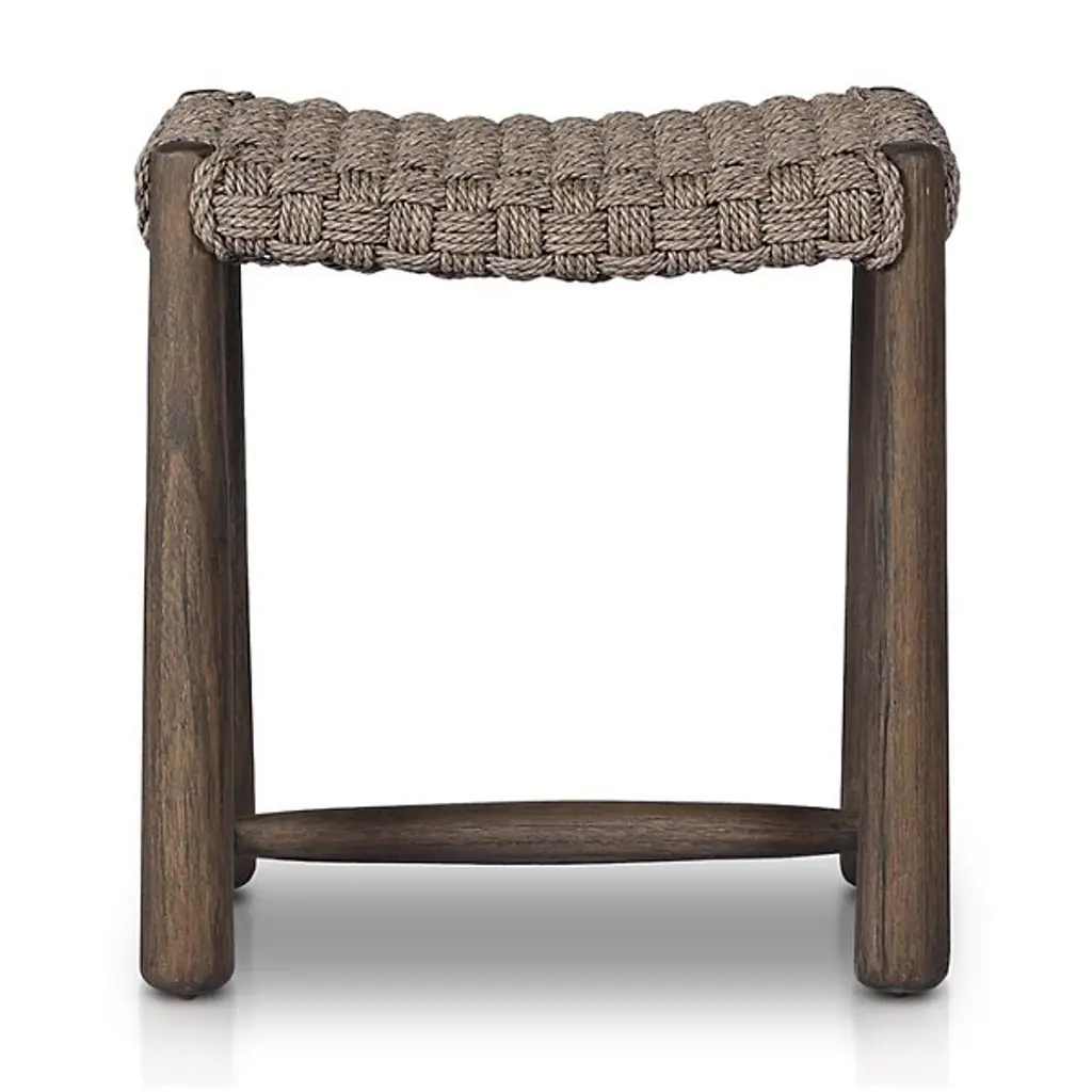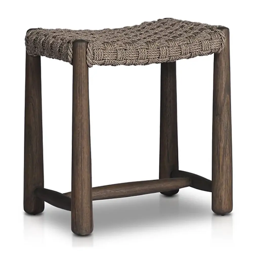 The Amber Lewis x Four Hands Savio Outdoor Stool from Four Hands exudes subtle coastal style. Its telescoping legs, crafted from solid teak, narrow as they rise to a woven seat crafted from 100% polyethylene weave, designed to withstand changes in temperature and humidity, with the woodwork developing a beautiful silvery patina over time. Combining functionality with contemporary aesthetics, it adds a welcome modern elegance to any outdoor setting, making it the perfect stylish addition to sophisticated spaces.