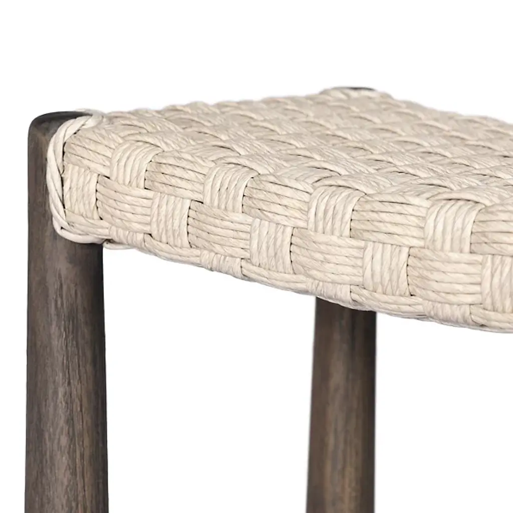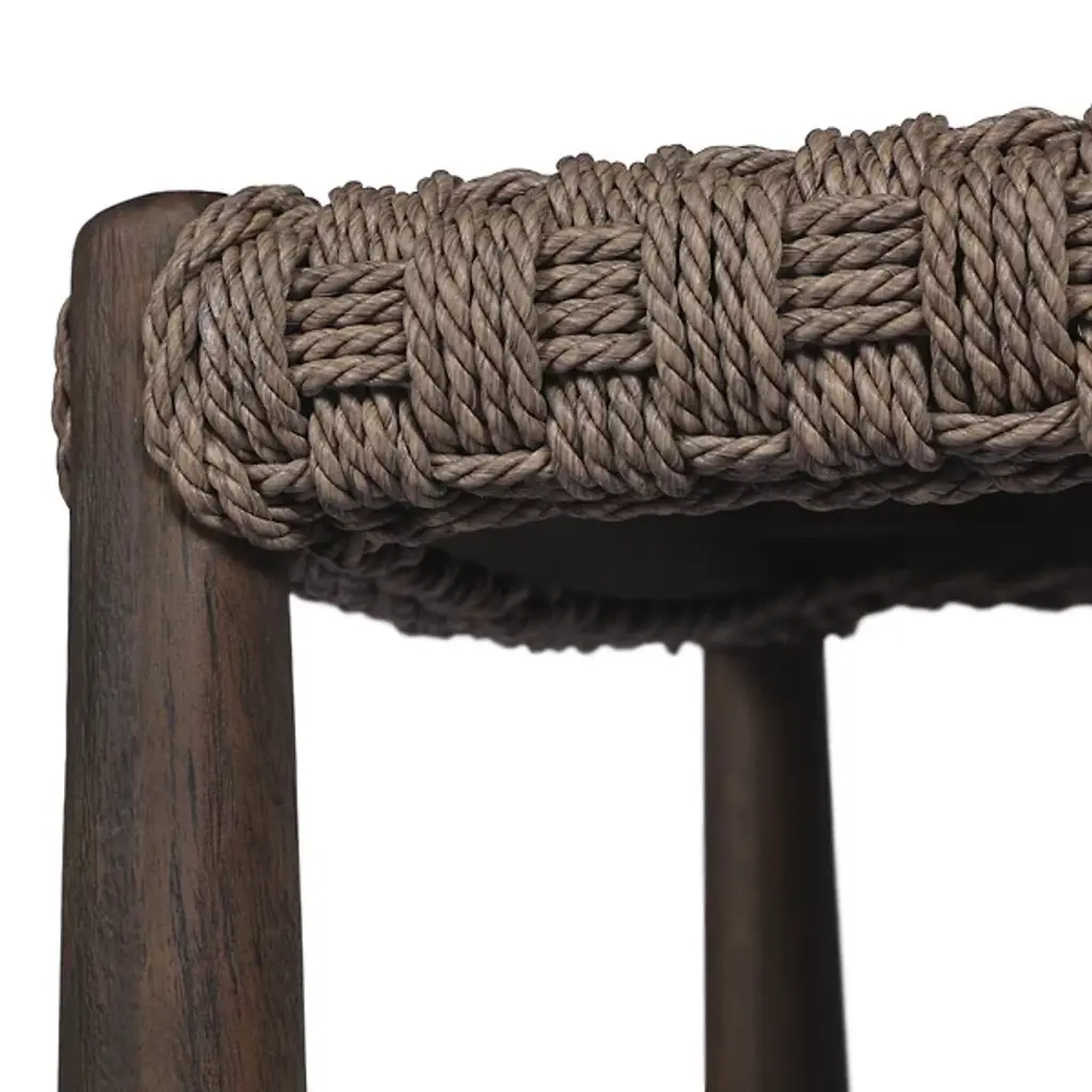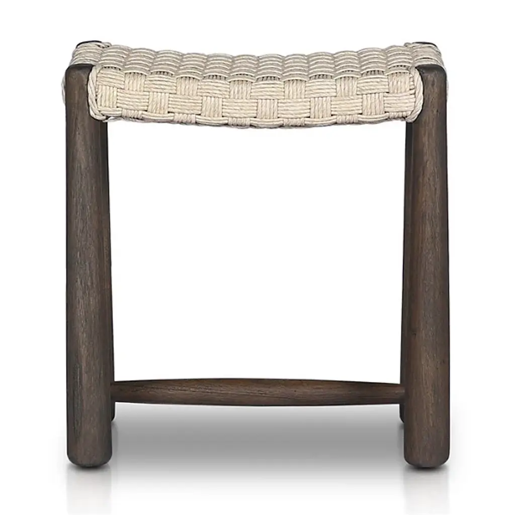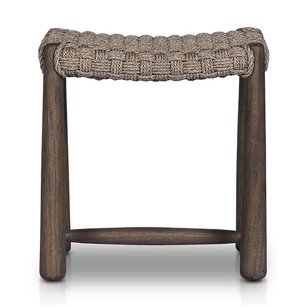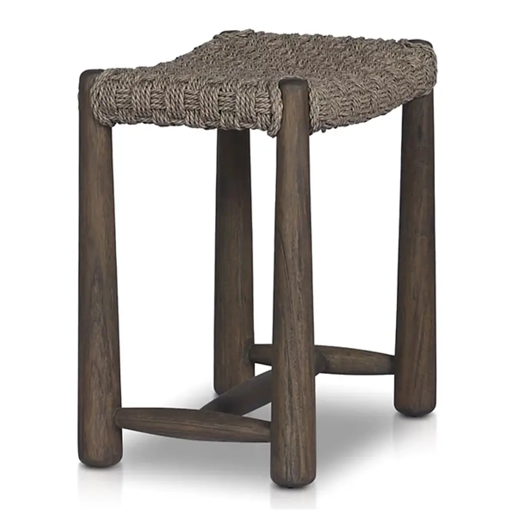 The Amber Lewis x Four Hands Savio Outdoor Stool from Four Hands exudes subtle coastal style. Its telescoping legs, crafted from solid teak, narrow as they rise to a woven seat crafted from 100% polyethylene weave, designed to withstand changes in temperature and humidity, with the woodwork developing a beautiful silvery patina over time. Combining functionality with contemporary aesthetics, it adds a welcome modern elegance to any outdoor setting, making it the perfect stylish addition to sophisticated spaces.