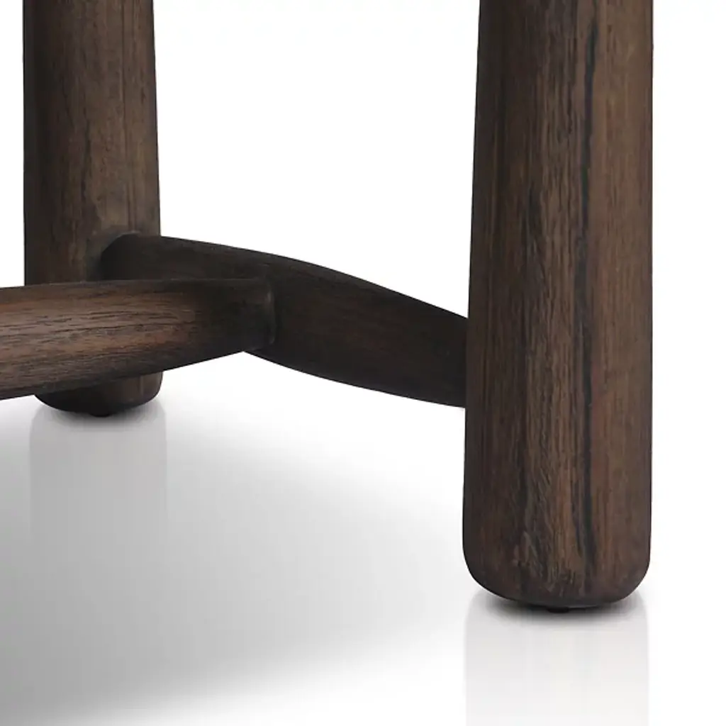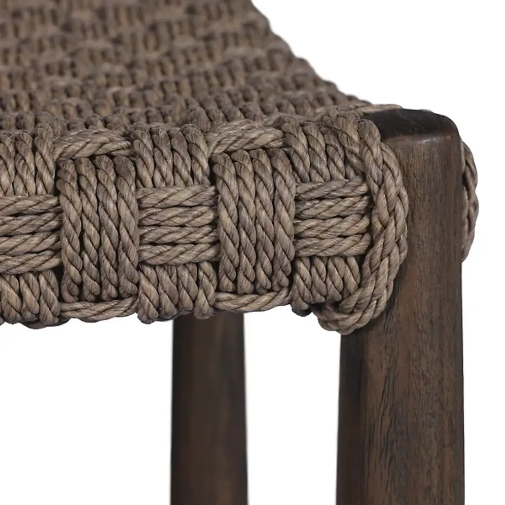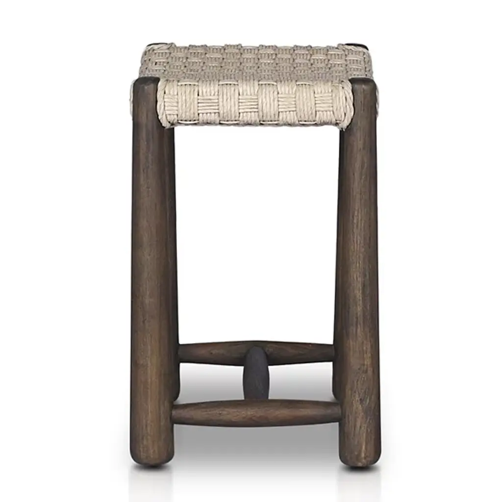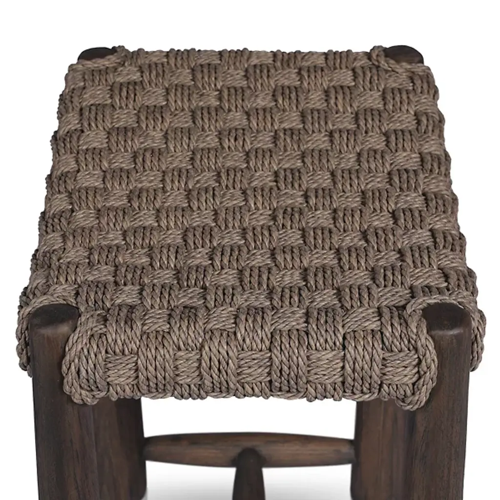 The Amber Lewis x Four Hands Savio Outdoor Stool from Four Hands exudes subtle coastal style. Its telescoping legs, crafted from solid teak, narrow as they rise to a woven seat crafted from 100% polyethylene weave, designed to withstand changes in temperature and humidity, with the woodwork developing a beautiful silvery patina over time. Combining functionality with contemporary aesthetics, it adds a welcome modern elegance to any outdoor setting, making it the perfect stylish addition to sophisticated spaces.