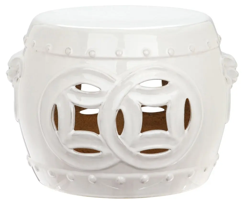 A double-coin cutout motif adds a rich, artistic flair to this glazed ceramic stool, which can easily double as an occasional table or a plant stand.