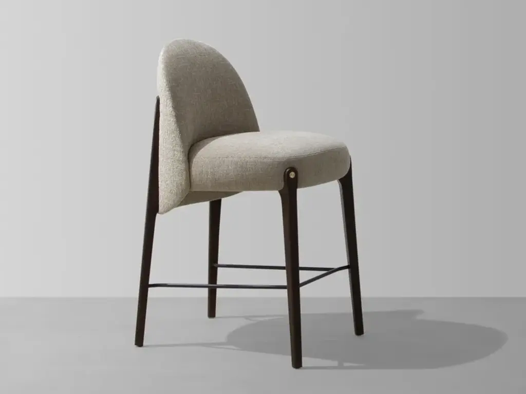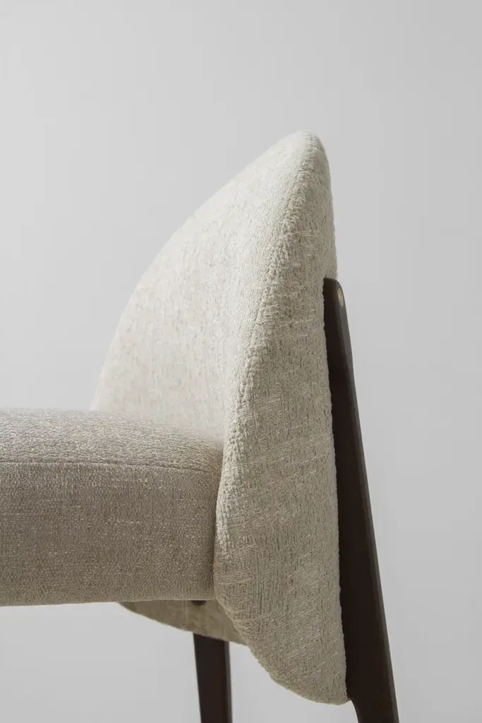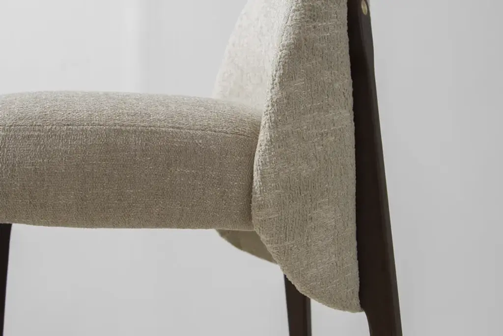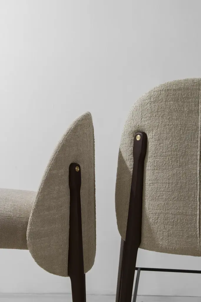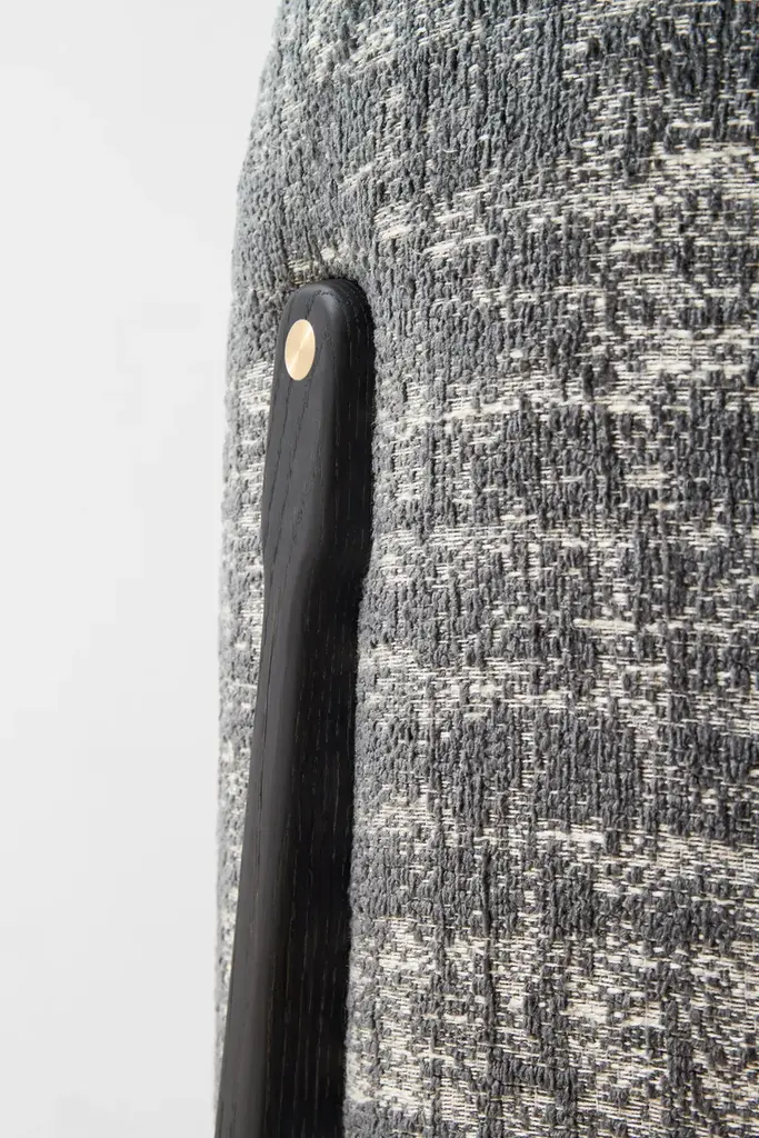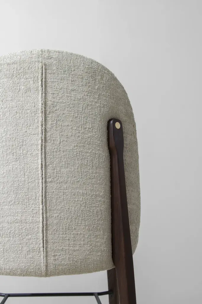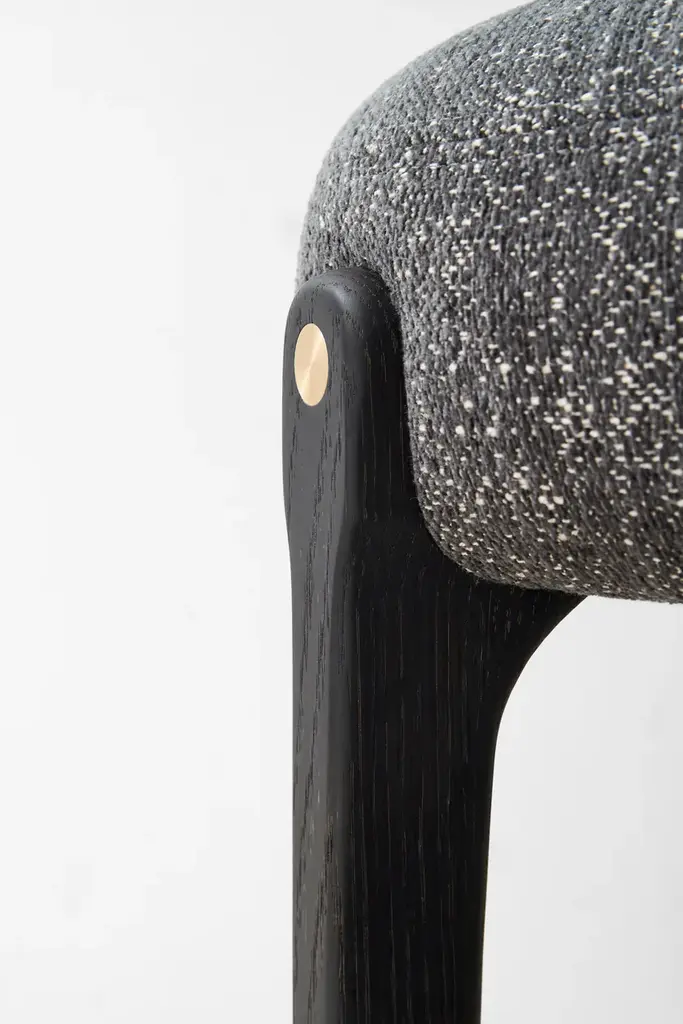 Designed with inspiration from the shape of a spade, the Ames chair features a smoked oak frame and a premium fabric cushion, designed to offer comfort while retaining our signature modern industrial finish.Ames is a collection of bar, counter and dining chairs. Laid-back, almost egg-like in shape, and fanning out towards the seating cushion on both sides, the design’s backrest is constructed from oak then fully upholstered in fabric or leather. In place of hidden joints, the chairs’ tapered oak legs are extended upwards onto seating cushions and backrests, affixed with brass details that gently call to mind District Eight’s signature combination of our favorite materials. Also featuring ensconcing armrests in other variations, the Ames collection can inspire a quiet sense of warmth and elegance in the heart of beloved spaces.