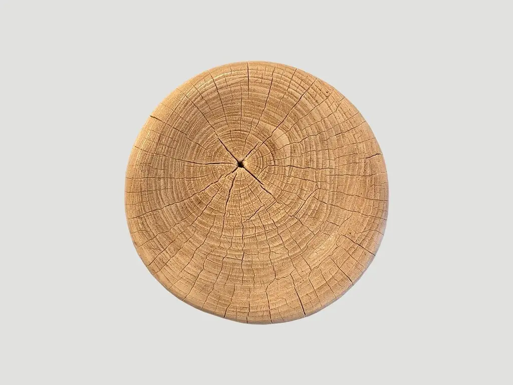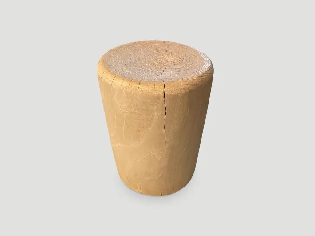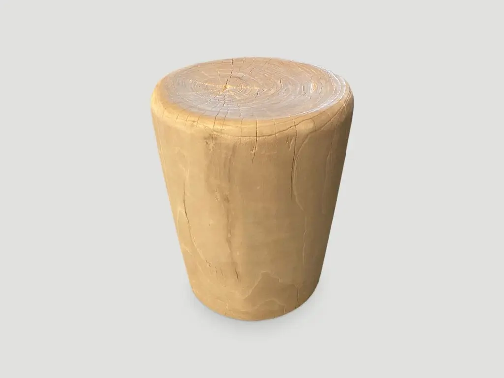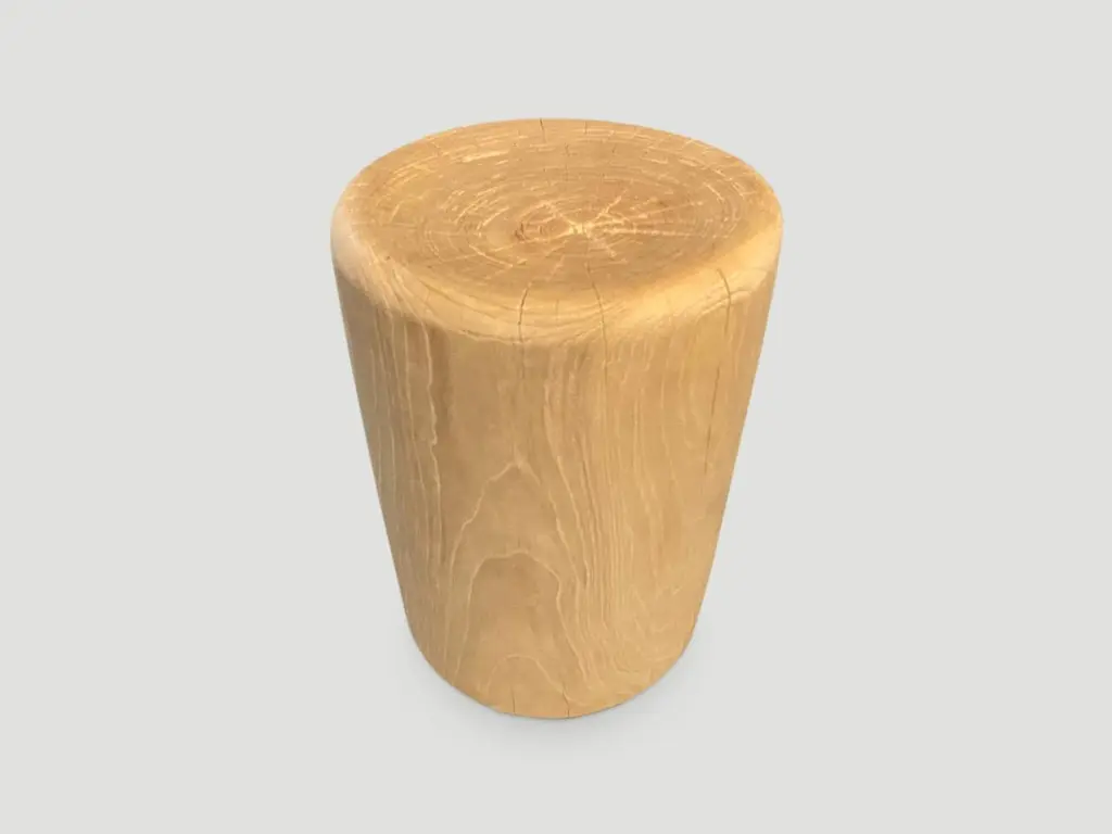 Reclaimed teak wood side table or stool. Hand carved with soft rounded sides, into a drum shape whilst respecting the natural organic wood. Bleached to a bone finish. There is a slight graduation from the bottom to the top. Also available charred.The St. Barts Collection features an exciting new line of organic white wash, bleached and natural weathered teak furniture. The reclaimed teak is bleached and left to bake in the sun and sea salt air for over a year to achieve this unique finish. Select pieces are infused with a brilliant aqua or soft blue resin that is cracked to achieve a unique quartz crystal effect. The final result evokes imagery of the white sand beaches and brilliant aqua waters of the famous French Caribbean Island.Own an Andrianna Shamaris original.Andrianna Shamaris. The Leader In Modern Organic Design.