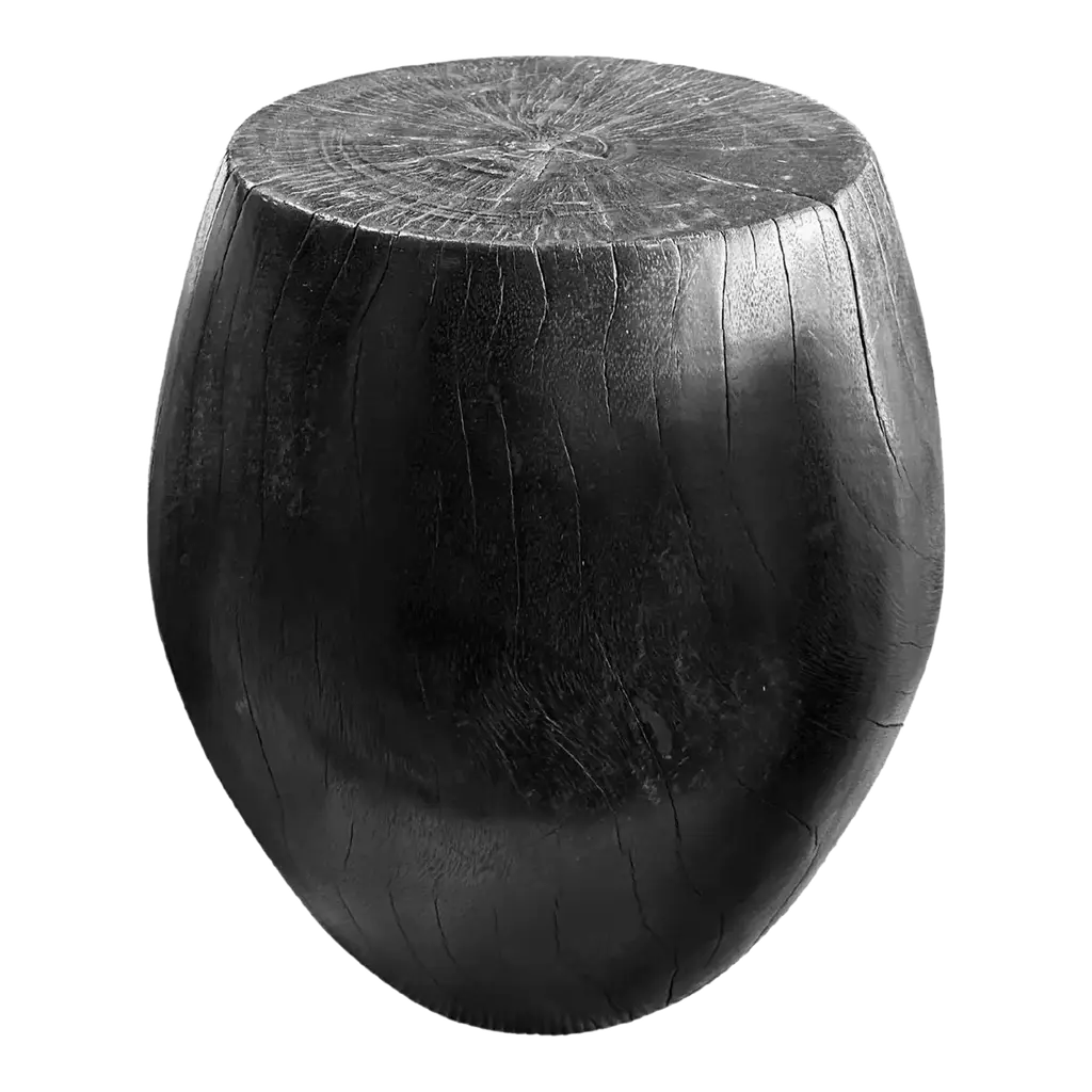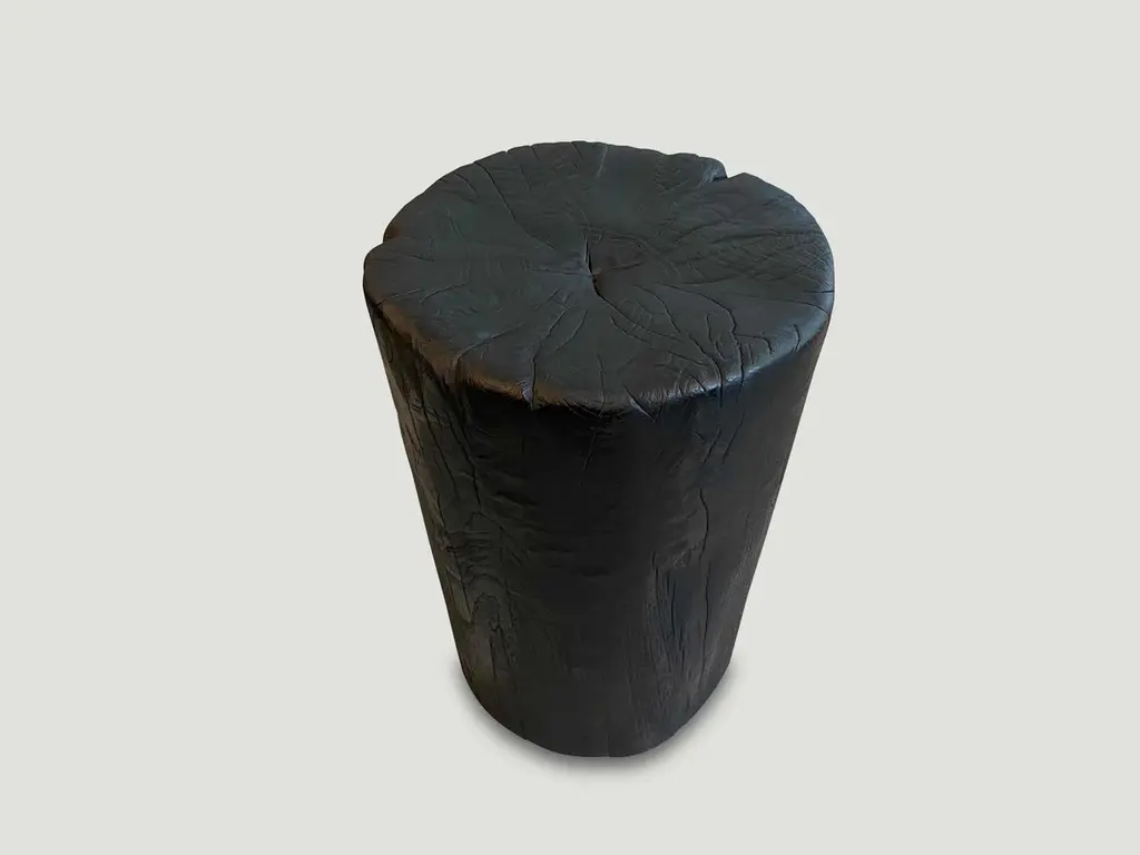 Reclaimed teak wood side table or stool. Hand carved into a drum shape whilst respecting the natural organic wood. Charred, sanded and sealed revealing the beautiful wood grain. Also available bleached.The Triple Burnt Collection represents a unique line of modern furniture made from solid reclaimed wood. Burnt three times to produce a rich, charcoal finish with impressive depth-a result unachievable using standard stains and finishes. A perfect combination of modern and organic.Own an Andrianna Shamaris original.Andrianna Shamaris. The Leader In Modern Organic Design.