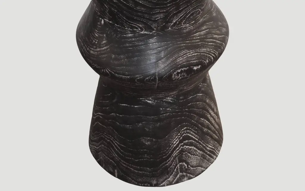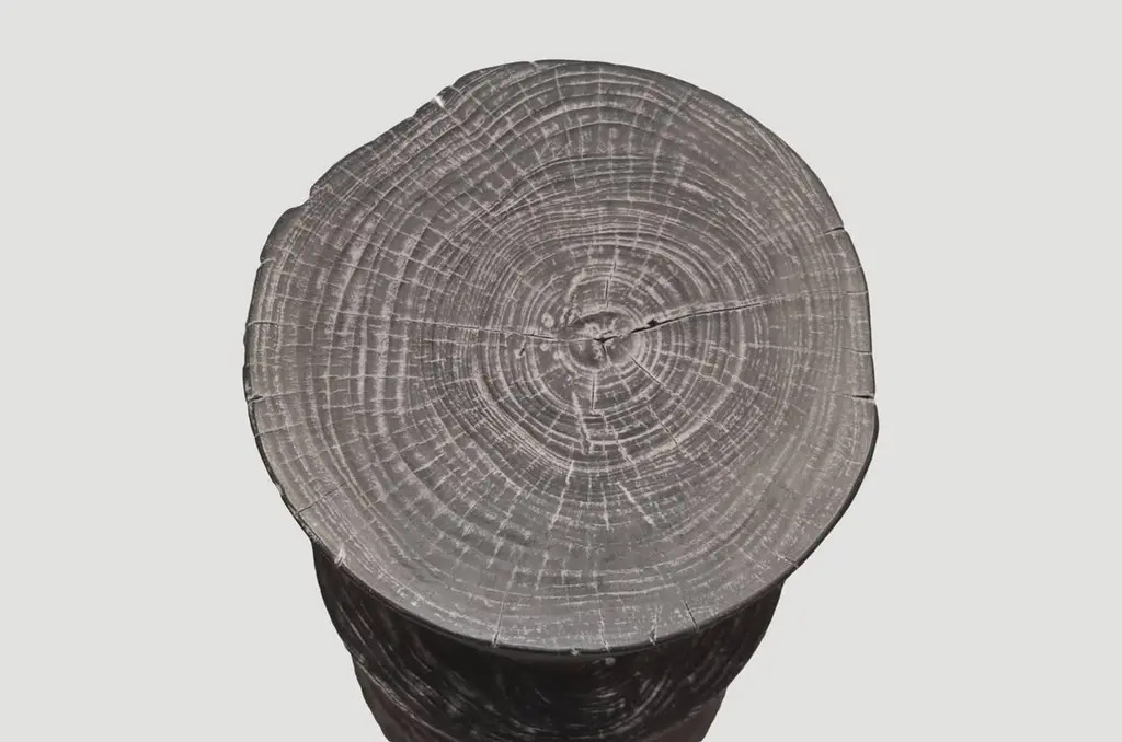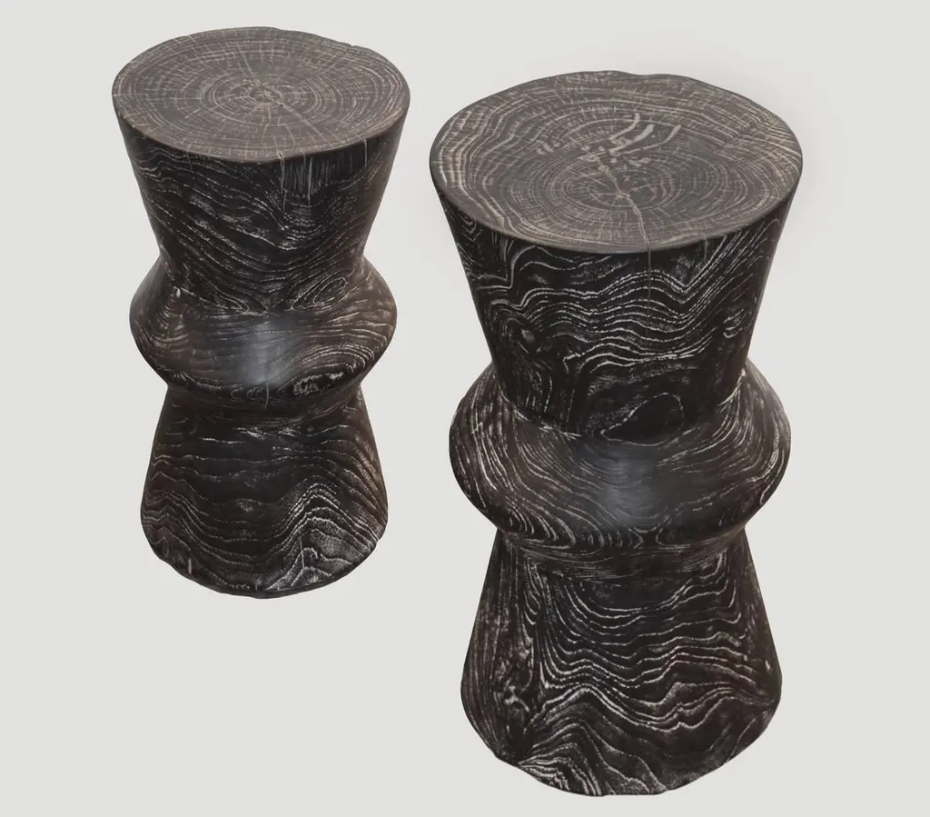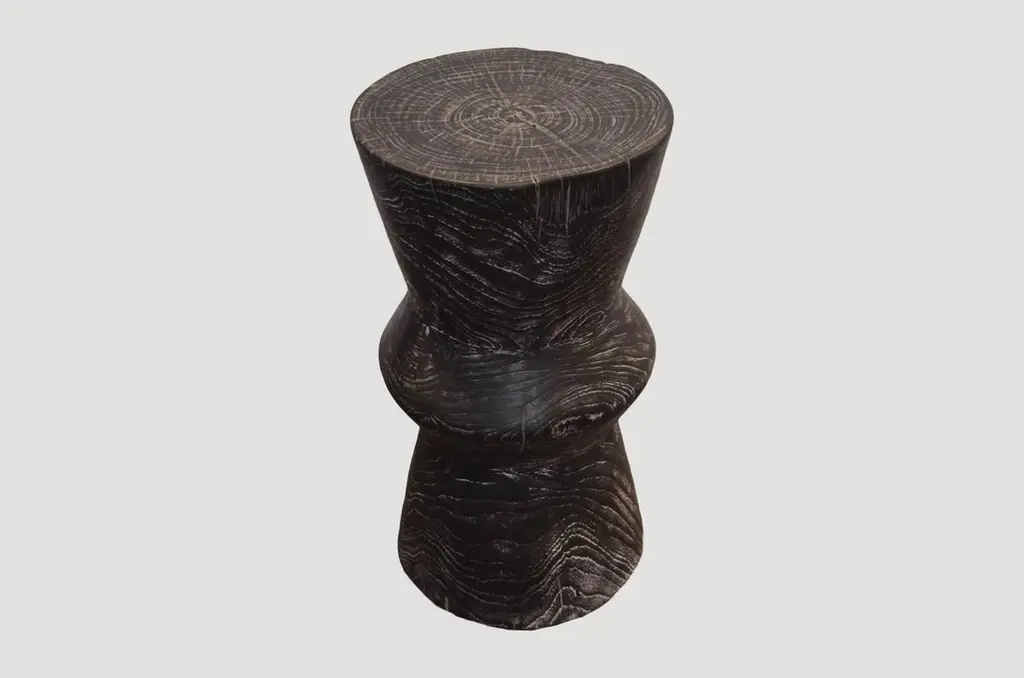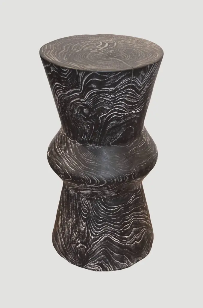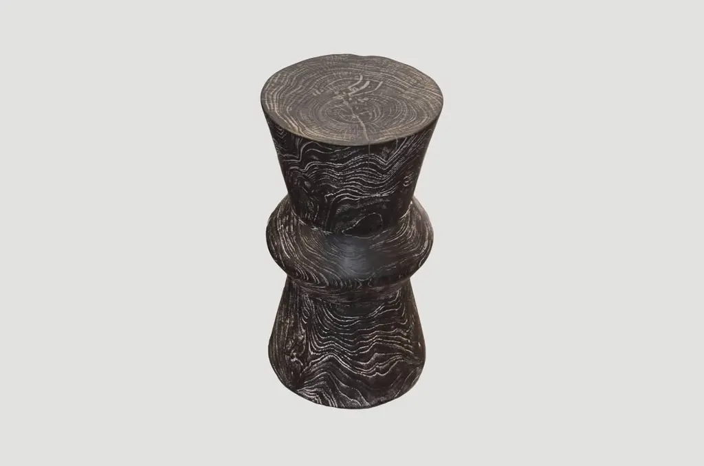 Hand carved, reclaimed teak wood side table or stool. Burnt, sanded and cerused. We have a collection. The size and price reflect the single one shown.The Triple Burnt Collection represents a unique line of modern furniture made from solid organic wood. Burnt three times to produce a rich, charcoal finish with impressive depth-a result unachievable using standard stains and finishes. A perfect combination of modern and organic.Andrianna Shamaris. The Leader In Modern Organic Design.