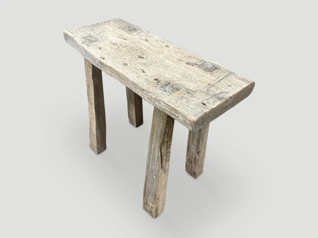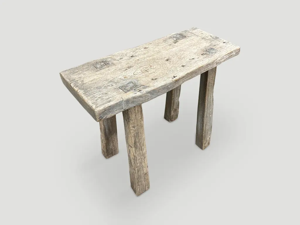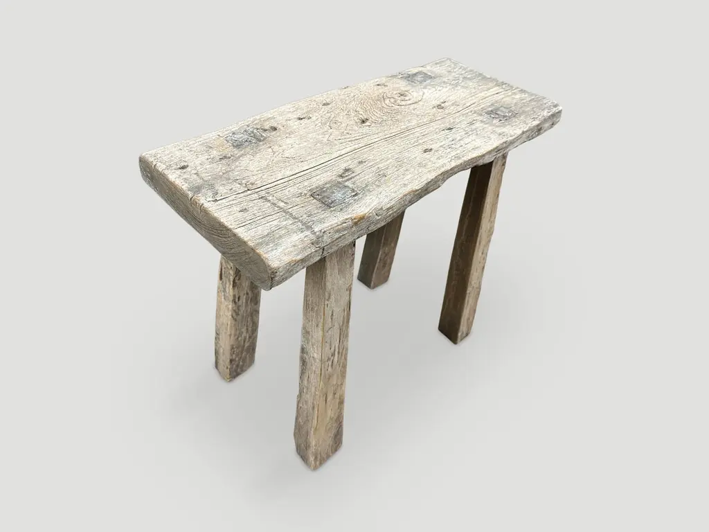 Beautiful patina on this antique single panel, natural aged teak wood bench or stool. Perfect for sitting on or as a shelf. Celebrating the cracks and crevices and all the other marks that time and loving use have left behind. We have a small collection. The images and price reflect the one shown.This bench was hand made in the spirit of Wabi-Sabi, a Japanese philosophy that beauty can be found in imperfection and impermanence. It is a beauty of things modest and humble. A beauty of things unconventional. It is the opposite of vulgarity. The costs of achieving this kind of minimalism are seemingly inconsistent with its mission of aesthetic humility. This kind of luxury is for a select few: The Emperor of Japan had a Wabi garden. Wabi is for people who already have a lot.Andrianna Shamaris original.Andrianna Shamaris. The Leader In Modern Organic Design.