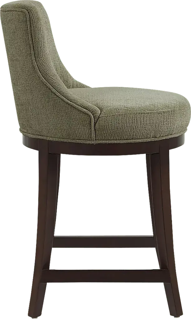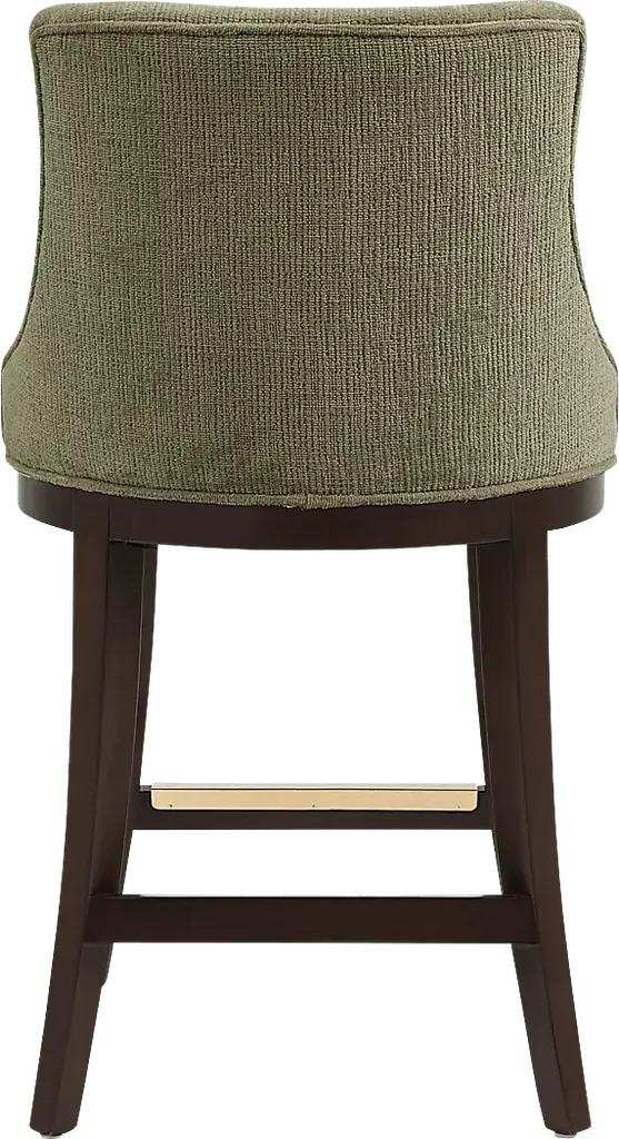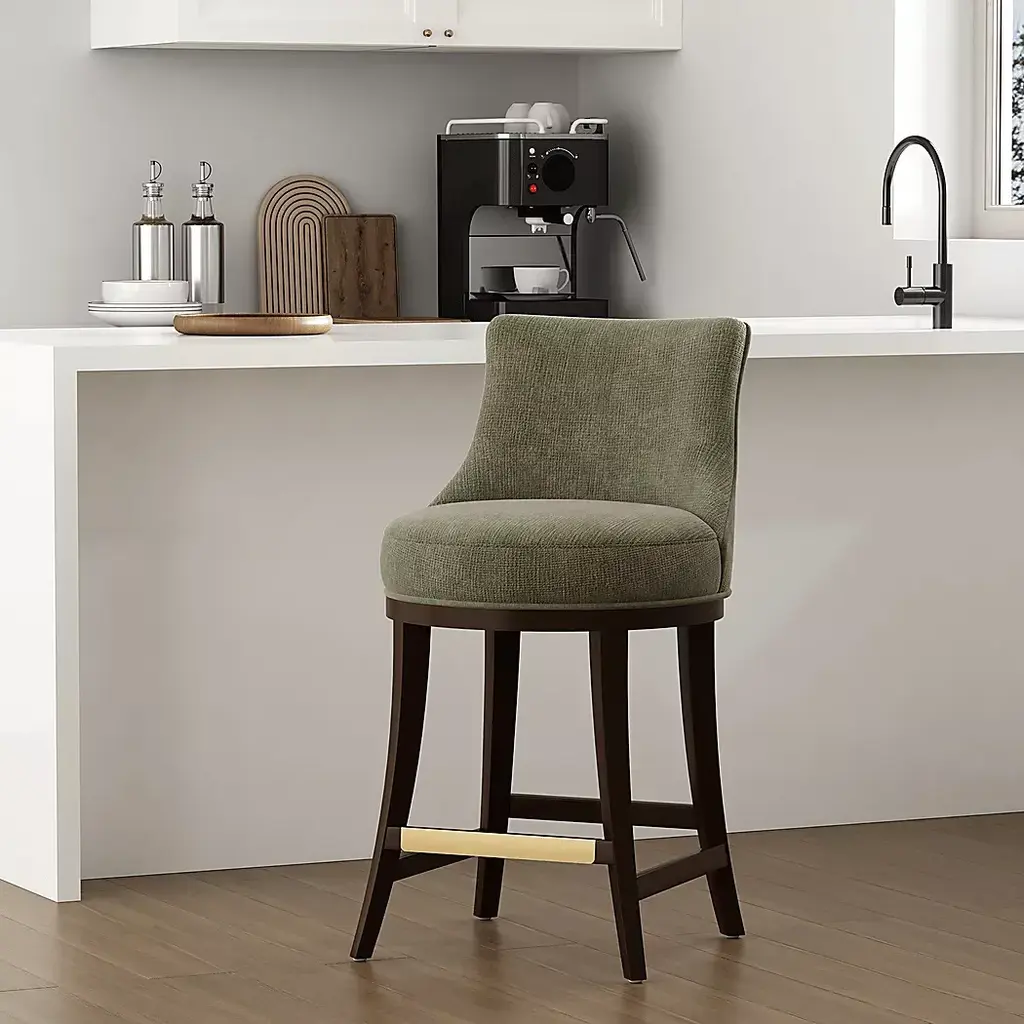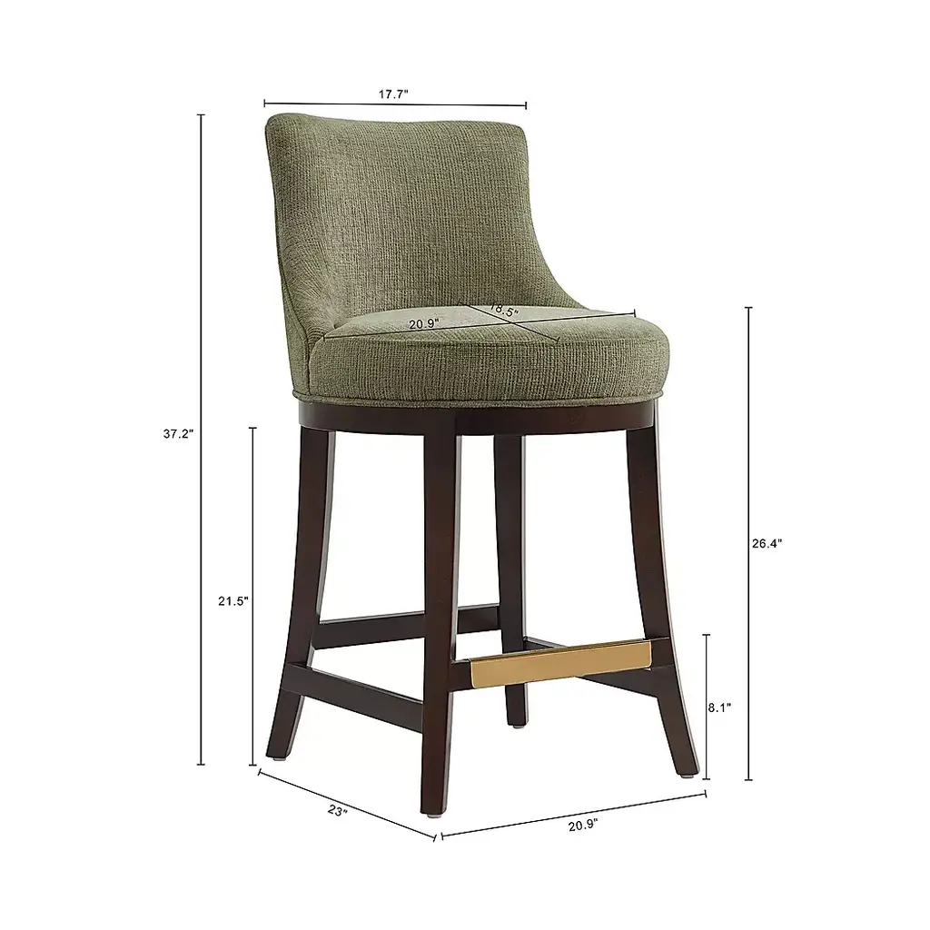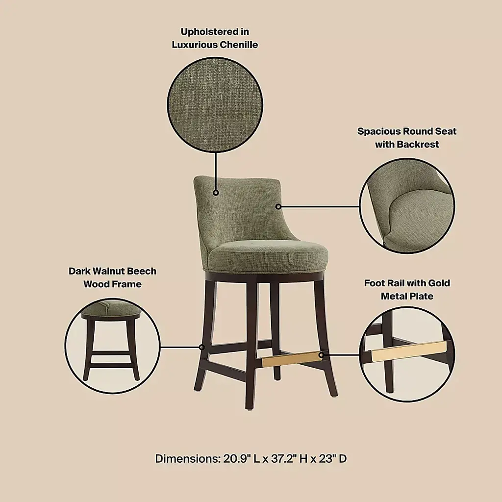 Elevate your everyday seating with the Angelphone green counter height stool that blends tailored elegance and thoughtful comfort. Wrapped in richly textured chenille, this stool invites you in with a curved backrest, offering both style and support. The generously cushioned seat and the dark walnut wood frame grounds the piece with a timeless warmth. A gleaming gold footrest adds a refined touch, making this stool a perfect companion for your everyday.