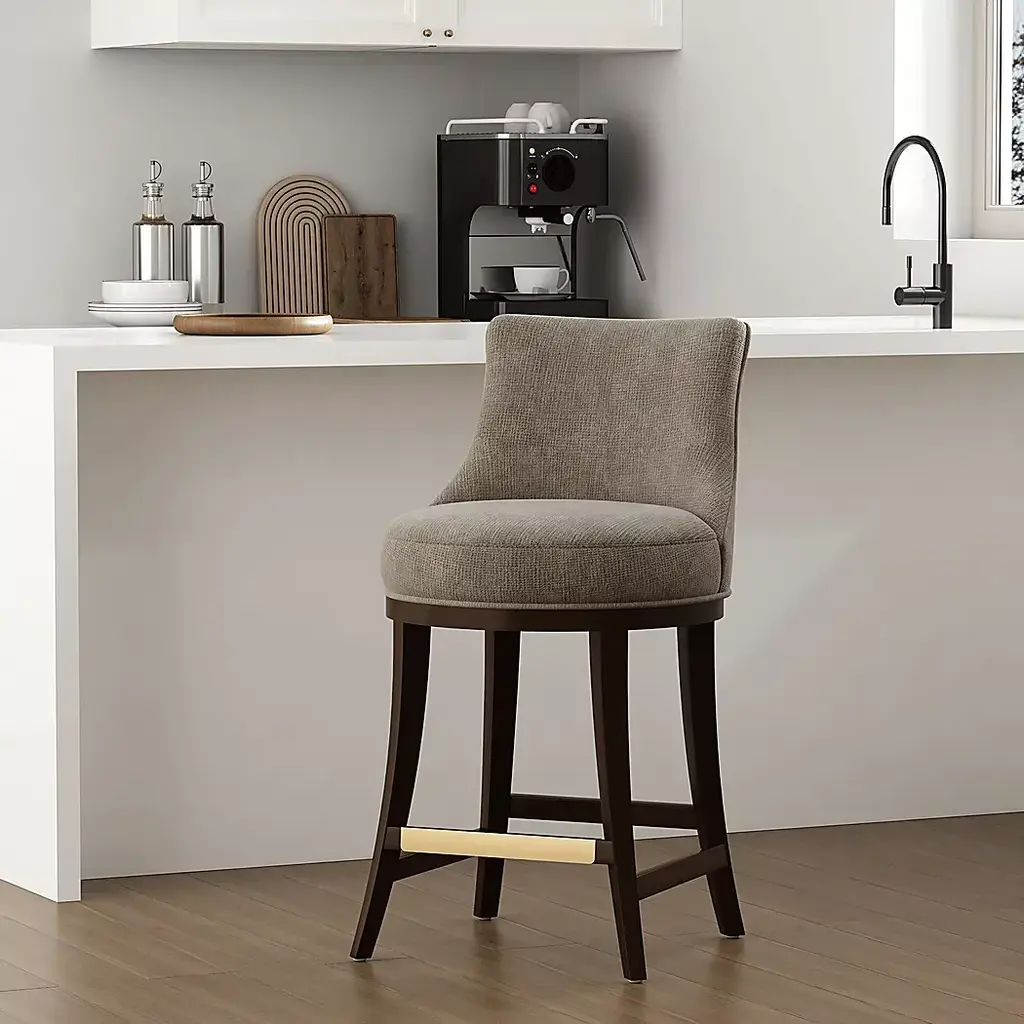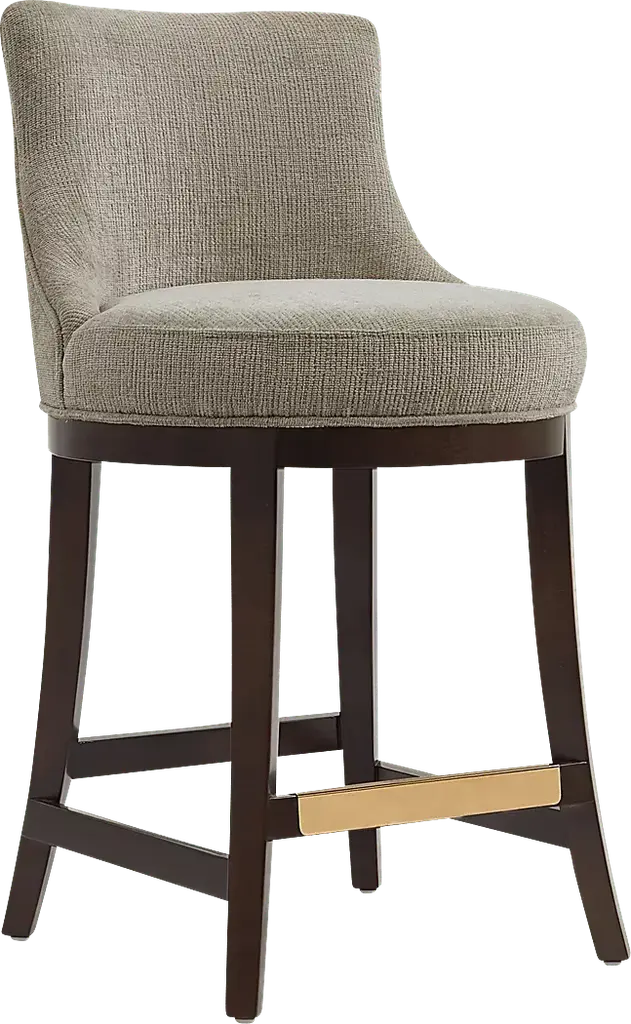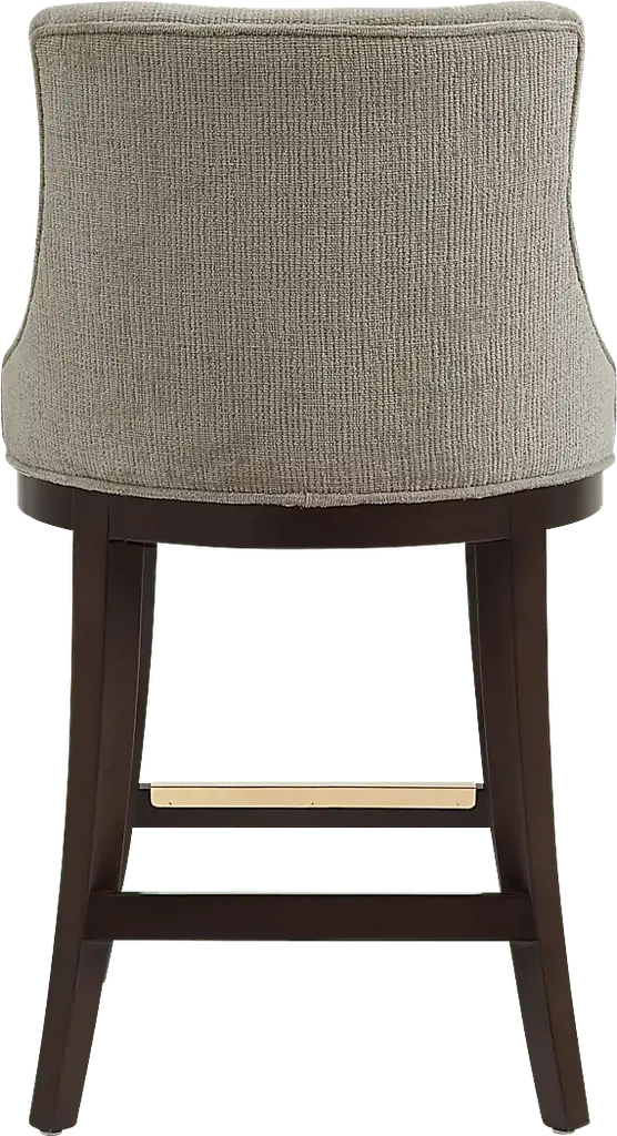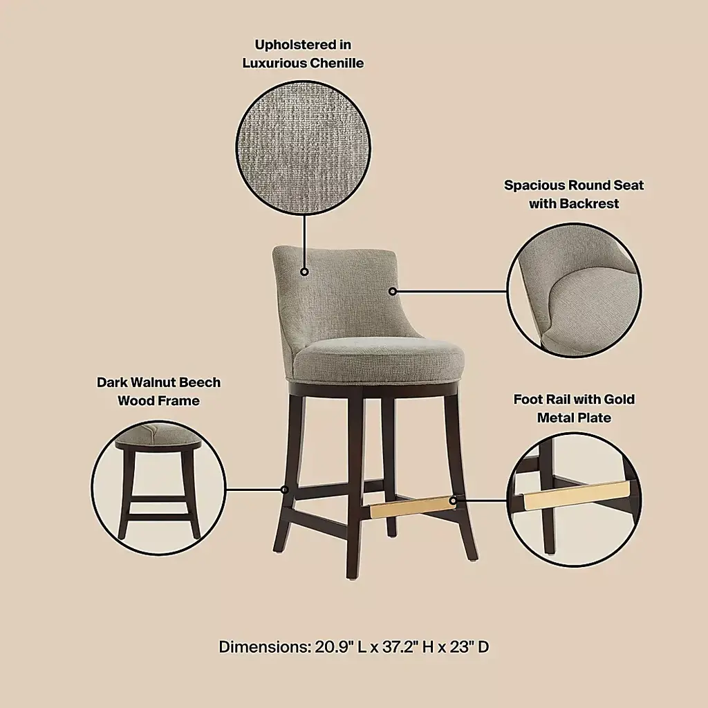 Elevate your everyday seating with the Angelphone taupe counter height stool that blends tailored elegance and thoughtful comfort. Wrapped in richly textured chenille, this stool invites you in with a curved backrest, offering both style and support. The generously cushioned seat and the dark walnut wood frame grounds the piece with a timeless warmth. A gleaming gold footrest adds a refined touch, making this stool a perfect companion for your everyday.