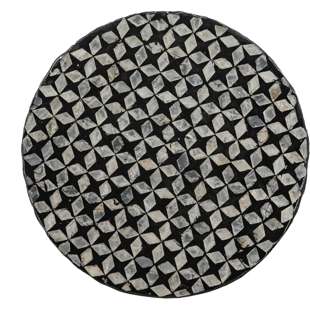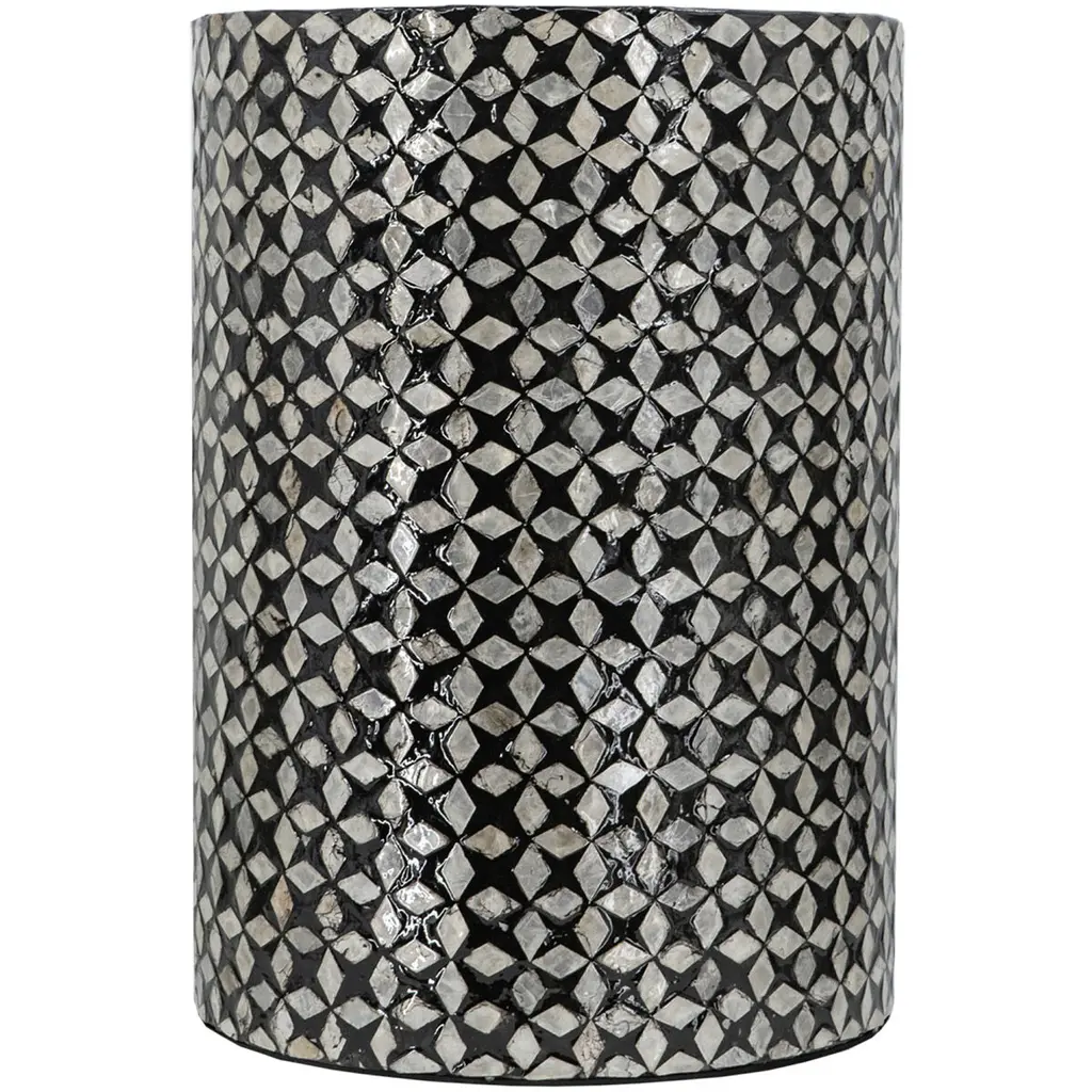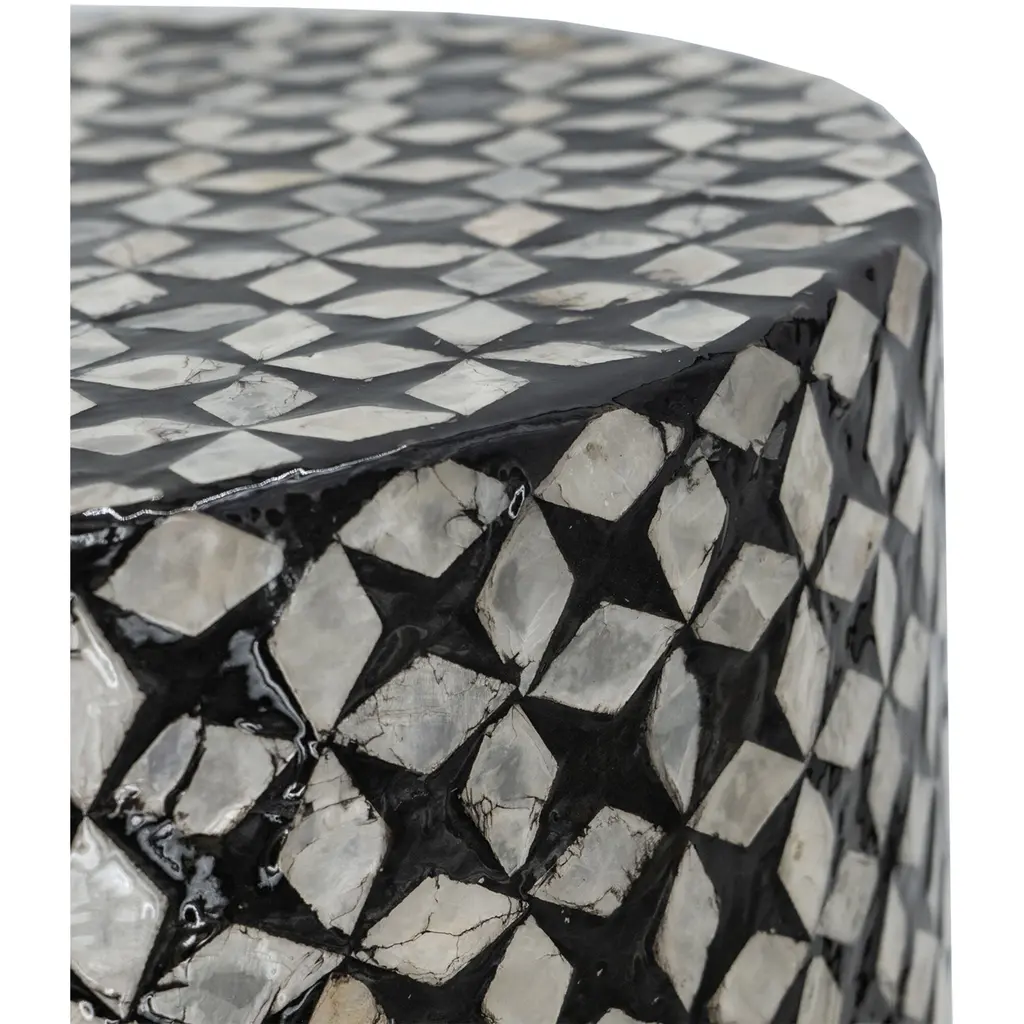This black accent stool features Capiz inlay within its geometric patterning and works beautifully in a living room or family room. The cylindrical structure gives the piece contemporary appeal and versatility within any layout. The round surface makes this equally useful as a stool or a tabletop.