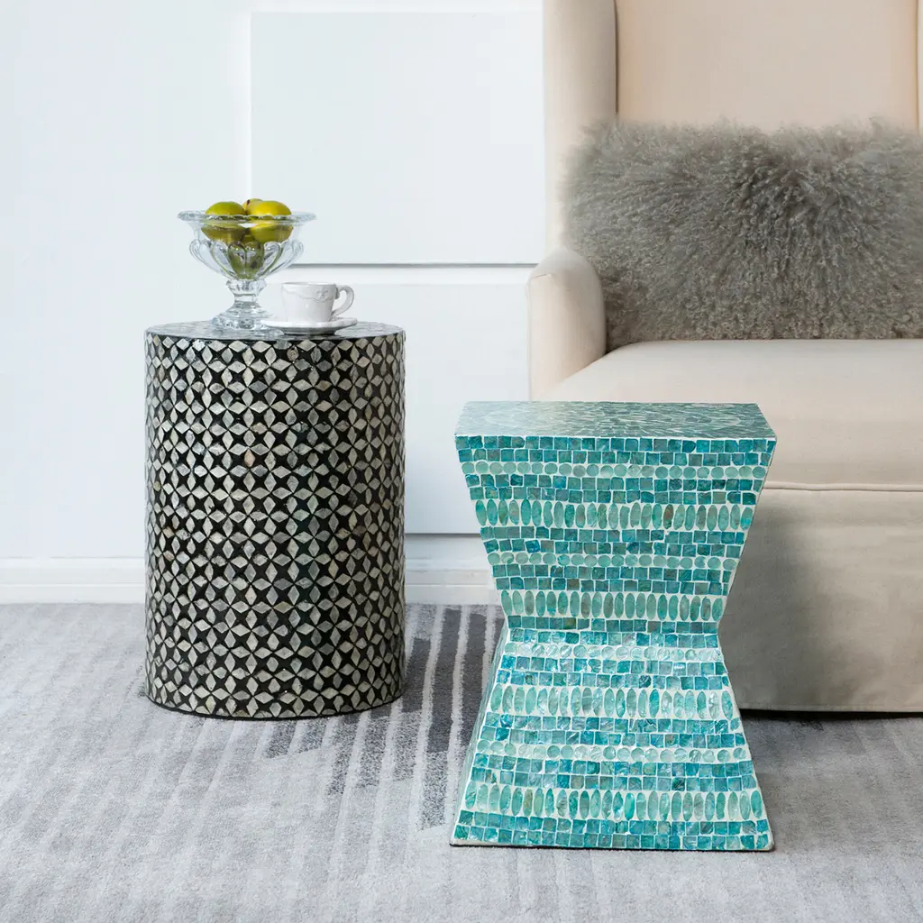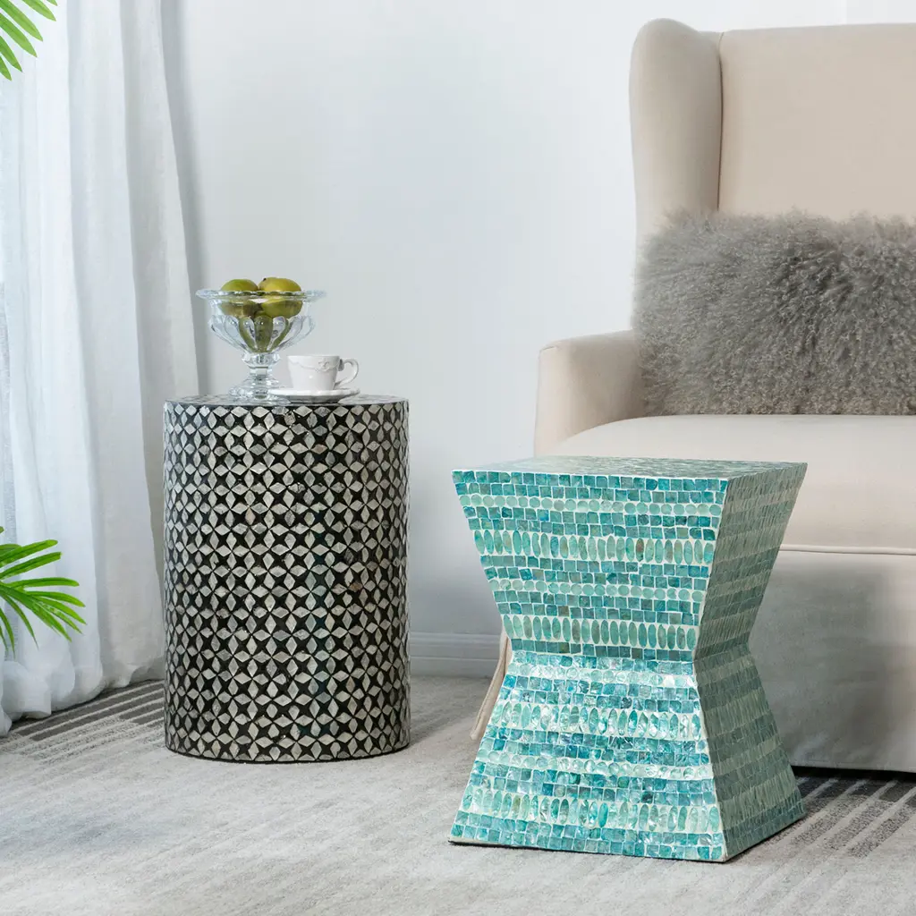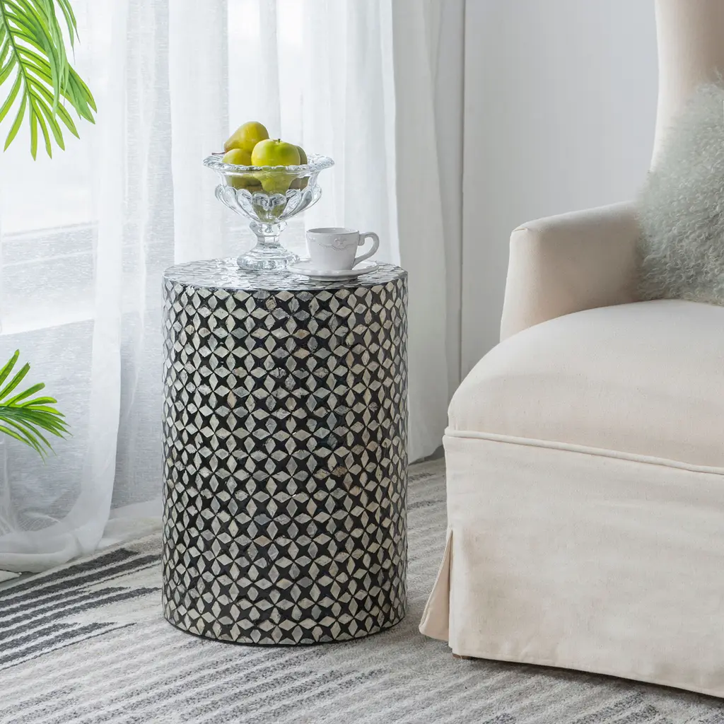 This black accent stool features Capiz inlay within its geometric patterning and works beautifully in a living room or family room. The cylindrical structure gives the piece contemporary appeal and versatility within any layout. The round surface makes this equally useful as a stool or a tabletop.