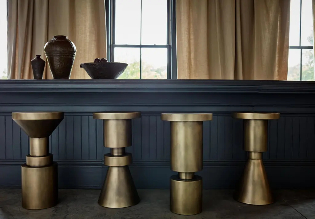 Taking their cue from the original Chess Stool Series, these forms have been elongated to serve as larger pieces within a room. Perfect for counter height use and made to work in series or alone. Metal stools are made from cold rolled steel, brass plated and finished with a hand rubbed patina. Wood stools are hand-turned, finished and sealed with water-resistant lacquer.Metal is a naturally porous material so variations and imperfections are part of the stools character making each one unique.Please note lead times for customized orders may vary. Details upon request. Rush orders can sometimes be accommodated. Please contact us for more details.