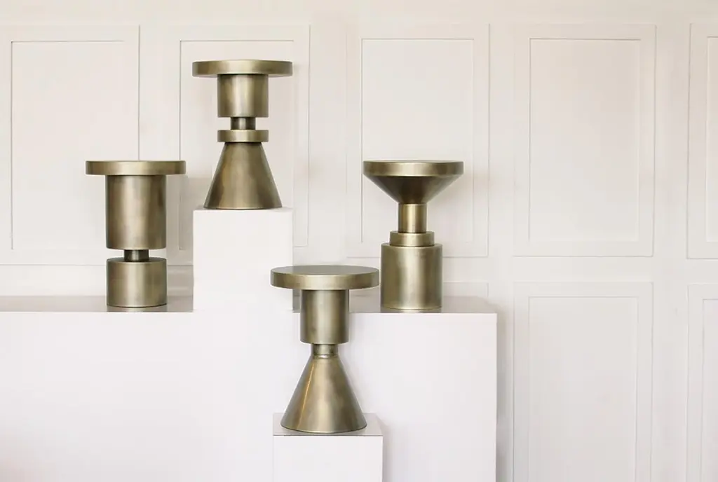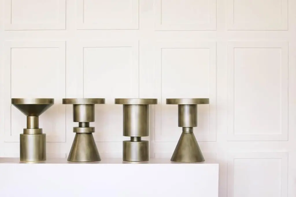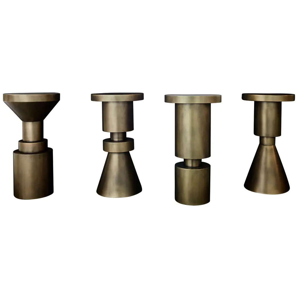 Like chess pieces dotted across a board, these sculptures can be placed throughout a room. Used as side tables or stools, they are made to work in series or alone. Metal stools are made from cold rolled steel, brass plated and finished with a hand rubbed patina. Wood and parchment stools are hand-turned, finished and sealed with water-resistant lacquer.Please note lead times for customized orders may vary. Details upon request. Rush orders can sometimes be accommodated. Please contact us for more details.