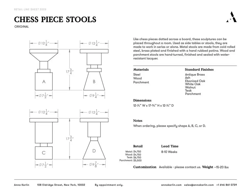 Like chess pieces dotted across a board, these sculptures can be placed throughout a room. Used as side tables or stools, they are made to work in series or alone. Metal stools are made from cold rolled steel, brass plated and finished with a hand rubbed patina. Wood and parchment stools are hand-turned, finished and sealed with water-resistant lacquer.