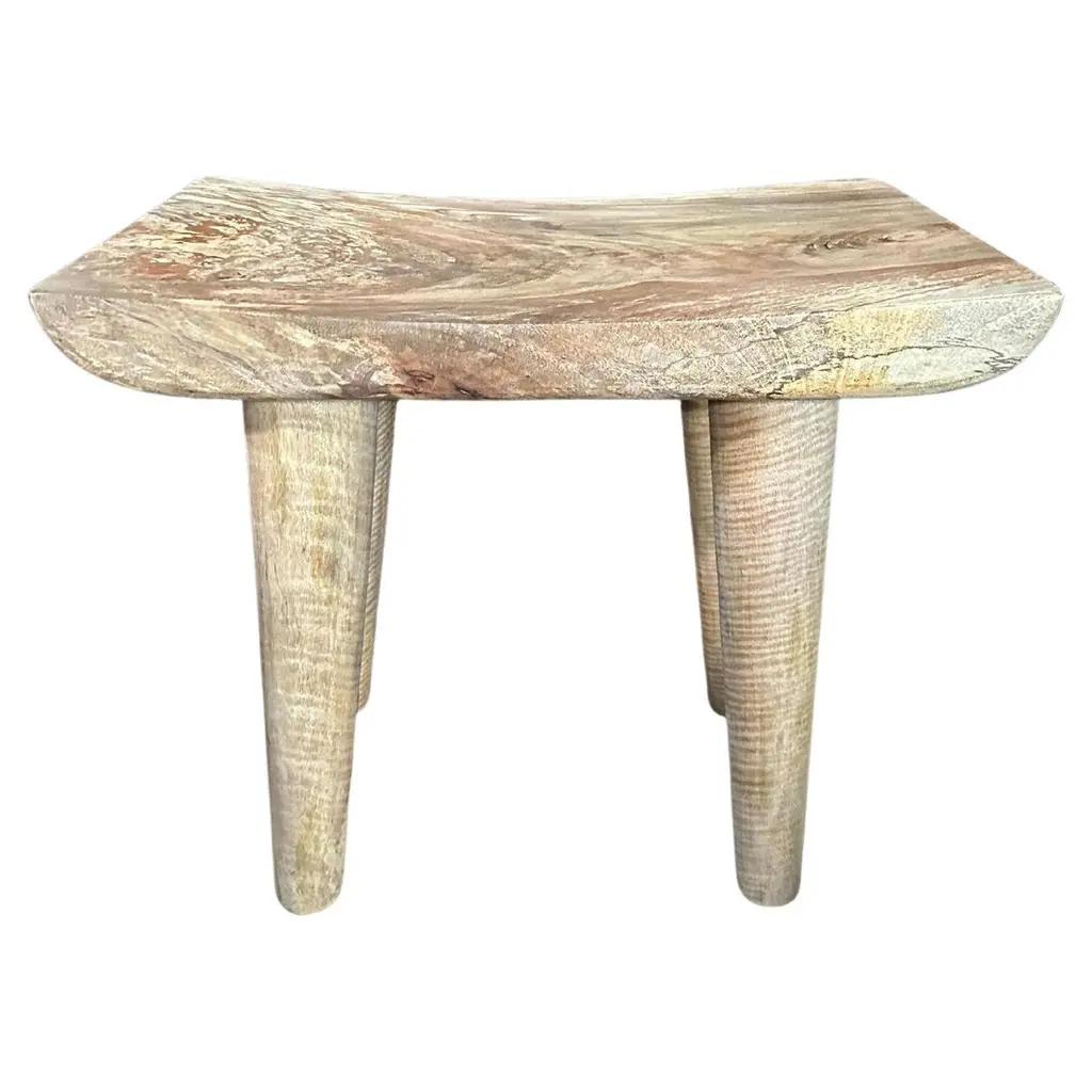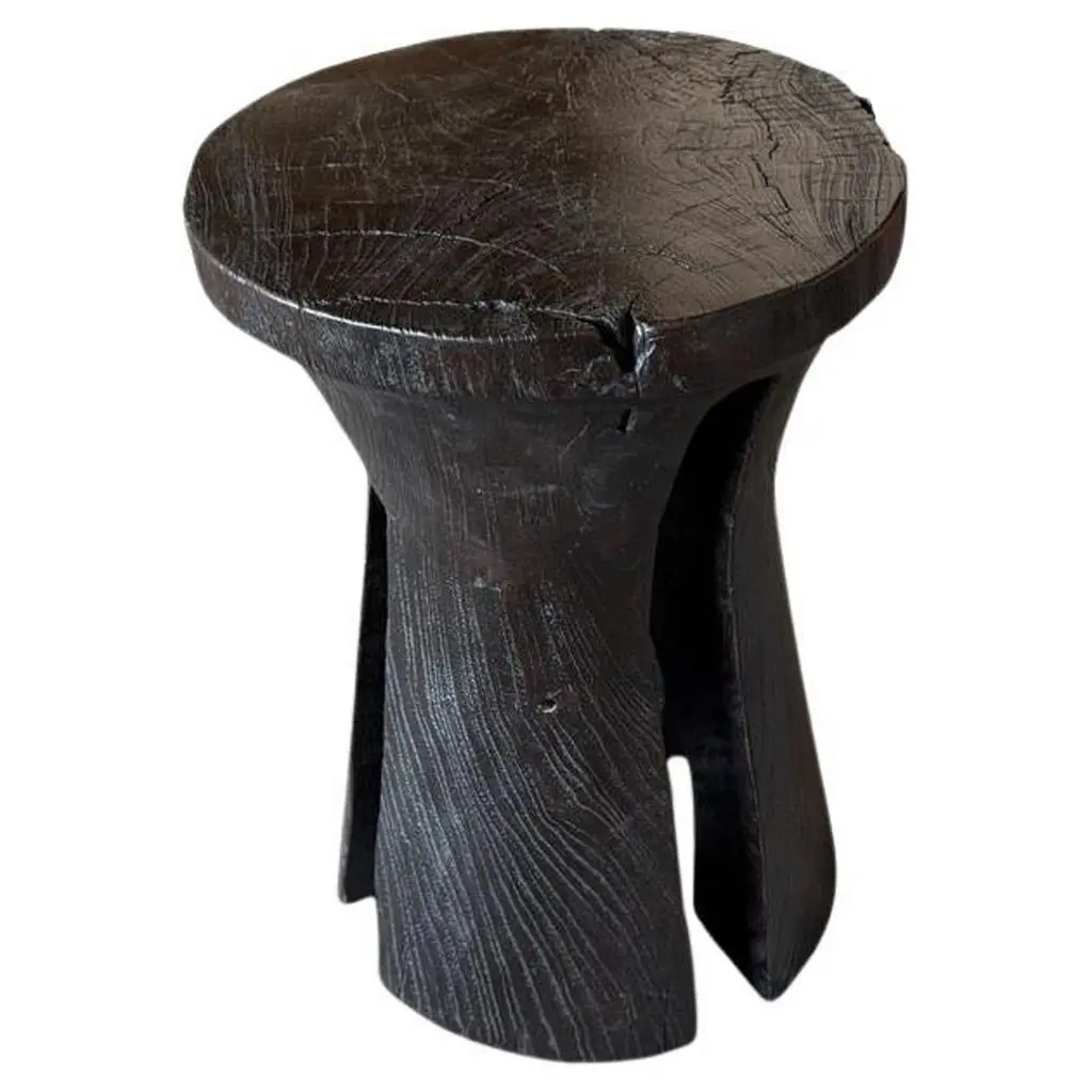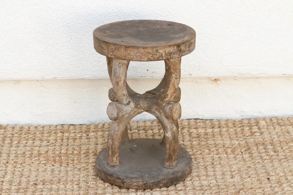 A piece of history, this antique Bamileke stool was originally used as a ceremonial seat to signify the status and power of tribal chiefs and kings. Hand-carved from a single wood log with an oxidized finish and traces of original paint, this stool showcases the rich cultural heritage of Cameroon. The semi-abstract carved spider design and rounded top add to the visual appeal of this antique stool.