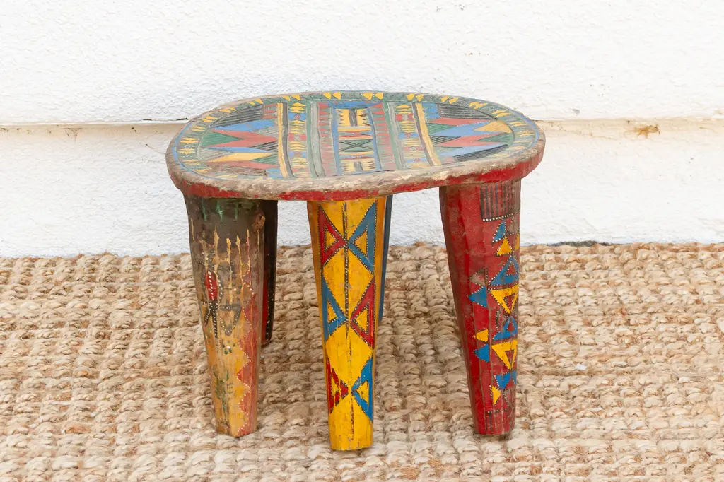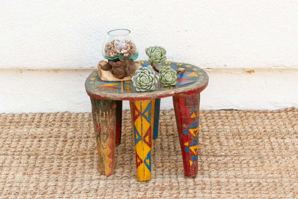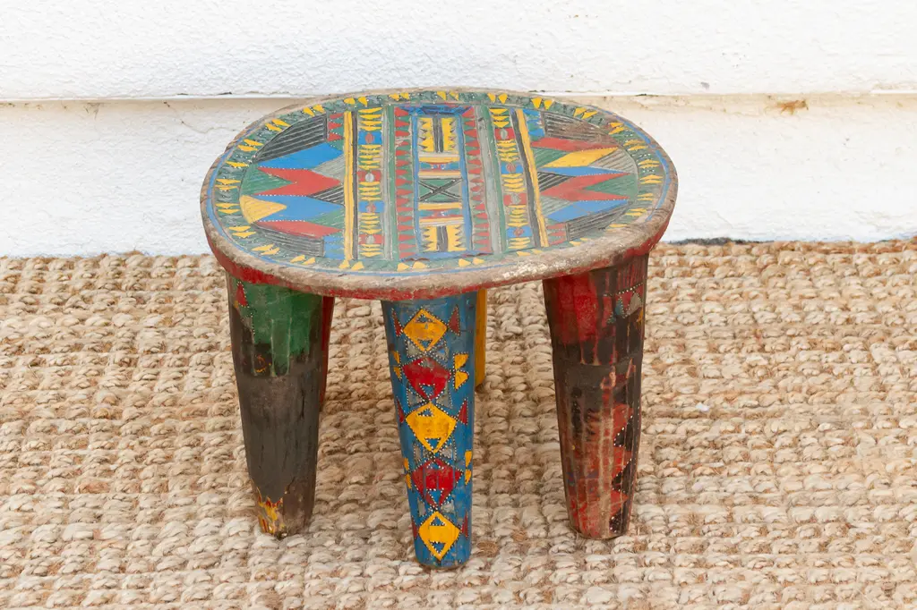 A unique piece of African art, this vintage Nupe table from Nigeria is a must-have for collectors and enthusiasts of Nupe culture. Carved from a single log of wood and standing on 6 chunky tapered legs, this table showcases the skillful craftsmanship of the Nupe people. The concave top features intricate geometric tribal motifs and a hand-painted multicolor finish.