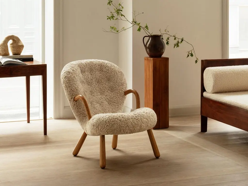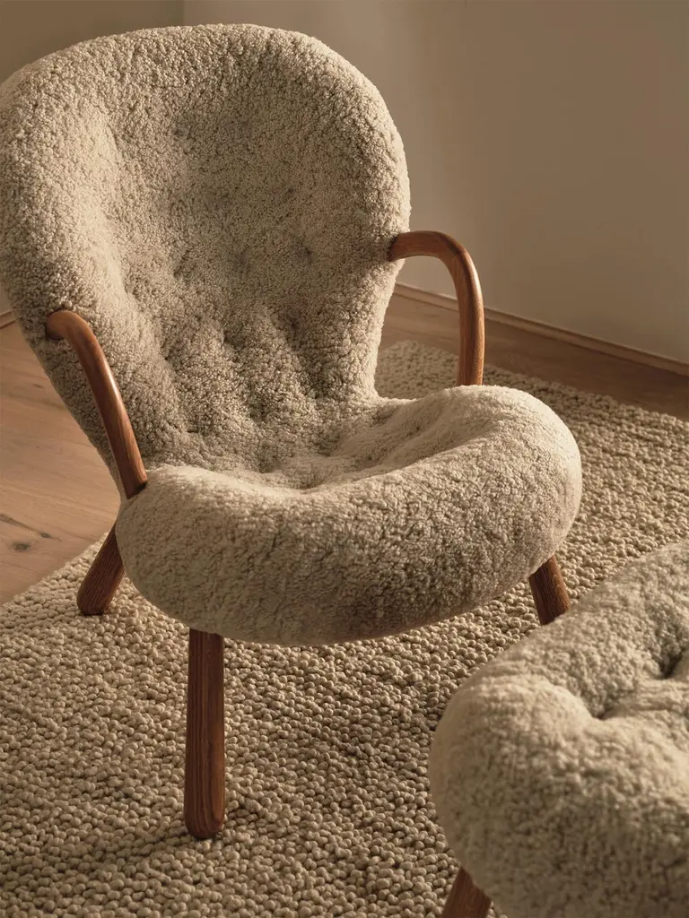 Arnold Madsen - Clam StoolThe Clam Stool is the perfect companion piece for Arnold Madsen's iconic Clam Chair. This new design has been has been developed in close collaboration with the family of Arnold Madsen by mirroring elements from the Clam Chair. The Clam Stool is made using traditional joinery and upholstery methods with a solid wood frame and turned club legs at our workshops in Sweden.The Clam Chair was designed in 1944 in Copenhagen by Danish upholsterer Arnold Madsen. In 1945 Arnold founded the furniture company Madsen & Schubell together with cabinetmaker Henry Schubell in order to produce this unique chair that became known in Danish as the: 'Muslingstol' (Clam Chair), due to its unique shape. The Clam Stool is available in a wide range of upholstery and wood finishes. Example Shown: Maple Sheepskin + Fumed OakHeight: 39cm (15.3”)Depth: 40cm (15.7”)Width: 61.5cm (24.2”)