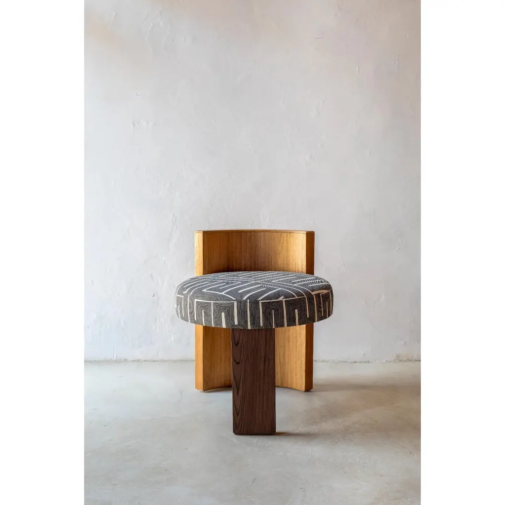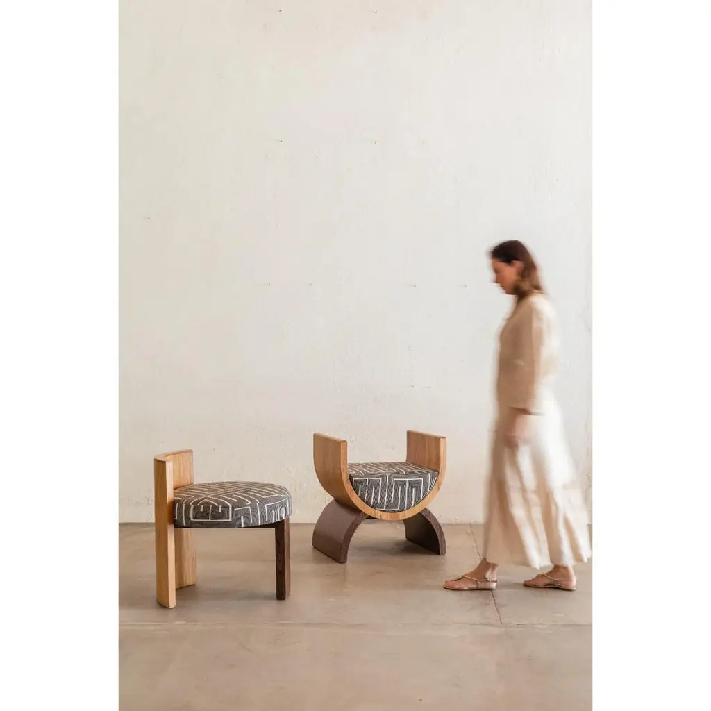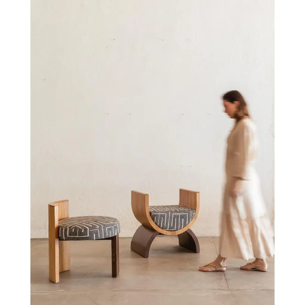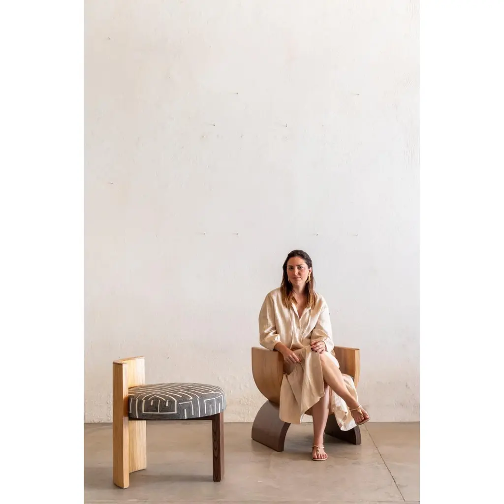 Aro Stool by Gabriela CamposDimensions: D 55 x W 55 x H 62 cm.Materials: Freijó wood with imbuia finish and hand-painted fabric.The essence of this capsule of 4 pieces is a dialog between the Art Décomovement and the indigenous graphics of the Assurini people from theUpper Xingu region of the Amazon. A contemporary look at ancestral tradition, using the geometric aesthetics of the art movement and the application of hand-painted fabric, by Assurini women.Through this union we created a unique visual identity that celebratesour cultural and creative diversity.ESTÚDIO MAIS ALMA moves toward the authentic and the unique, whether in the subtle observation of nature's forms and contours, or in the inexhaustible source of inspiration that is the world of art.Mais Alma is a design studio BASED in Rio de Janeiro, founded by architect and designer Gabriela Campos. Her work has a contemporary and welcoming approach: a comfortable and timeless aesthetic that combines warm materials and clean lines, with soft palettes and finedetails.