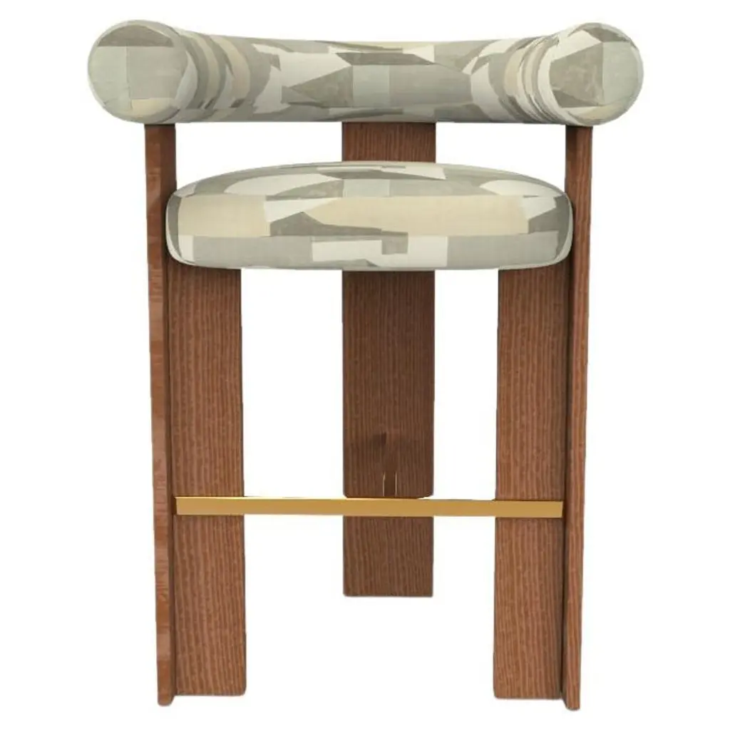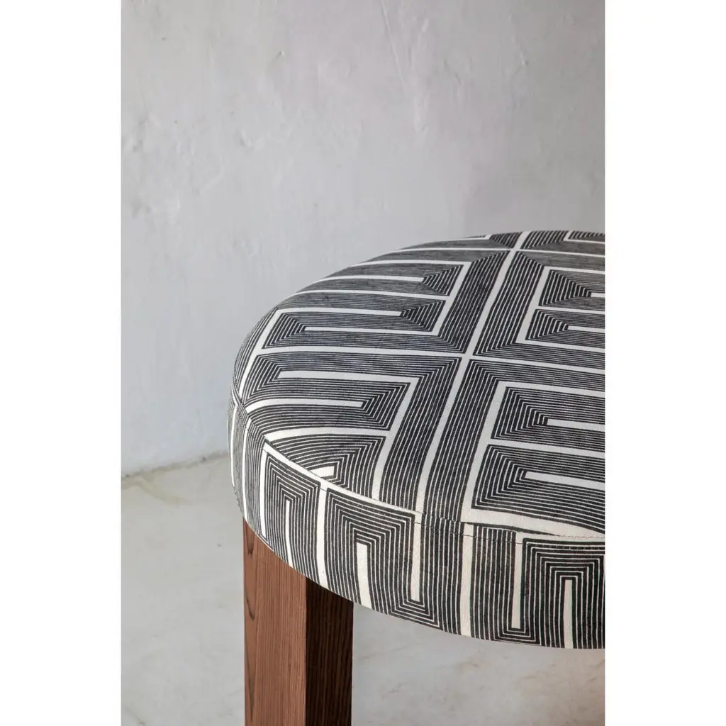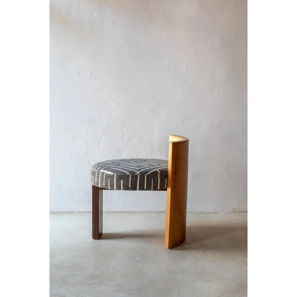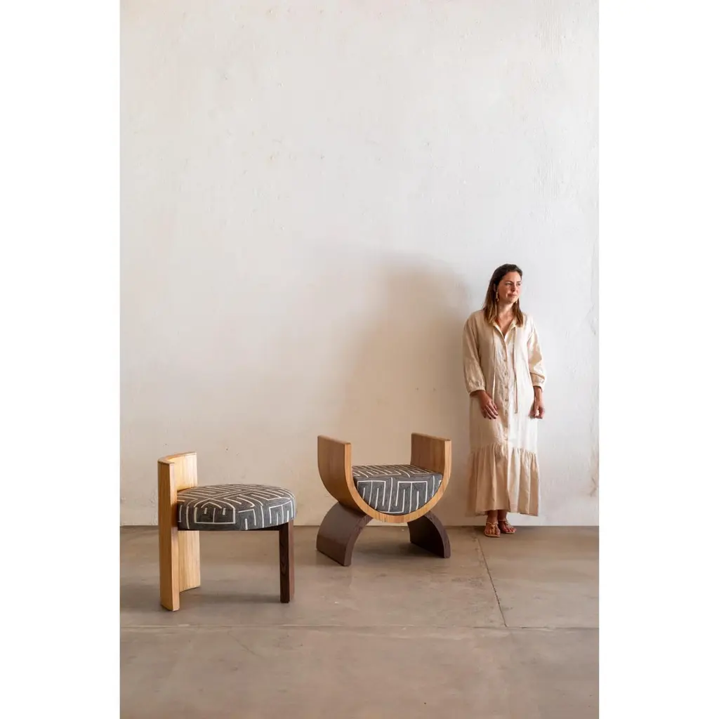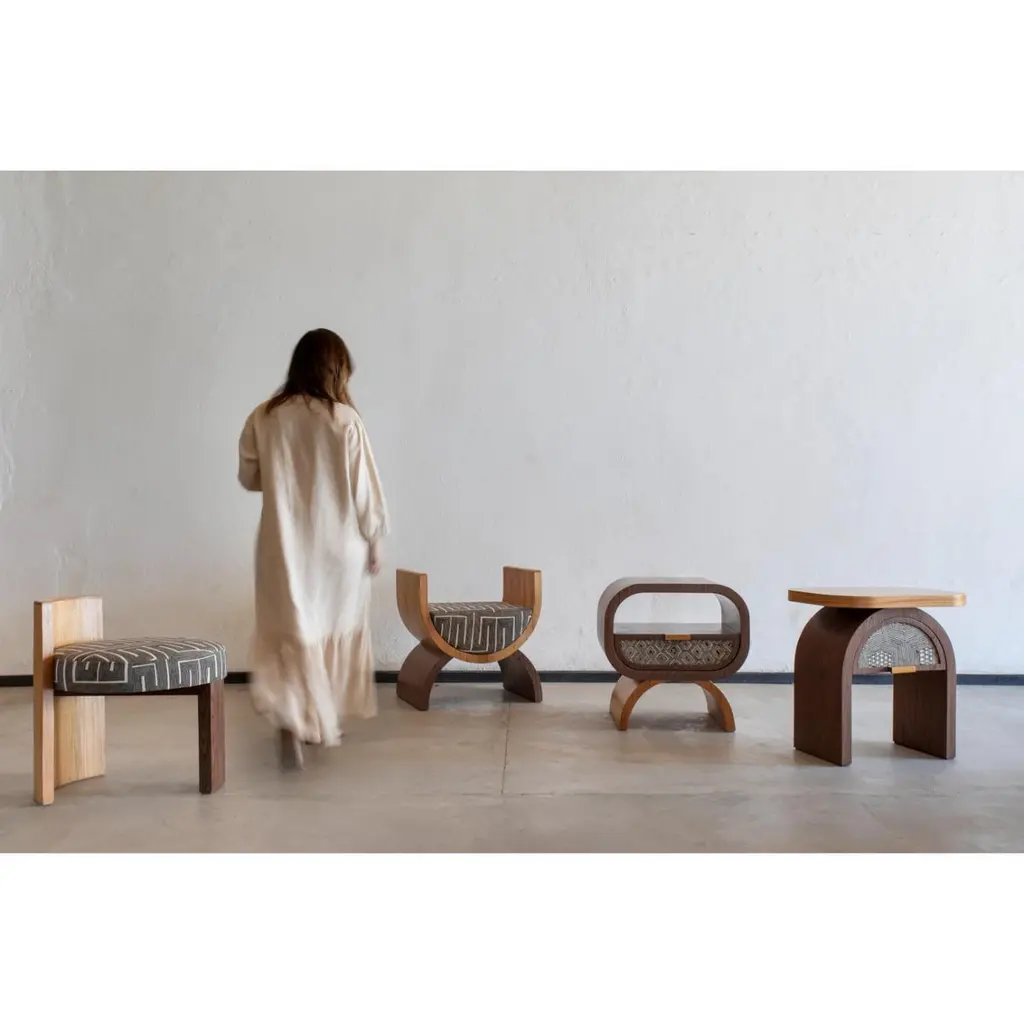 Aro Stool by Gabriela CamposDimensions: D 55 x W 55 x H 62 cm.Materials: Freijó wood with imbuia finish and hand-painted fabric.The essence of this capsule of 4 pieces is a dialog between the Art Décomovement and the indigenous graphics of the Assurini people from theUpper Xingu region of the Amazon. A contemporary look at ancestral tradition, using the geometric aesthetics of the art movement and the application of hand-painted fabric, by Assurini women.Through this union we created a unique visual identity that celebratesour cultural and creative diversity.ESTÚDIO MAIS ALMA moves toward the authentic and the unique, whether in the subtle observation of nature's forms and contours, or in the inexhaustible source of inspiration that is the world of art.Mais Alma is a design studio BASED in Rio de Janeiro, founded by architect and designer Gabriela Campos. Her work has a contemporary and welcoming approach: a comfortable and timeless aesthetic that combines warm materials and clean lines, with soft palettes and finedetails.