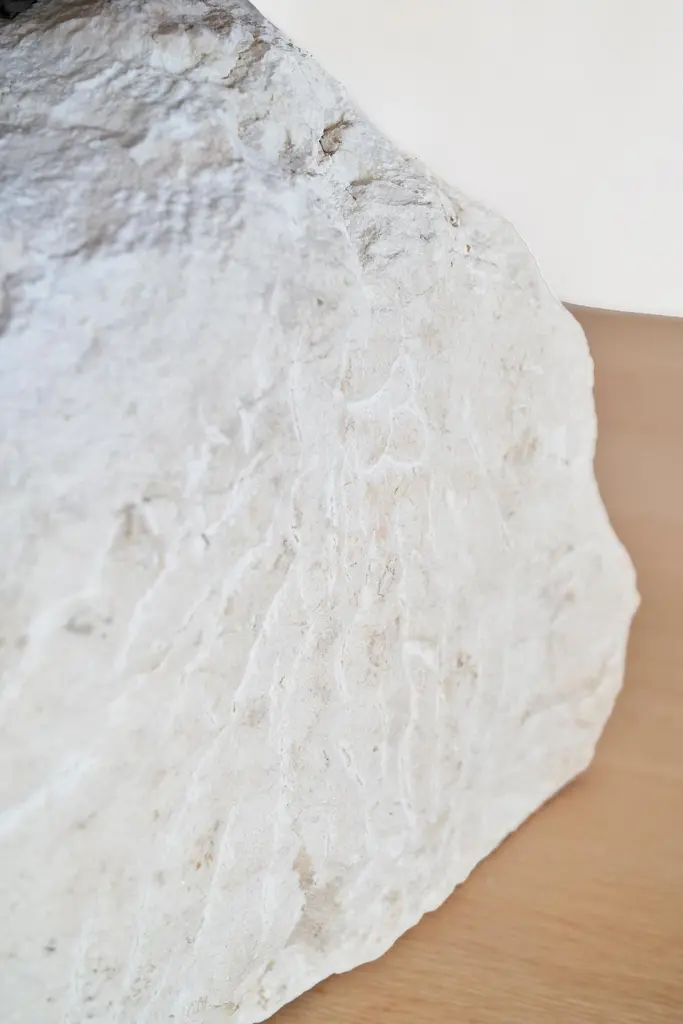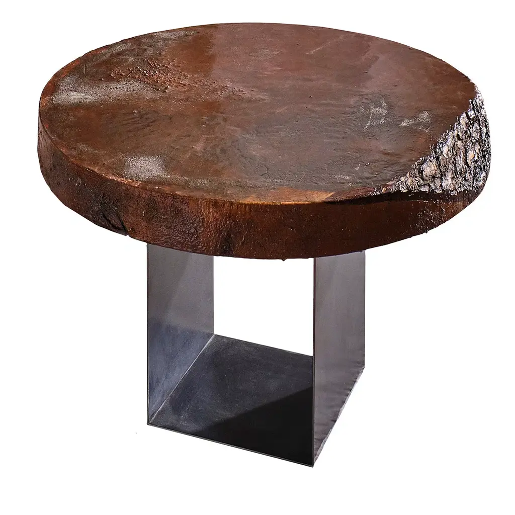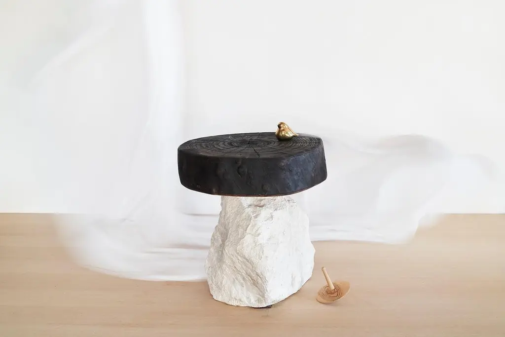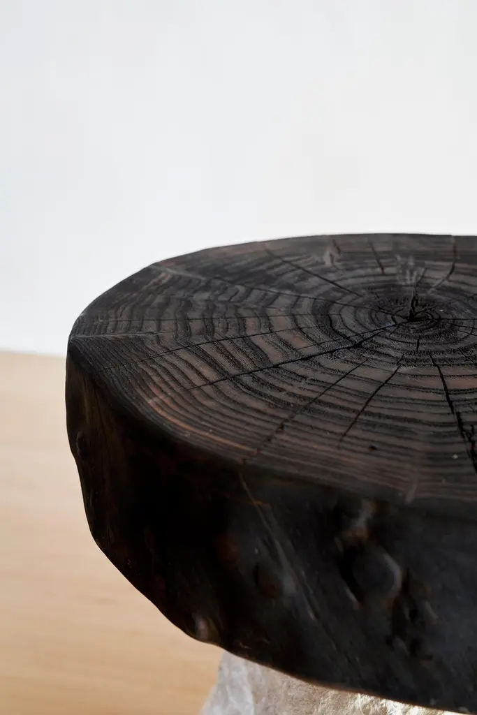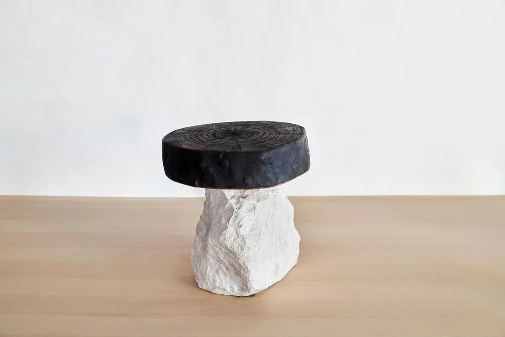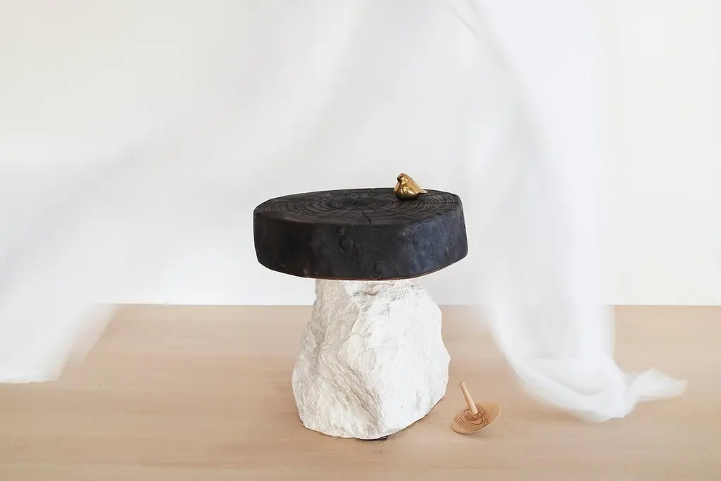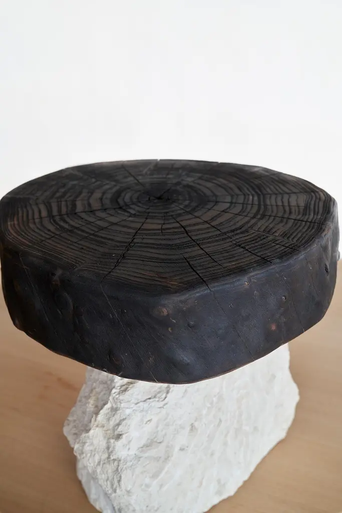 Art Brut Stool by Jean-Baptiste Van Den HeedeUnique pieceDimensions: W 43 x L 40 x H 40 cmMaterials: Hand-carved Stone and Fire-Treated Natural Elm Wood Top.ART BRUT Collection. A functional sculpture that can also be seen as a stool or a side table.Jean-Baptiste Van den Heede defines himself as a cabinetmaker-designer and an artist of academic training and family tradition. He has achieved unique designs of national and international prestige and has several awards in avant-garde furniture.Born in Argentina in 1966, from an Argentine mother and a Belgian father. At 5 years of age he and his family moved to Belgium.To train as a wood professional, he first studied 4 years of carpentry. Then he continued training in cabinetmaking and carving for 5 more years. Always in search of contributing something more to his trade, he studied furniture and antique design, culminating this with the study of Sculpture at the Royal Academies of Fine Arts in Liège (Belgium) and graduating with honors.Work the stone, the wood and experience the forge. From the beginning it is directed towards a search for signs, abstract writings and unrealistic figures in analogy with other “primitive” cultures. He taught drawing and sculpture in Brussels at the private school “la main et l´ esprit” As well as summer courses in Liege (Belgium) “les ateliers d´art contemporain”.In 1995 he went to Barcelona where he taught and investigated the reliefs of different supports such as trees, floors, and especially sewer covers.He searched again analogies between current art and prehistoric, African art, etc.Participated in several exhibitions both at the artistic level and avant-garde design.In 2002, he moved down to Albacete and then to a town in the province where he still works.It is defined as “a search engine without haste or guidelines.” He says: “I only work when I feel a strong and positive inspiration invade me, an energy that I capture from matter, from the air and that I return doing the work until I feel a connection with it.”Private workshop of contemporary art in Letur (Albacete) until 2009.He currently works in his workshop-studio in the Sierra de Madrid (Guadalix de la Sierra) following his career as a cabinetmaker-designer and artist while teaching his trade to students interested in wood.