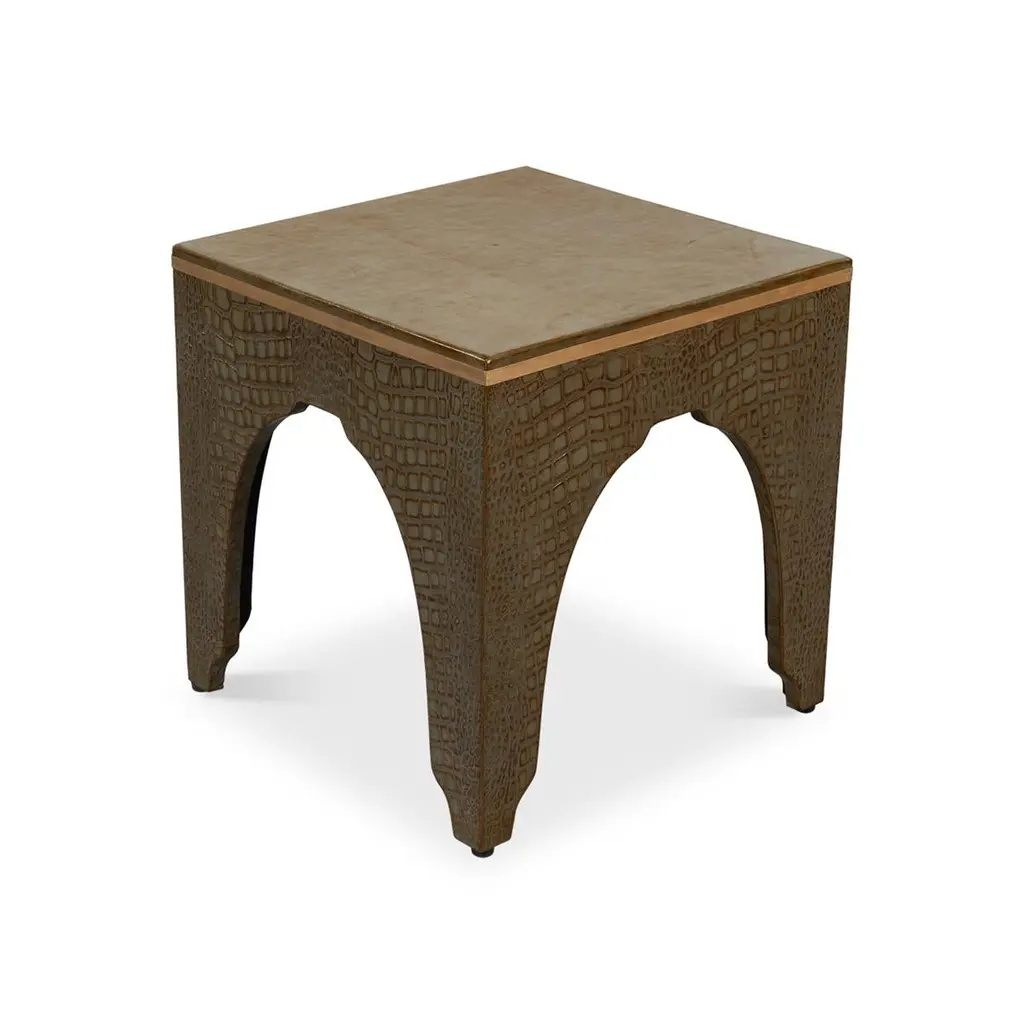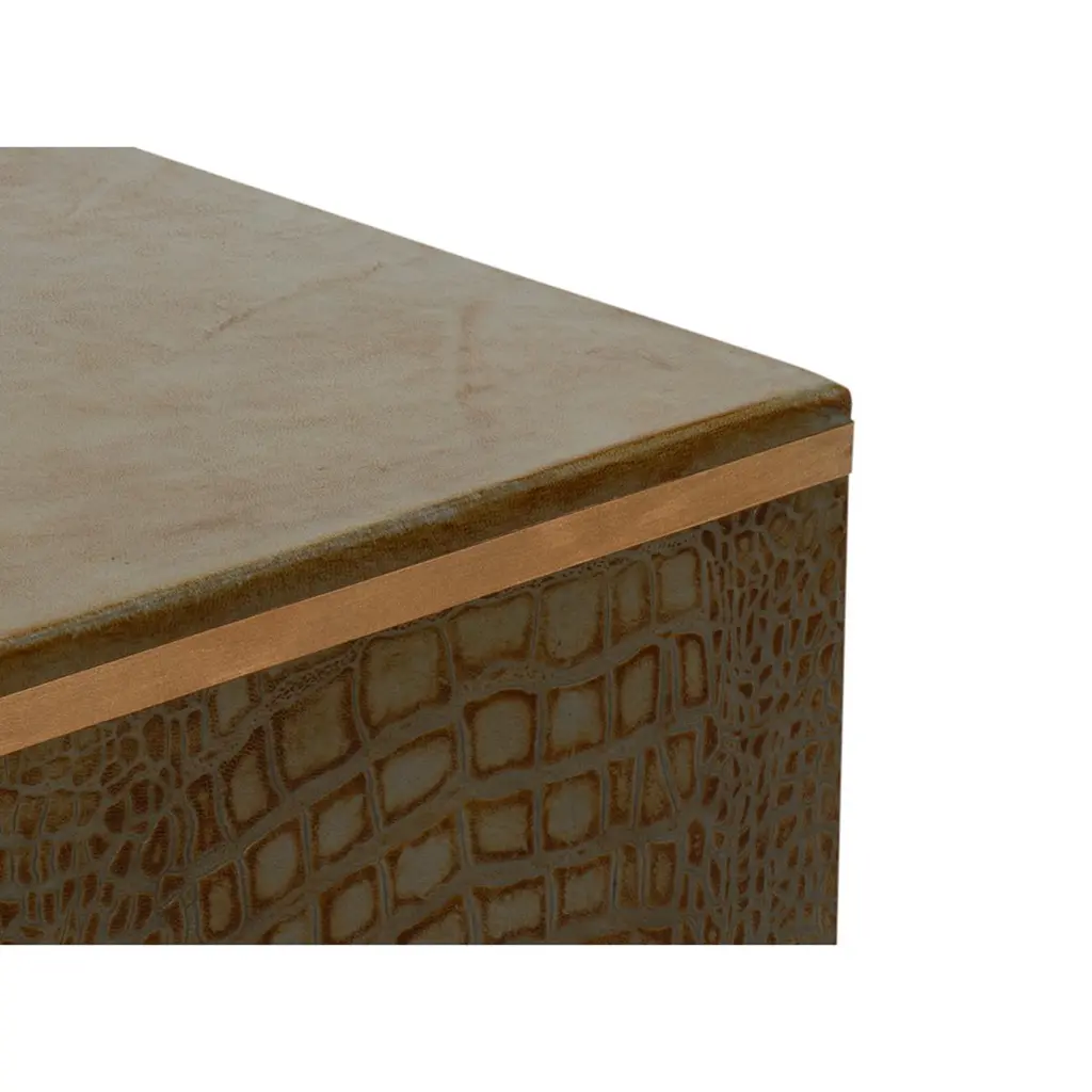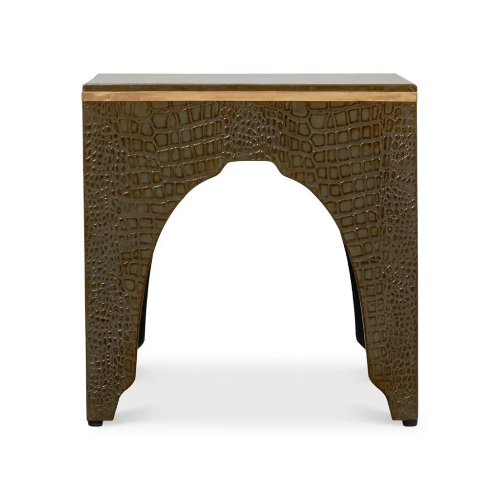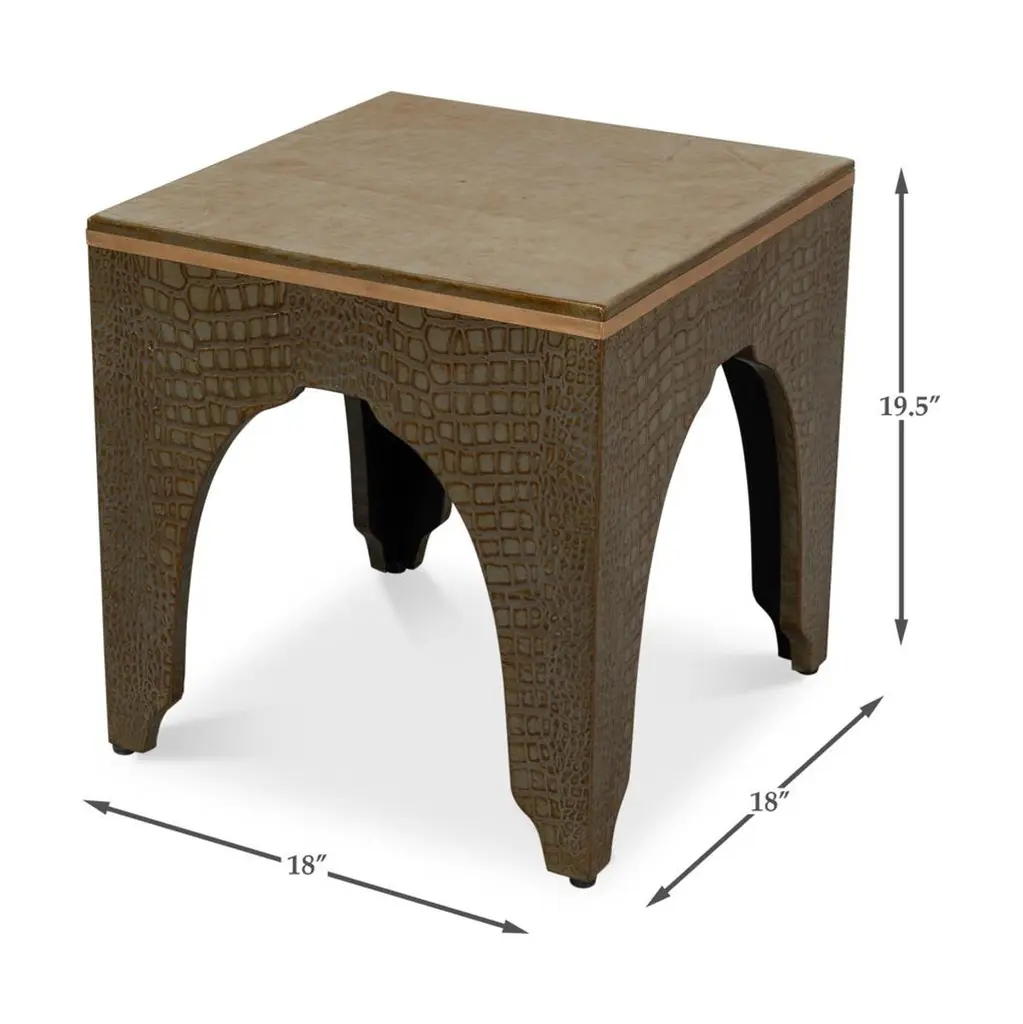 A testament to timeless elegance and luxury. Wrapped in sumptuous leather with a green embossed croc finish, this dark antique green stool exudes a refined charm that elevates any interior space.Its sophisticated design, reflecting the grandeur of the Art Deco style, serves as an eye-catching accent piece, seamlessly blending with various decor themes.Dimensions: 18" W x 18" D x 19.5" H