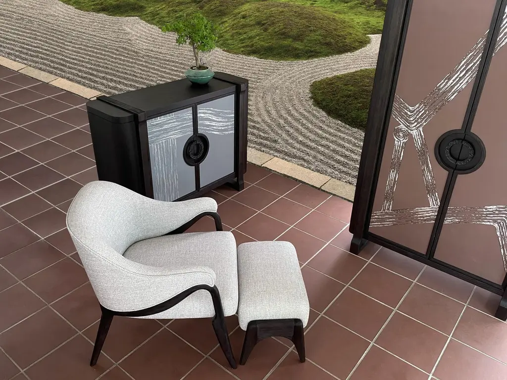 designed to compliment our range of armchairs, the foot rest is created with a purist form evokes the essence of japanese aesthetics. its solid ash hand-crafted framework, highlighted with an arch form, is also a statement of craftsmanship.