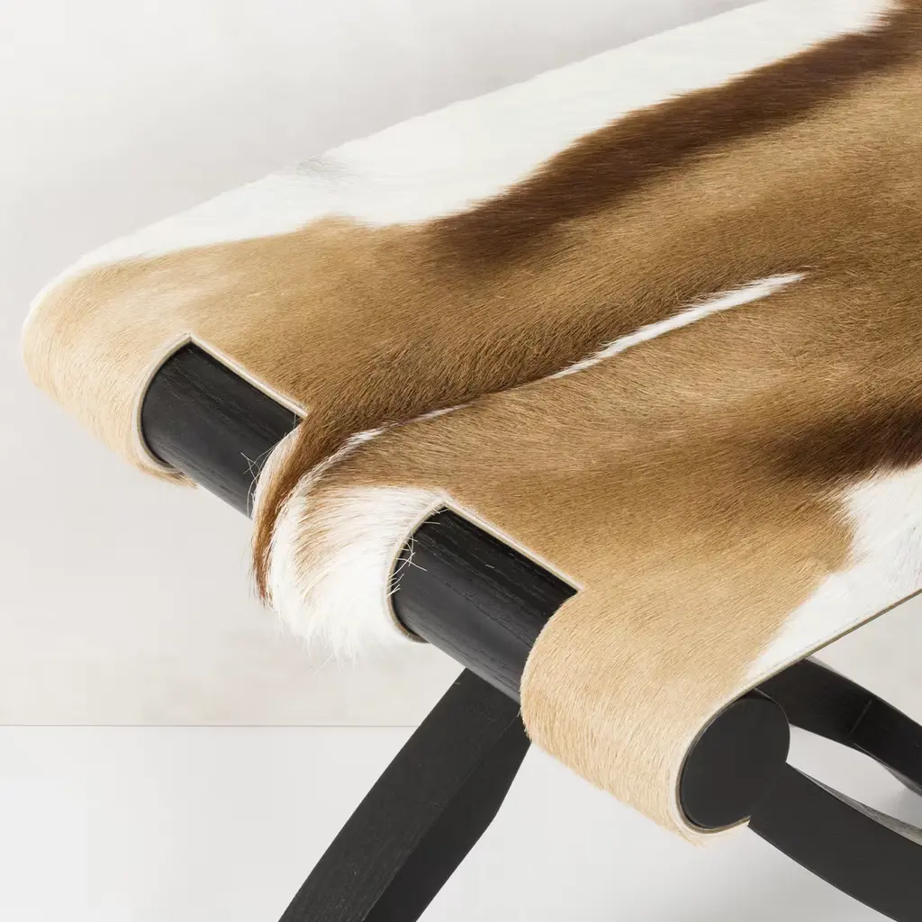 Perfect for holding luggage with its sturdy oak wood frame, this folding stool doubles up as elegant stool in a country-chic and eclectic home. This superb accessory epitomizes function and elegance through the use of graceful, curved lines and luxurious materials. Featured in a natural finish with brass hardware, the seat is fashioned of springbok leather, whose pattern may slightly vary from the one in the picture. Available also with walnut and wengé finish.