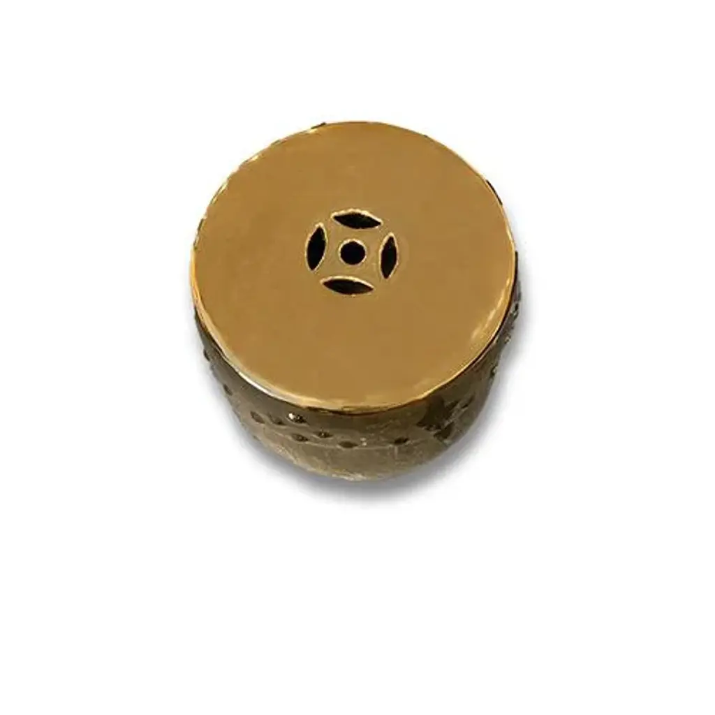 Golden garden stool with a glossy finish. Great for the backyard and indoors a great piece to brighten up a room. No maker marked. Smooth texture.