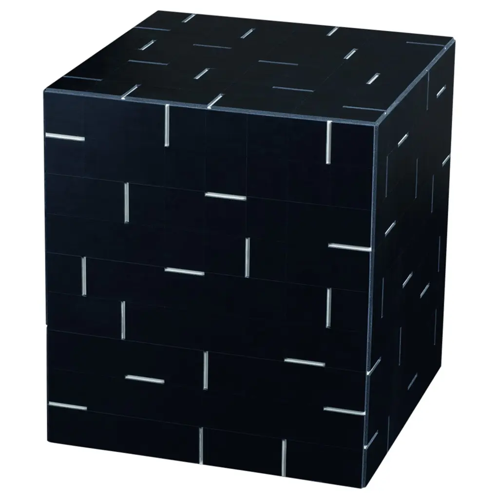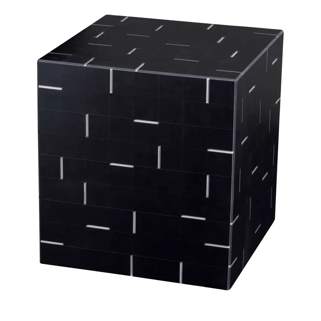 This exclusive stool is completely crafted of the finest saddle leather in a rich black color with subtle white grooves in a pattern that is reminiscent of the video games graphic of the late 1970s. This comfortable and versatile piece will offer a unique accent beside a sofa, arranged with books and decorative objects, or additional seating in a living room or office, thanks to the hidden casters that allow easy positioning. Suitable in any decor, this streamlined piece designed by Stephane Parmentier strikes a harmonious balance between understated glamour and functional design.