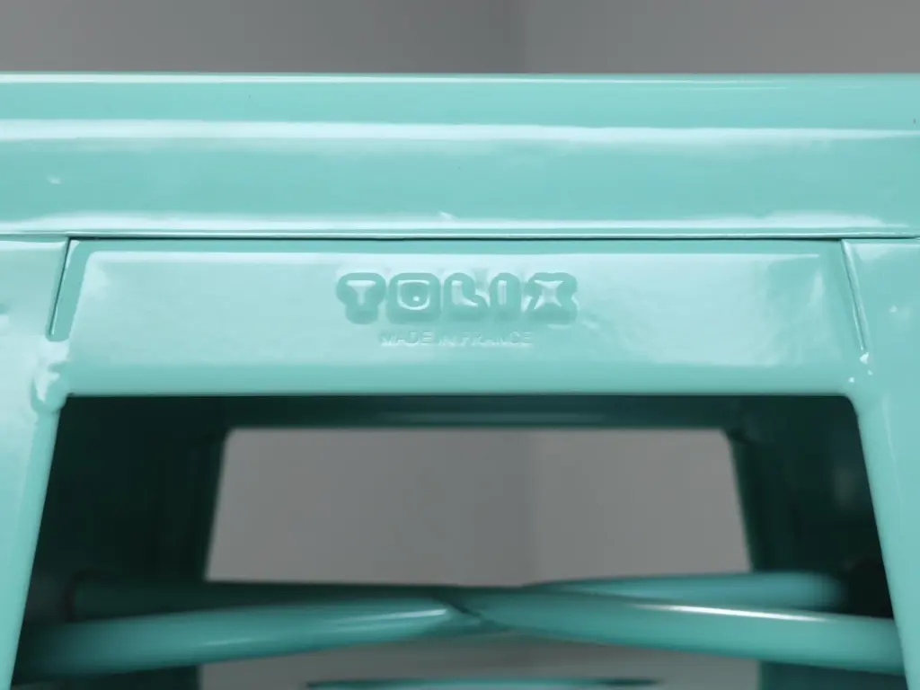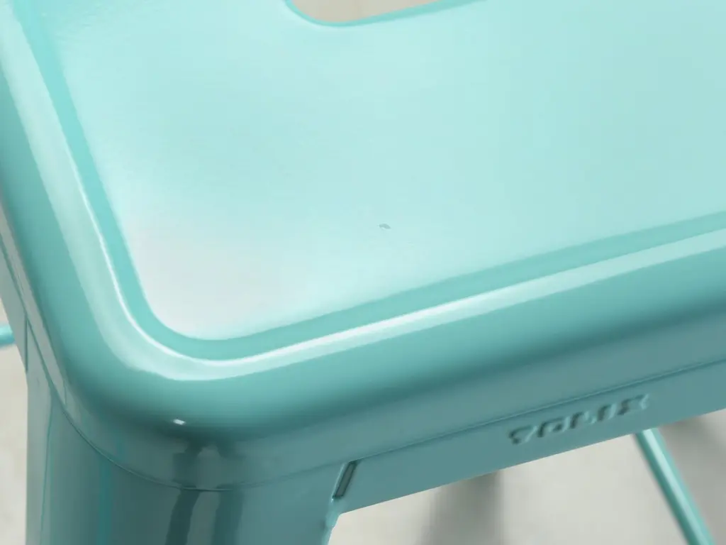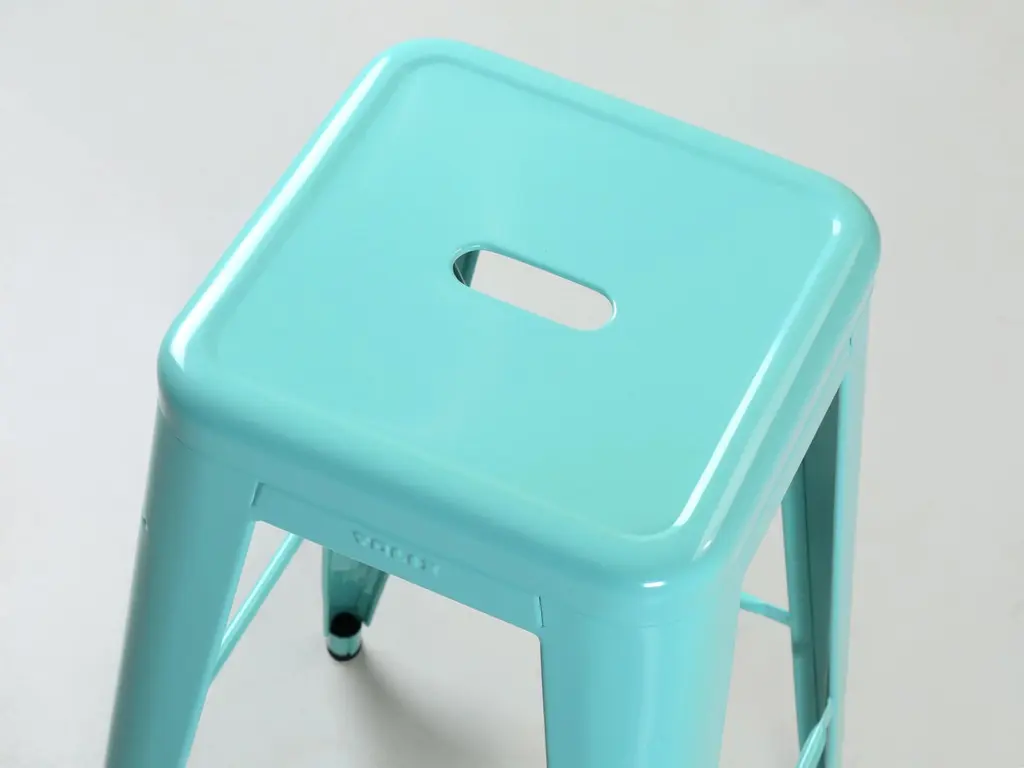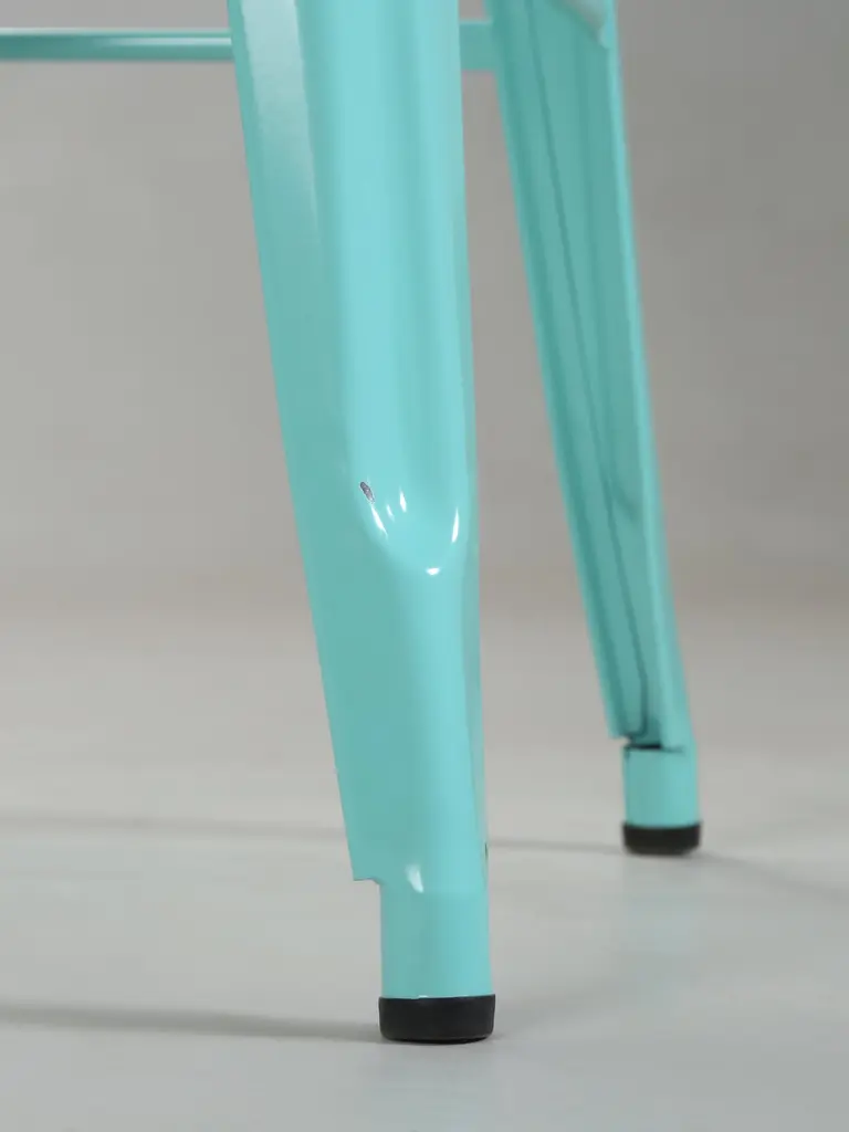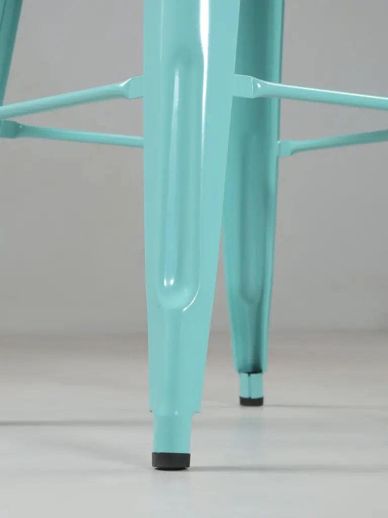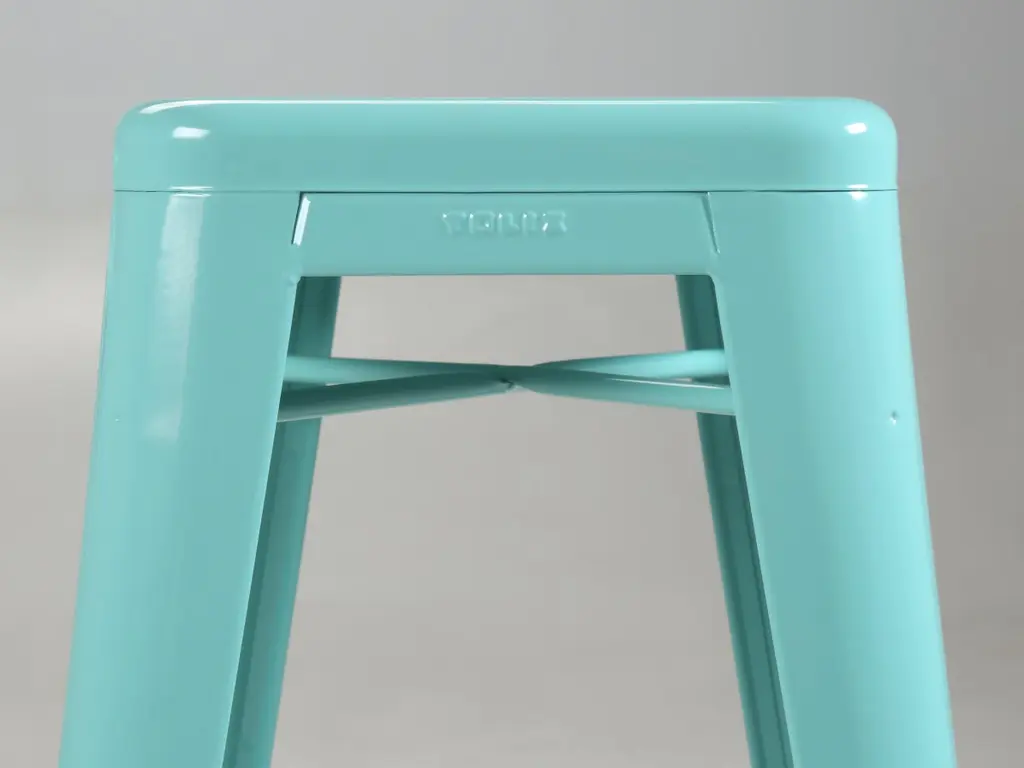 Authentic Tolix Set of (4) Light Green (we think more or an Aqua is appropriate) Powder-Coated Steel Stacking H75 Bar Height Stools. Tolix Color spec is, RAL 6027. The seat height is 29.5", which is ideal for our standard 42" high bar and not for your typical kitchen counter height stool. We currently have over 400-remaining Authentic Made in France Tolis in stock, including Tolix Chairs, Tolix Stools in 3-different heights and even some Tolix Tables. In addition, we do have a few set left of Vintage Tolix Dining Chairs. There are two scuffs on different seats, images 6 and 7. They are so light, you can barely see them. There is one scuff on a leg, image 11.Length and depth provided were measured at the feet. The seats are 12" by 12"