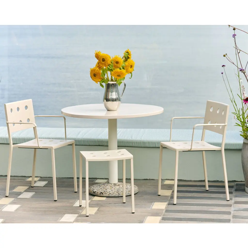 HAY's Balcony stool is part of a clever collection of outdoor furniture designed by the Bouroullec brothers. Made of thin steel sheets, the elegant Balcony seats are incomparably light and easy to move, and they can also be stacked on top of each other to save space – a perfect addition to the balcony, garden or patio. Featuring a weather-resistant coating the Balcony collection is as carefree as it looks. The round holes pressed through the steel plate provide multiple functions: they add character and softness to the geometrical design and allow rainwater to drain off the chair's surface, while also strengthening the structure of the furniture.