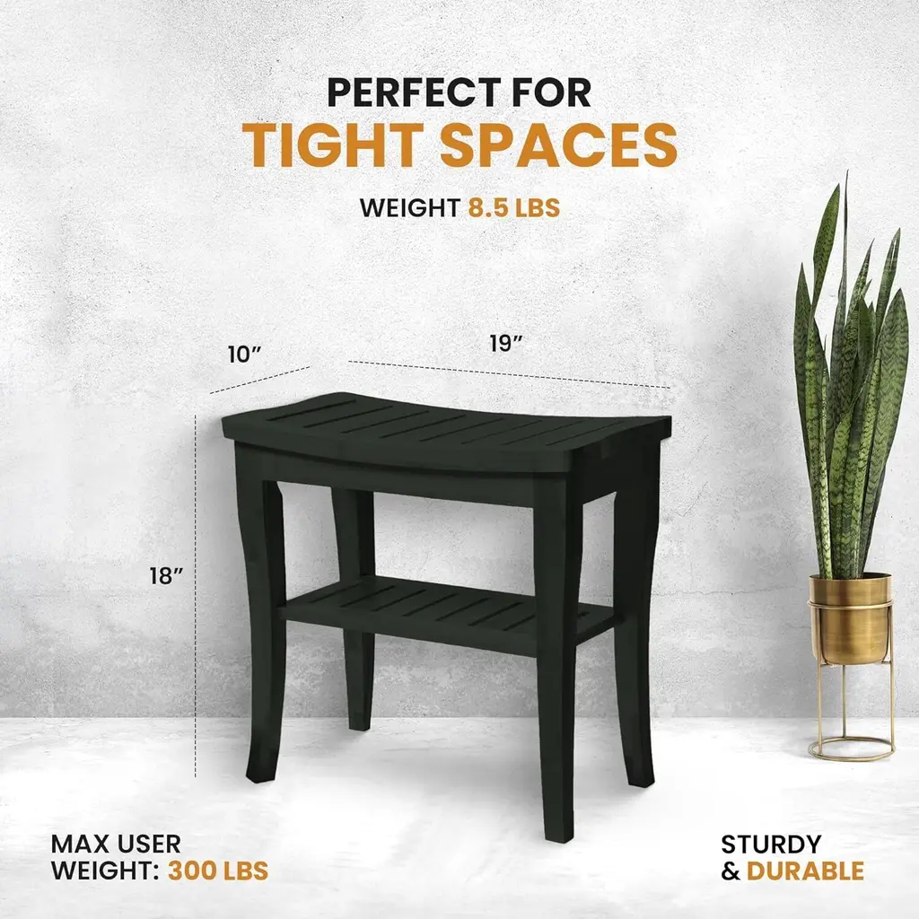 Bamboo Shower Bench Spa Stool - Wood 2-Tier Seat. You need a nice-looking surface to support yourself and your hygiene products. It’s a perch to sit on while cleaning or toweling off, with the concave curve making it extra comfortable and safe. The underneath shelf is there for extra space. It will fit pretty much anywhere, because of the compact size.