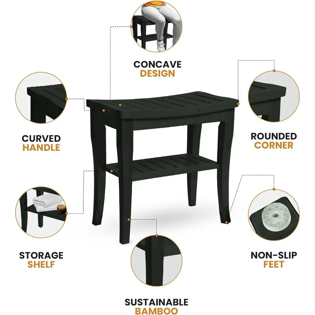 Bamboo Shower Stool Bench With Storage Shelf (Black) - Black - Black