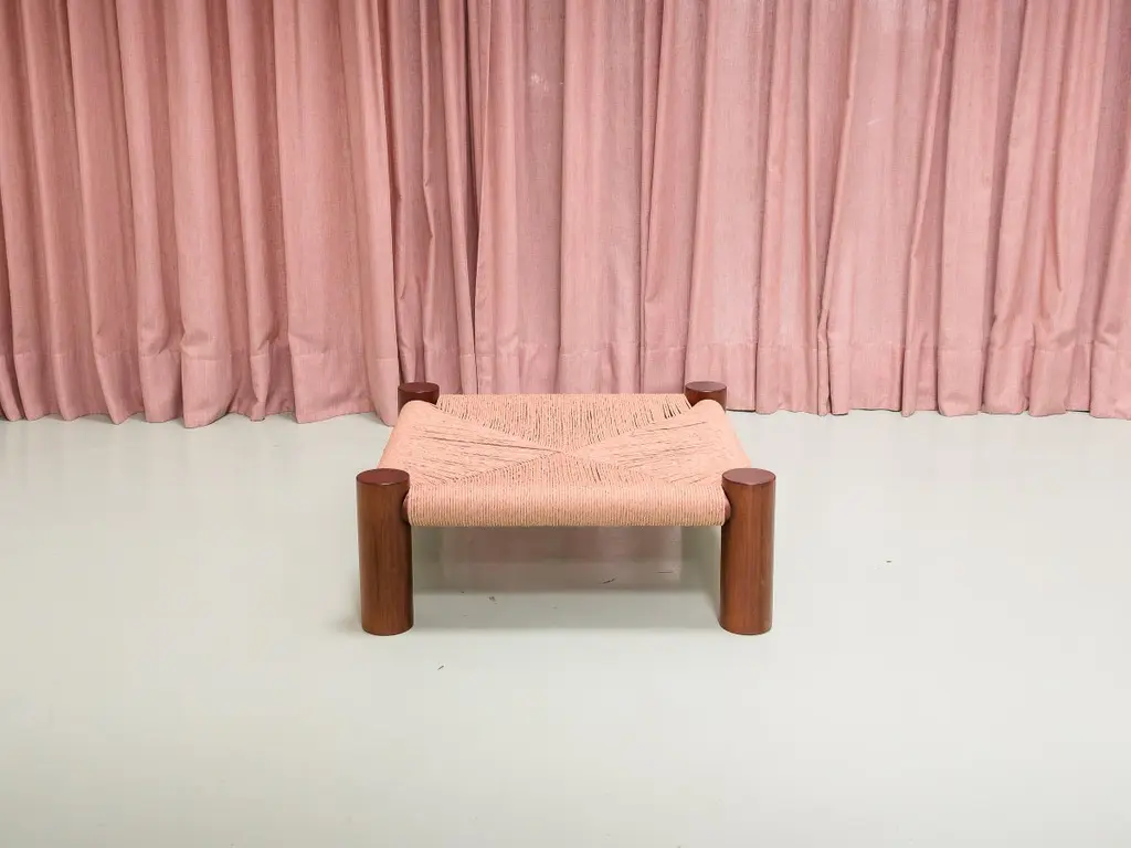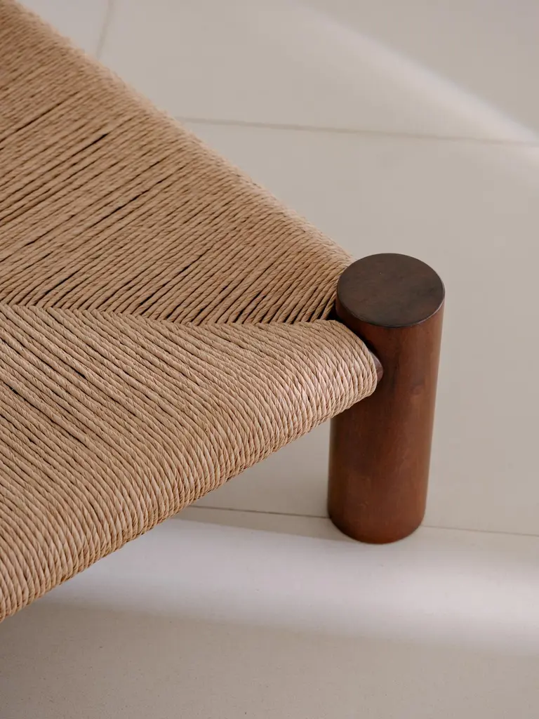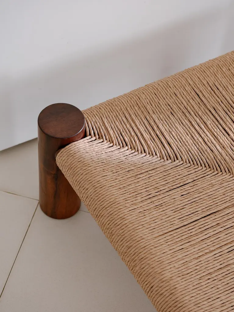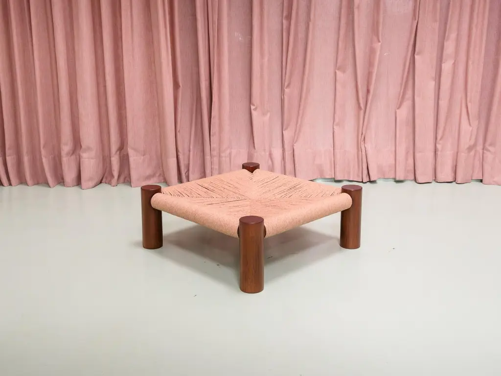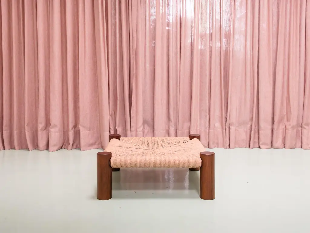 Designed by Mexican architect Aurelio Martinez Flores, the Banco Guarujá (1972) distills the essence of his work: minimalist lines, carefully studied proportions, and a formal clarity achieved through the use of just eight cylindrical rods. The result is a piece that reflects the purity and lightness characteristic of Aurelio’s creations.Relaunched in 2024 by Galeria Apartamento 61, this first edition of the Banco Guarujá faithfully follows the original specifications. This version is handcrafted from solid canela wood with a natural finish, with precise carpentry work ensuring the same proportions as the 1972 model. Individually numbered, every piece is completed with a handwoven kraft paper seat featuring geometric patterns, just as Martinez Flores originally envisioned.Although originally conceived as a stool, the Banco Guarujá also functions beautifully as a side table or sculptural catchall. With its generous dimensions and striking presence, it serves equally well as a functional object or a centerpiece in a room.Historically, the Banco Guarujá was produced in very limited numbers, appearing in select architectural projects by the designer, such as the Zaragoza Residence in Guarujá (1972) and the Instituto Moreira Salles headquarters in Poços de Caldas (1992), where a version with a leather seat was used.Shipping is complimentary to the continental United States and Europe.