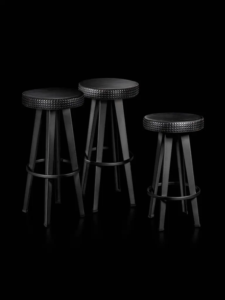 "Bar Stud" is a stool, designed by Diesel Creative Team and manufactured by Moroso, featuring a wooden seat with fire retardant polyurethane foam only covered by black leather with brand, studs, or both, base in steel with raw black finish and glides in polypropylene.Indoor use only.DIMENSIONS:Ø 13.8", H. 24.8"MOROSO, with DIESEL, has created a collection of products with a relaxed and comfortable mood, taking its inspiration from an informal lifestyle concept and targeting consumers who like simple shapes yet at the same time seek a “modern” style made up of high quality combined with a distinctive design of pure lines.“We worked with the Diesel creative team to develop an interesting and alternative collection idea which was to represent two different yet coexisting aspects of certain contemporary trends: one which is darker in tone, inspired by the underground world and with a more aggressive and enigmatic aesthetic, and the other lighter, inspired by nature and a visual radiance, with soft and welcoming shapes”, explained Patrizia Moroso who always follows all the phases of every design project personally.