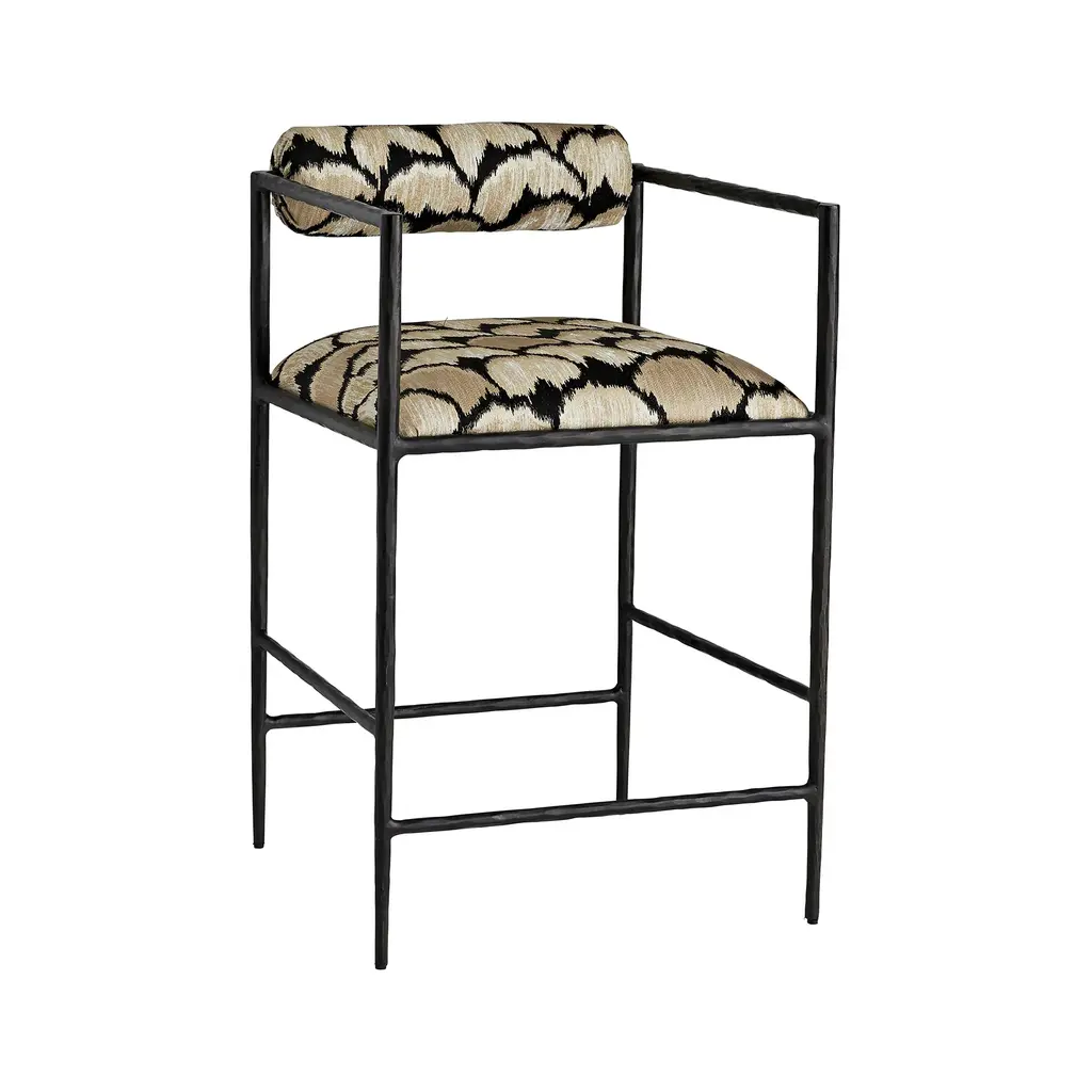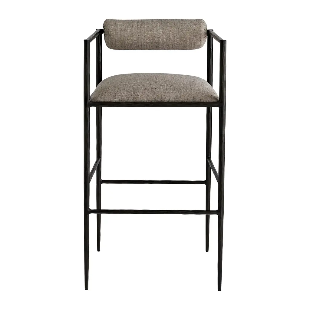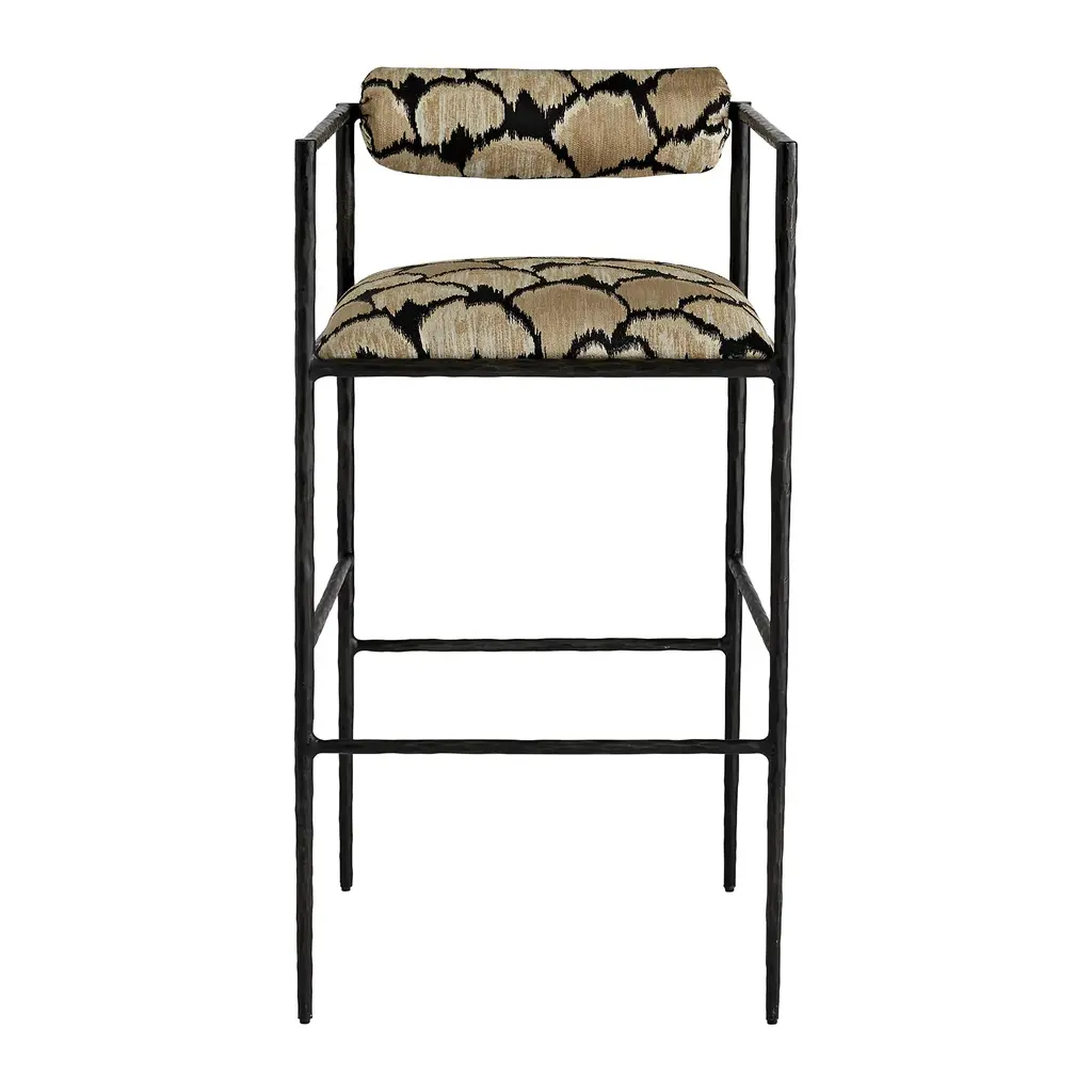 Elevate your interiors with the Barbana Stool from Arteriors. Hand-forged from natural iron, its delicate legs and angular frame exude elegance, while the embroidered upholstery adds a touch of luxury. The tight seat and bolster back cushion provide comfort, making this stool the perfect addition to your kitchen counter or high-top dining space. Highlights