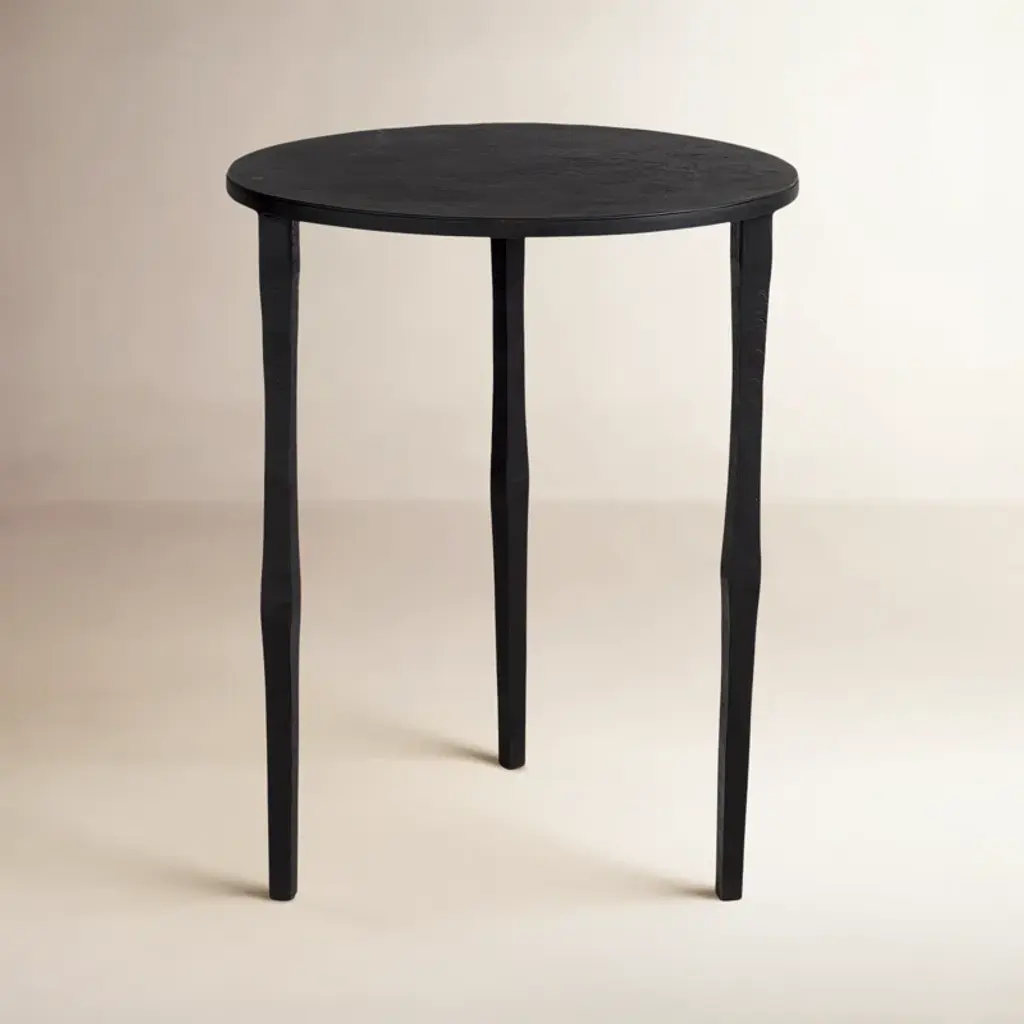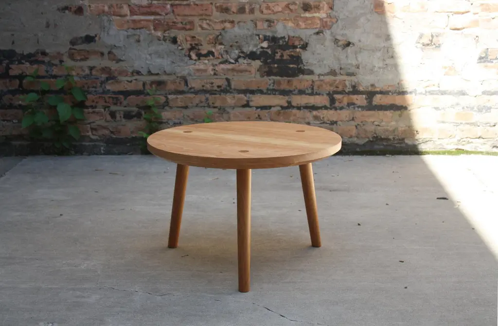 Shown in ebonized walnut and natural cherryThis solid wood side table features hand-turned, tapered legs joined to a simple, under-beveled round top with wedged through tenon joinery. Simplicity in design and construction emphasizes wood grain and joinery.Available in custom finishes and sizing (up to 42” diameter)Measures: 15" diameter top x 17.5" tall.