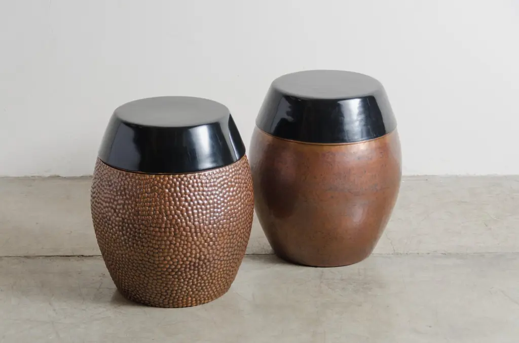 Barrel storage drumstoolAntique copperBlack lacquerHand repousseLimited editionEach piece is individually crafted and is unique.Repousse´ is the traditional art of hand-hammering decorative relief onto sheet metal. The technique originated around 800 BC between Asia and Europe and in Chinese historical context, it began early as the Han Dynasty (206BC-AD220). The technique involves using a hammer and various shaping tools.Lacquer is a technique that dates back to the Shang dynasty, circa 1600-1100 B.C. These pieces are made with at least 60 coats of organic lacquer. Each layer of lacquer is applied with a curing period of 24 hours in between so that it can dry.