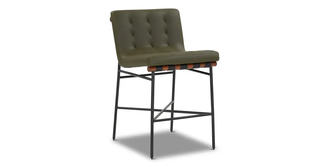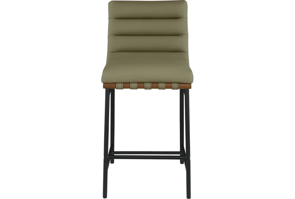 Introducing the Barten Green Vegan Leather Fabric Upholstered 37" Counterstool, a perfect blend of style and comfort for your dining room or kitchen. This modern counterstool features a chic green vegan leather fabric that adds a touch of sophistication to any space. The sturdy black iron leg frame provides excellent support, while the walnut wood accents add a warm, natural touch. Designed with a tall, armless profile, this counterstool offers a sleek and contemporary look that complements various decor styles.