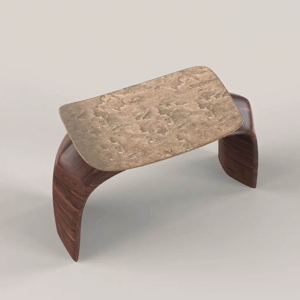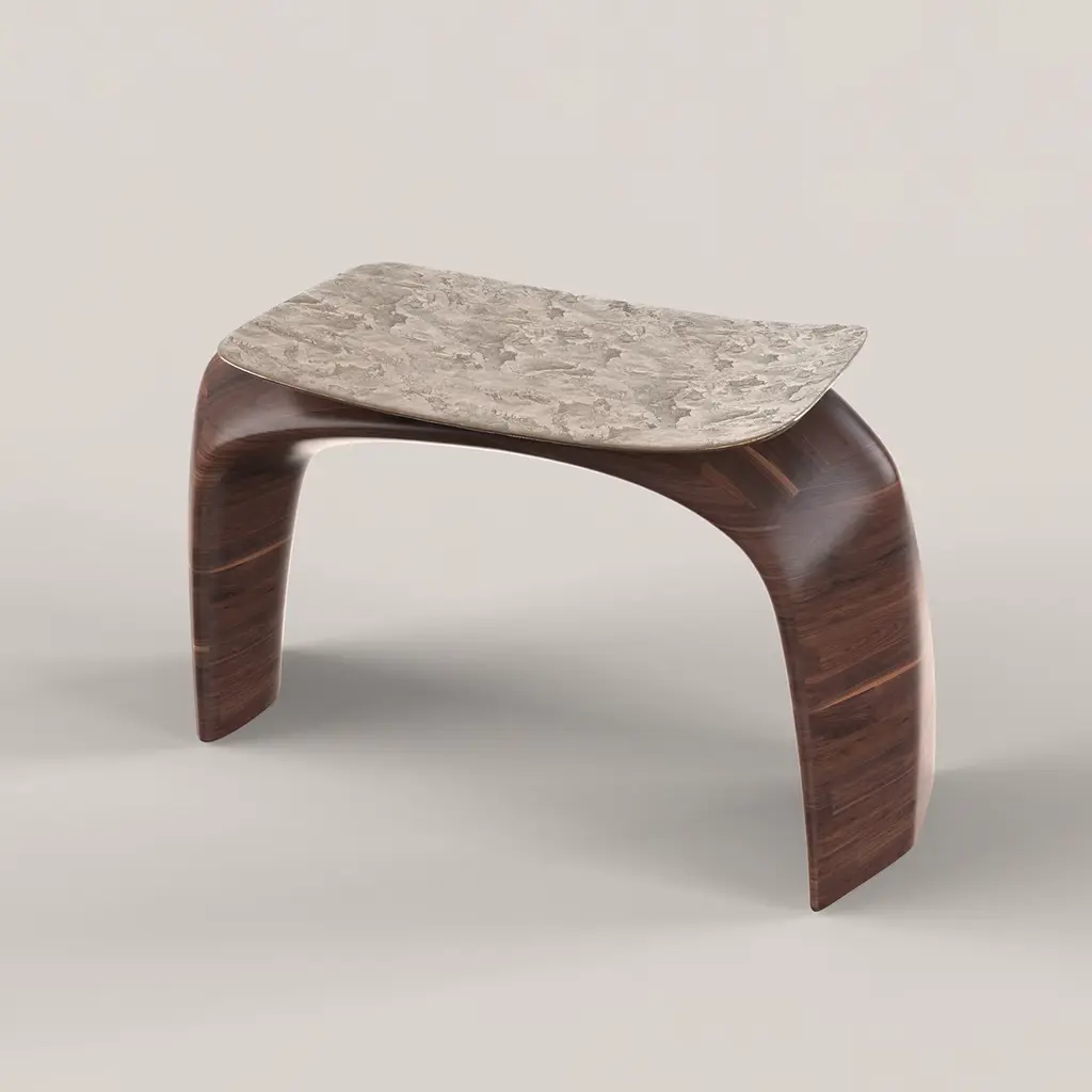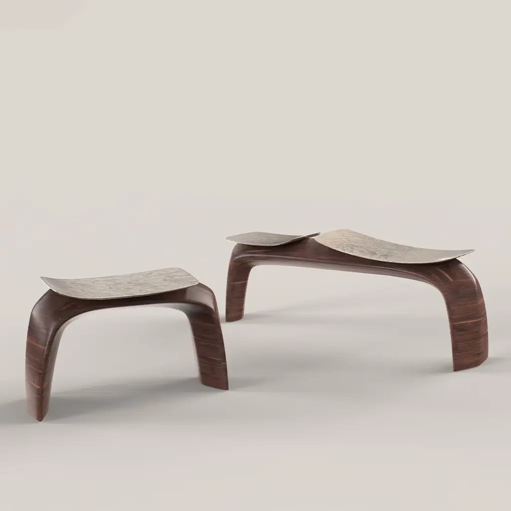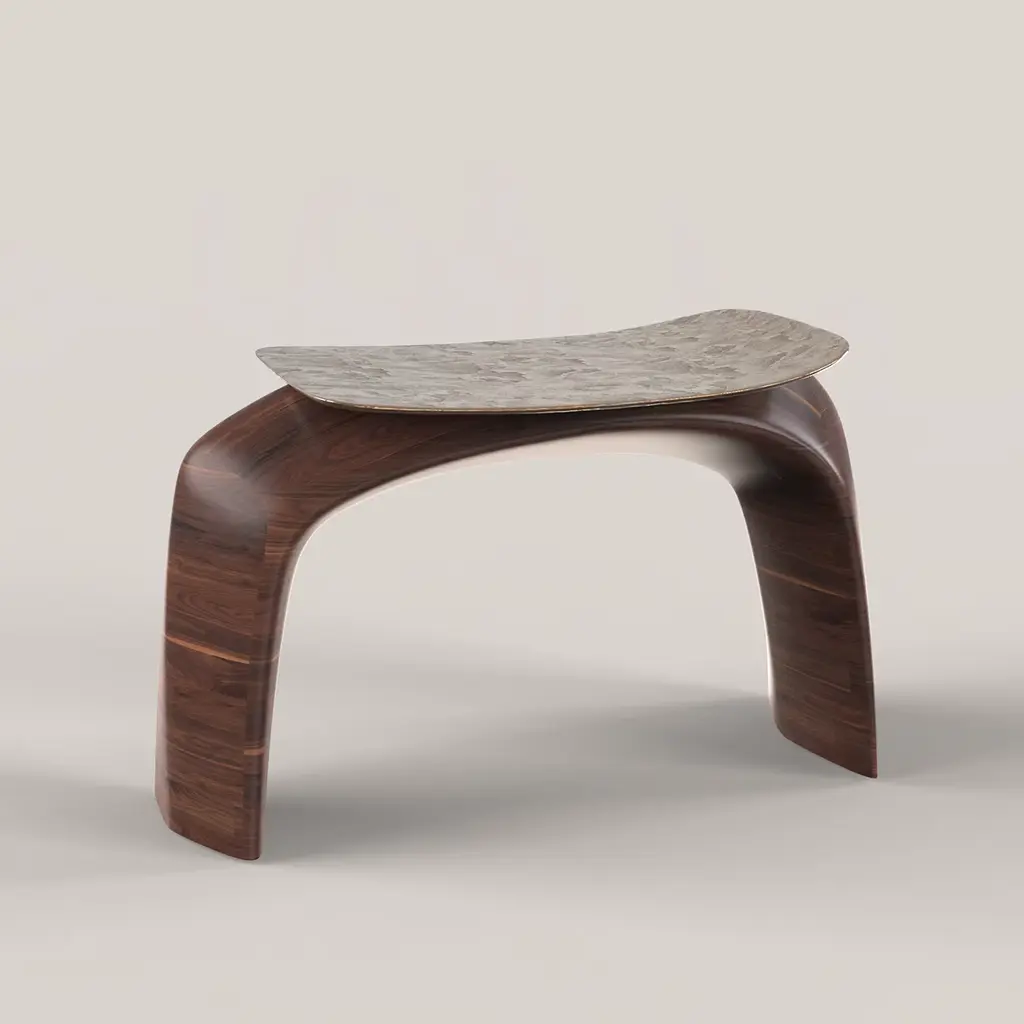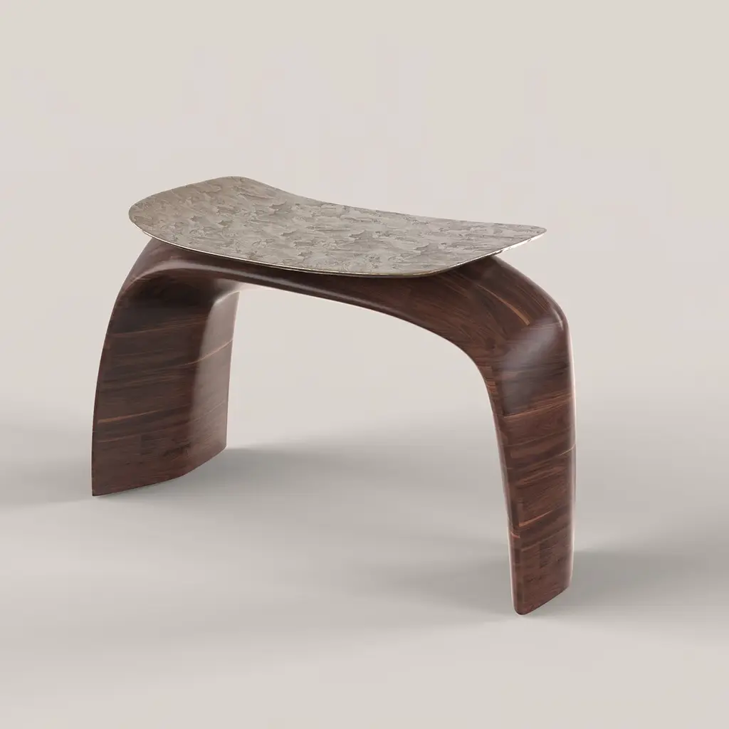 Bayou is a sculptural stool that blends solid wood and cast bronze in a harmonious design. The wood is shaped into an elegant arc with soft yet firm lines, forming the stool's structure. The cast bronze seat, defined by sharp lines, rests delicately on the wooden frame. Limited edition of 150, each with a numbered metal plaque for authenticity. Customization options are available, please contact the concierge for more information.