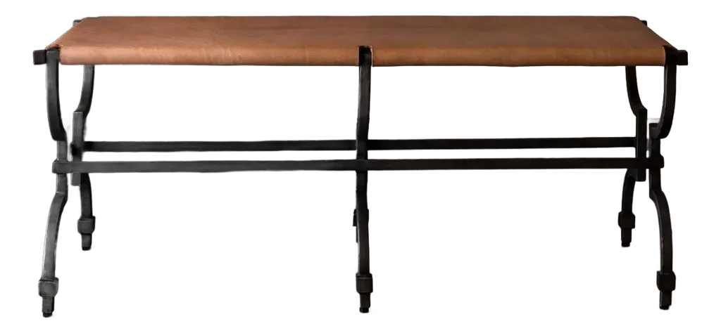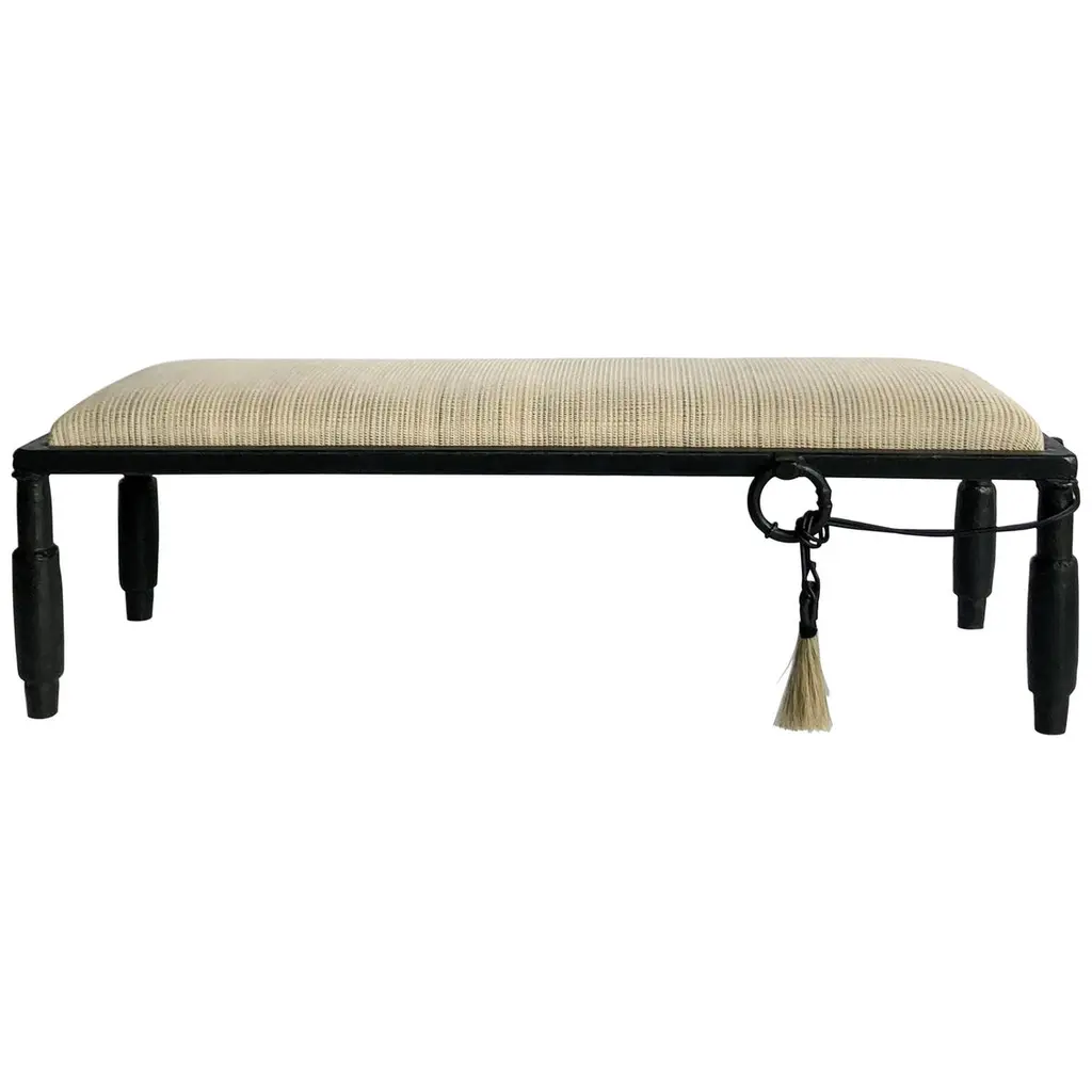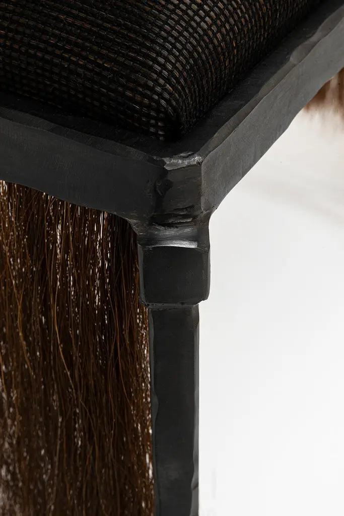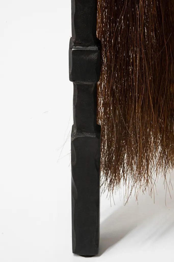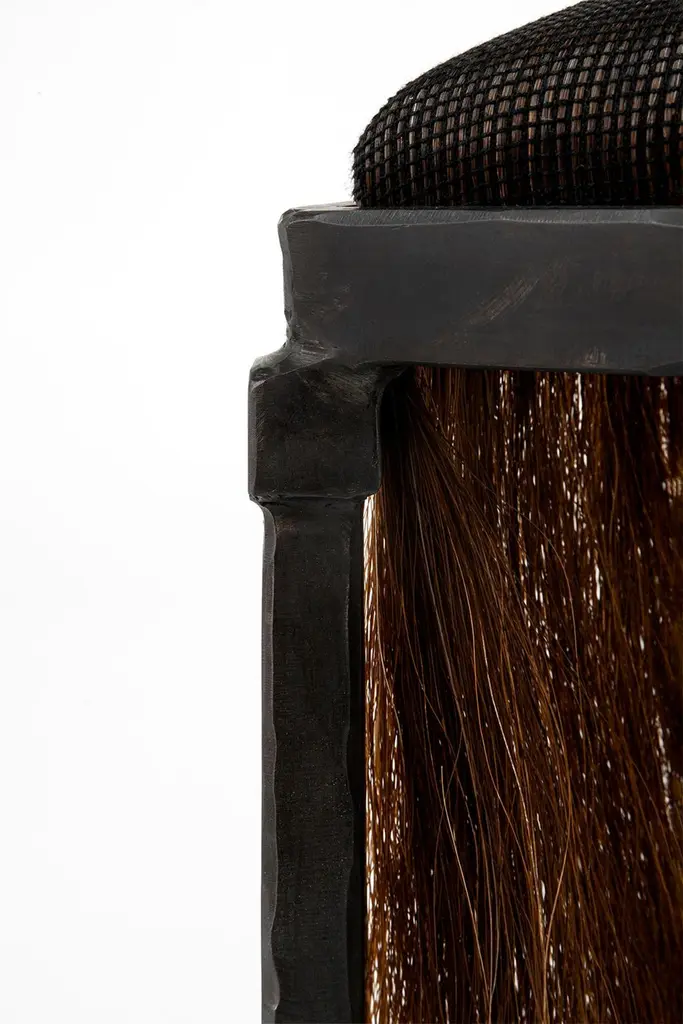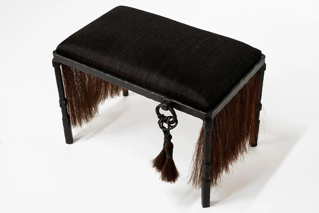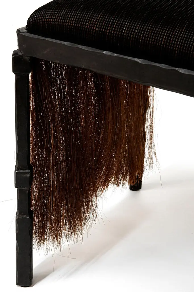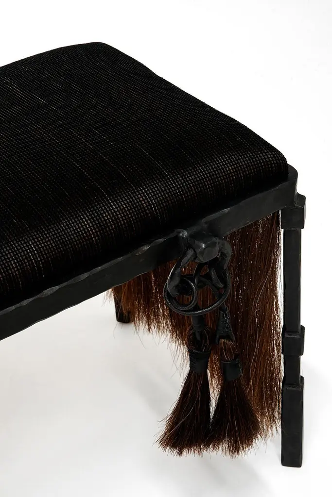 HORSE HAIR BENCH NO. 3 J.M. SzymanskiD. 2022Contemporary furniture at its finest. Horsehair textile and blackened iron are combined to create an exciting juxtaposition of elements. Available in creme, brown, and black. Custom sizes available. Made in the Bronx, New York, USA.Our products are fabricated and finished by hand, so variations in size, shape, and patina color are a natural result of this process. Tooling marks and surface scratches are part of the character of many finished pieces. All products are sealed with oil and wax, which, over time, are not impervious to moisture. Our blackened steel pieces installed outside or in areas exposed to moisture indoors, especially in marine environments, will rust. Condensation from hot and cold drinks will leave rings on blackened steel table tops. Coasters or placemats can protect the finish. Periodic maintenance of blackened steel items may be required.