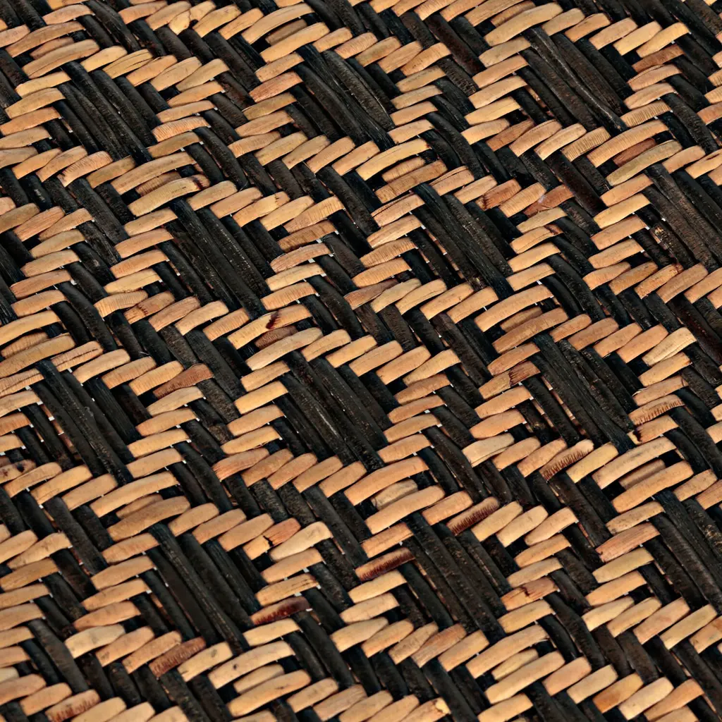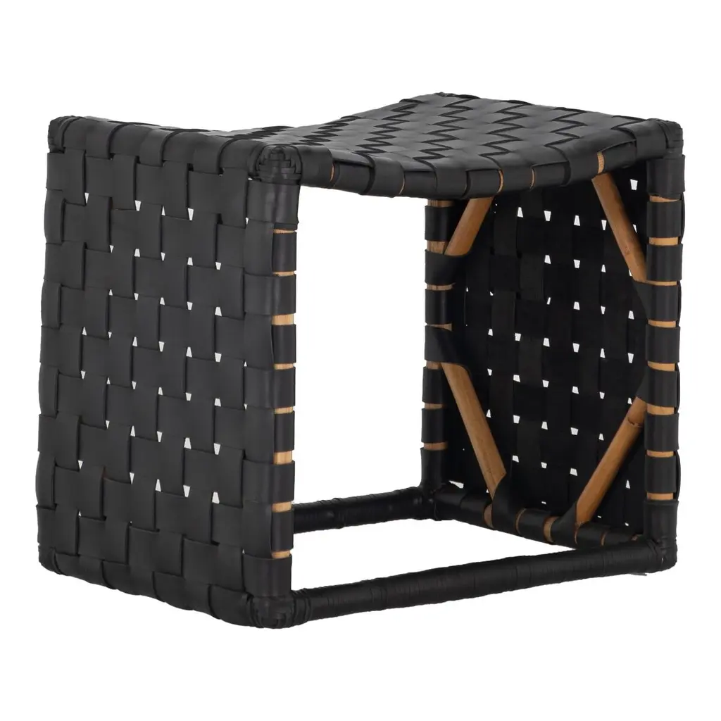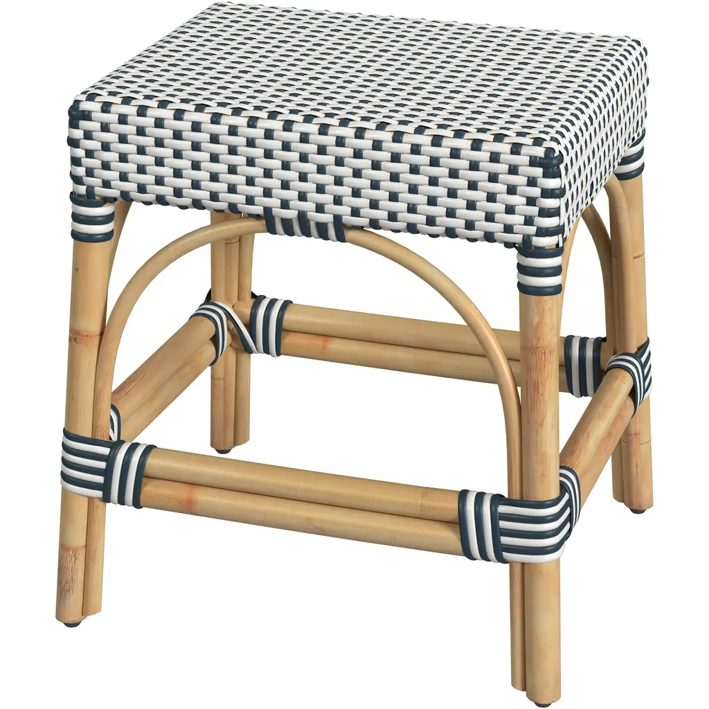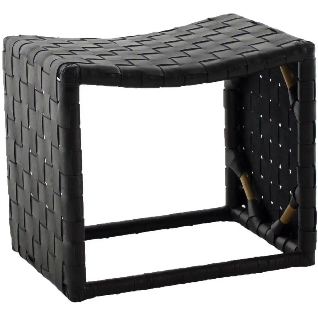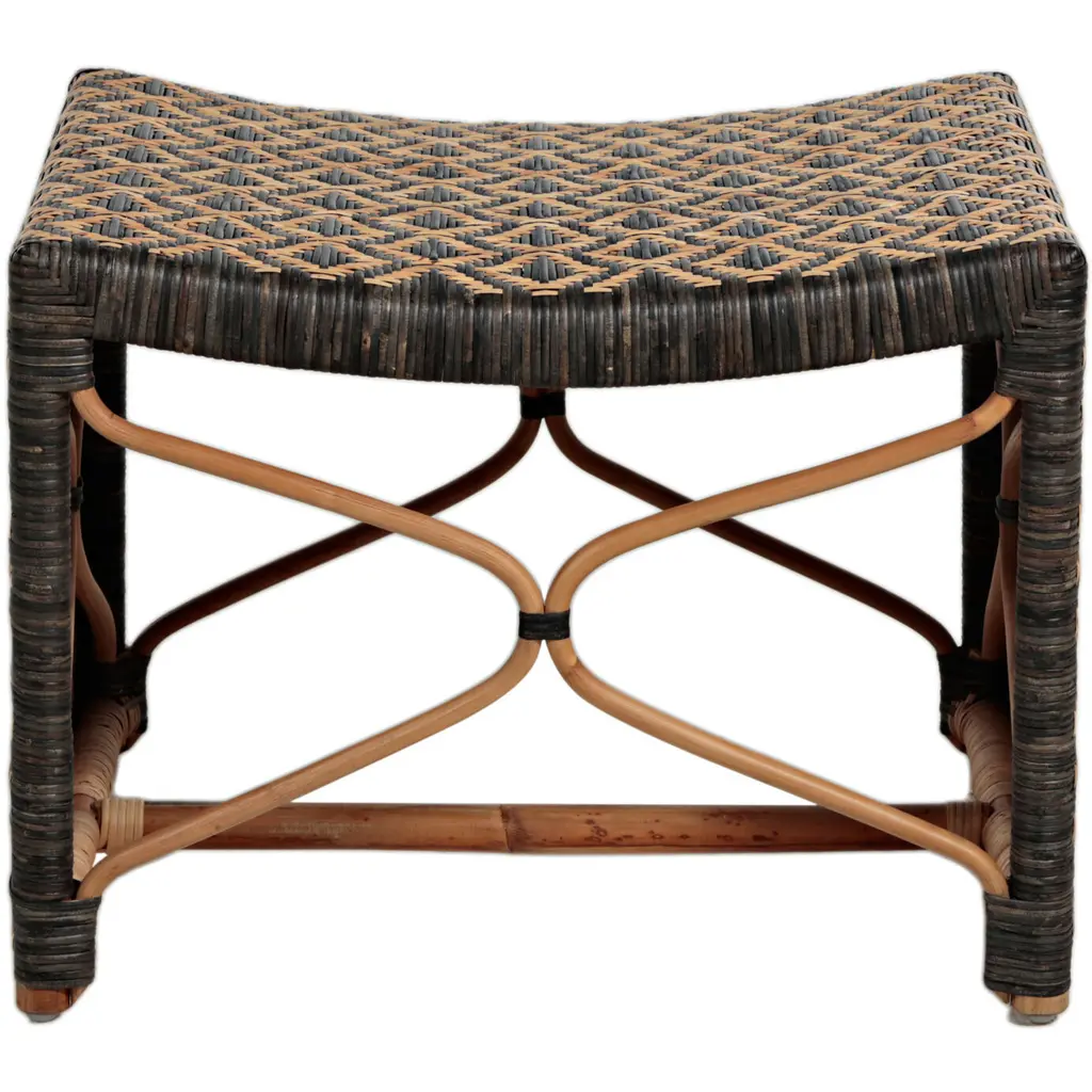 The Bennet Stool features a graceful waterfall silhouette crafted from two-tone handwoven rattan, creating a captivating intertwined diamond pattern. The ecofriendly and contrasting black and natural rattan enhances the stool's visual appeal, while the frame is supported by two curved X-shaped stretchers held together by a black binding, providing both style and stability. As rattan is a natural material, expect unique variations that add to the charm and character of this exquisite piece, perfect for any living space. The Bennet Stool is not only a beautifully artisanal crafted addition to your home but also a sustainable choice, perfect for those who value both aesthetics and environmental responsibility. Ideal for dining rooms or as a statement piece in any room.