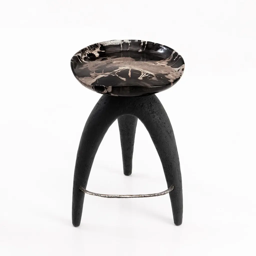 The ‘Bermuda Triangle’ sculptural stool features a solid hand-carved petrified wood saddle seat, perched upon an organic shaped tripod base made from lava stone composite. Petrified wood is created from fossilised trees transformed into stone by a mineralisation process that occurs underground, over hundreds of millions of years. This rare material features striking colours and motifs created by the mineral formation process, comprised of semi-precious minerals such as quartz, chalendony and jasper.Odditi pieces are handmade to order, unless listed as in stock.Discount: 5-15% off when ordered in multiples. ----------Odditi takes a curious look at the relationship between nature and humanity, exploring our inner and outer landscapes and creating objects that live between the worlds of art and design.