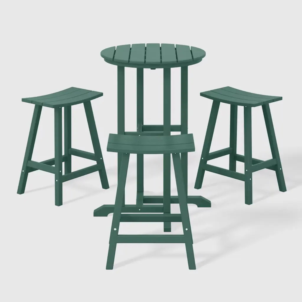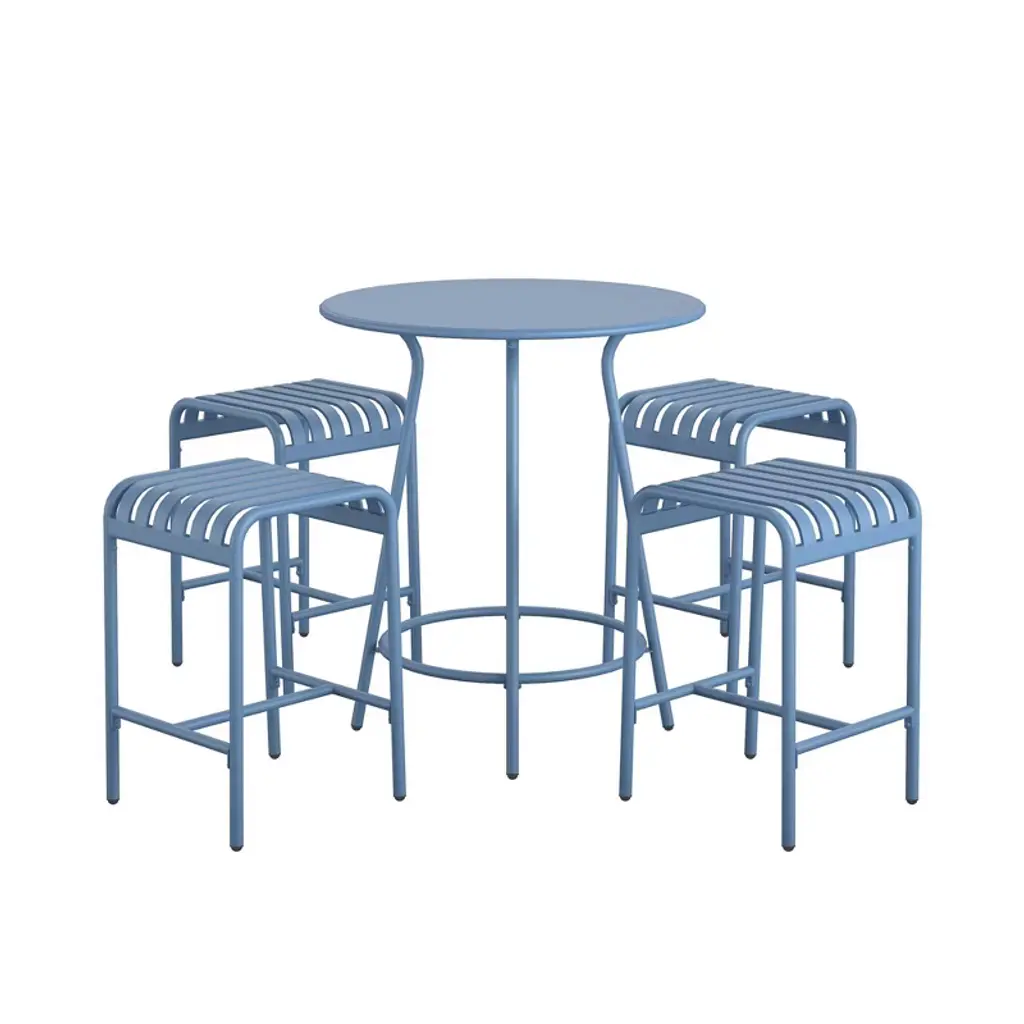 Upgrade your outdoor space with this bar-height 3-piece set, perfect for patios, balconies, or decks. The compact design includes a slatted table and two backless stools, making it an excellent choice for small spaces. Built with a durable, powder-coated steel frame, this set is weather-resistant and designed to endure the elements. The slatted design features built-in drainage for easy cleaning, while thick edges and round tubing add durability and style. Each stool is crafted for stability, supporting up to 240 pounds and featuring a sturdy support bar for comfort. Perfect for casual outdoor dining or entertaining!