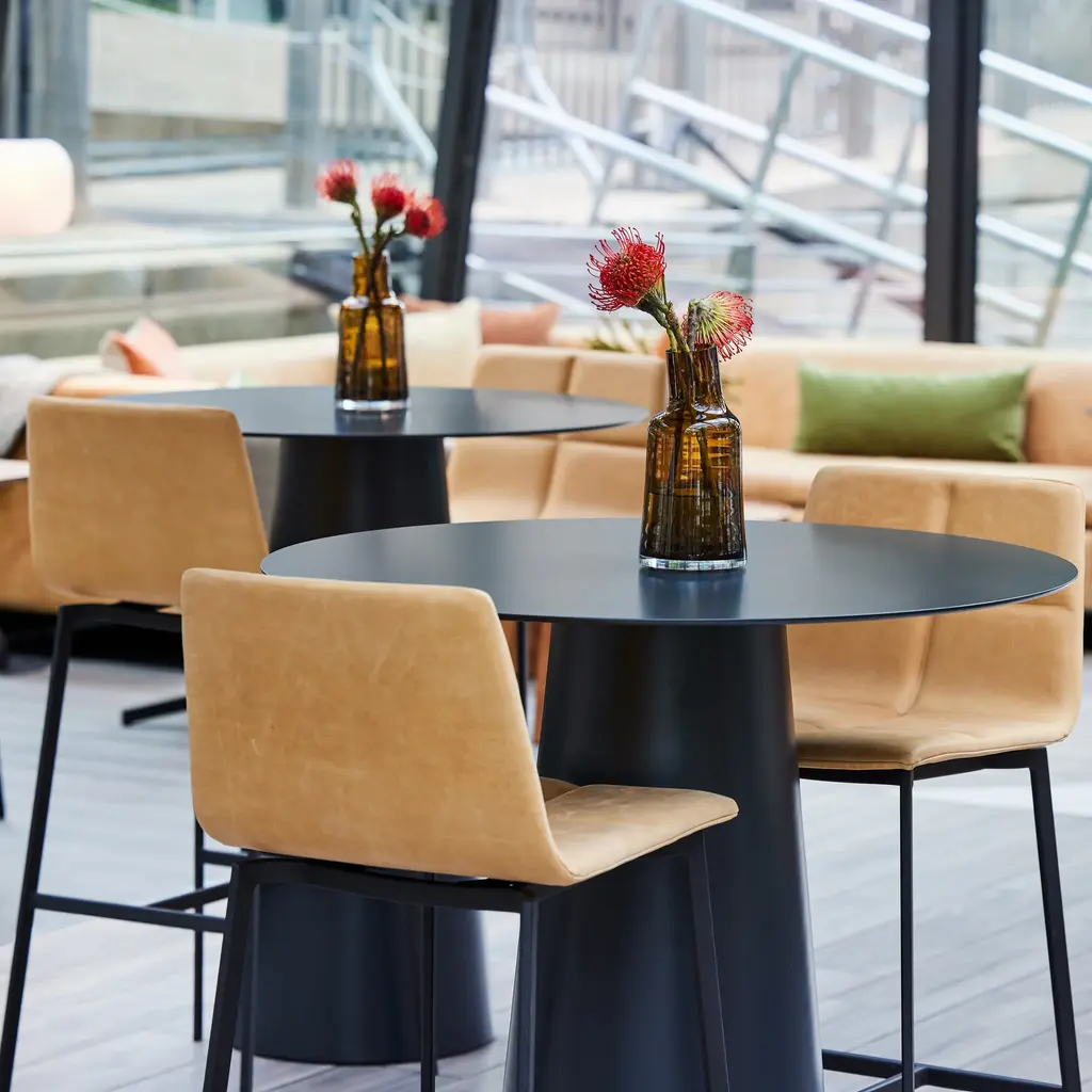 Elevate your seating game with the Between Us Stool from Blu Dot. Its rectangular steel legs add a touch of edginess, while the grid stitched upholstered seat and back provide comfort and subtle texture. Perfect for any setting, this stool is always ready to be of service. The natural leather will develop a beautiful patina over time, making each piece unique. Highlights