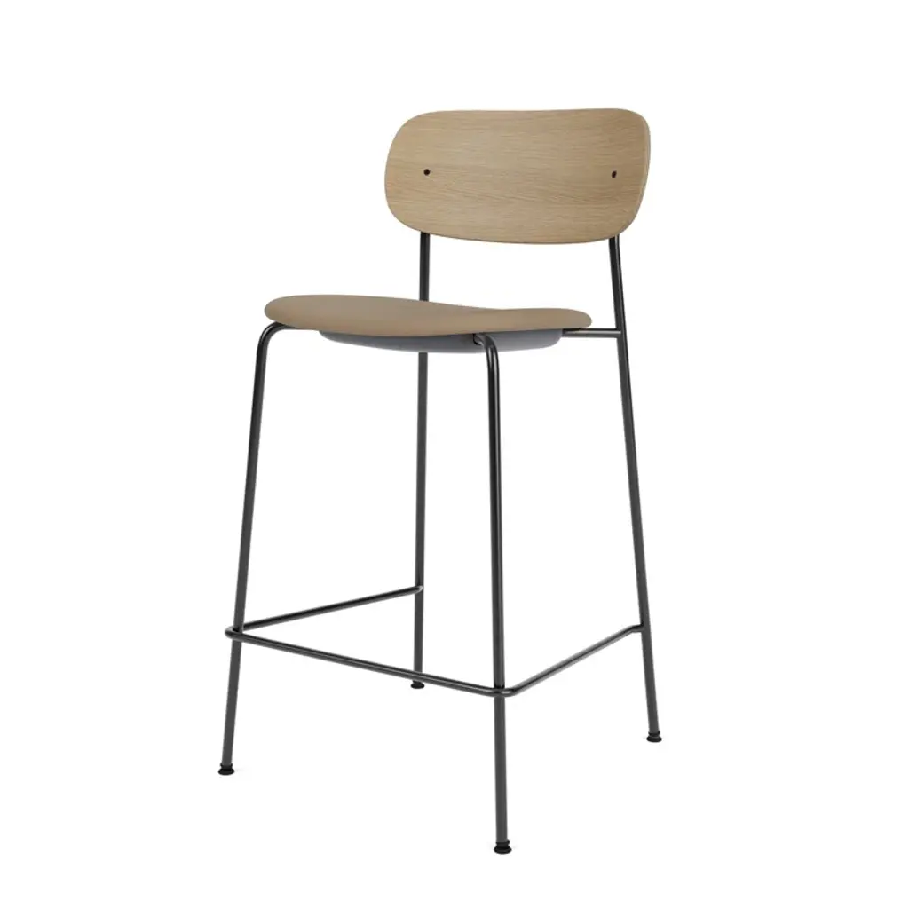 Rectangular steel legs bring a bit of edge and grid-stitched upholstered seat and back lend texture and softness to this seating situation. Reliable in any setting, Between Us is a stool always prepared to be of service.