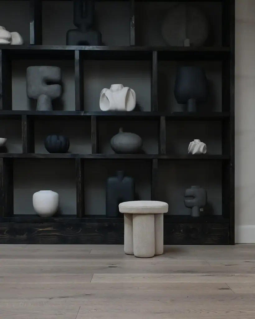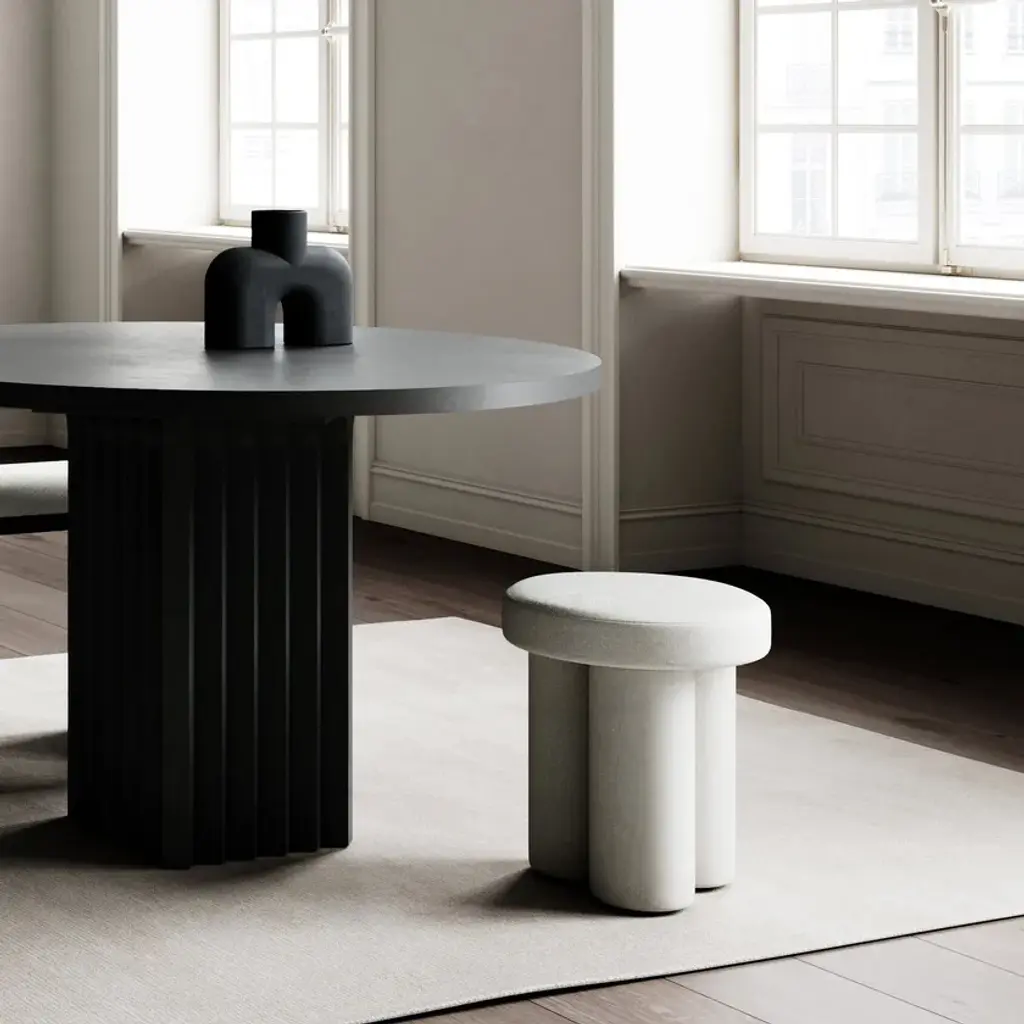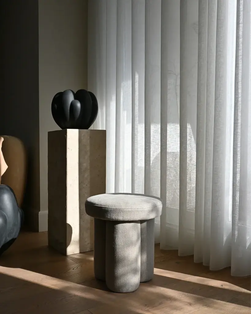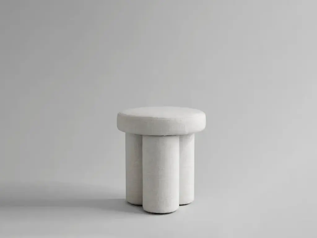 Big Foot is a linen stool.Big Foot with its sculptural and organic shapes the Big Foot Stool is a simple and contemporary stool design, suitable for a wide range of interiors schemes. The simple stool design consists of three circular legs and a round soft seat, all surfaces upholstered with natural sheepskin in color off-white or with a chalk-colored mixed cotton/linen fabric.